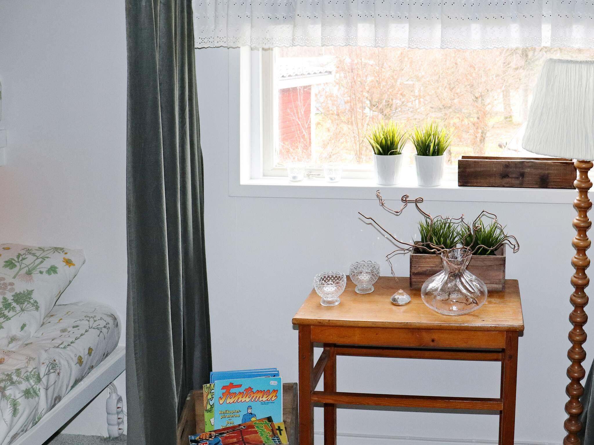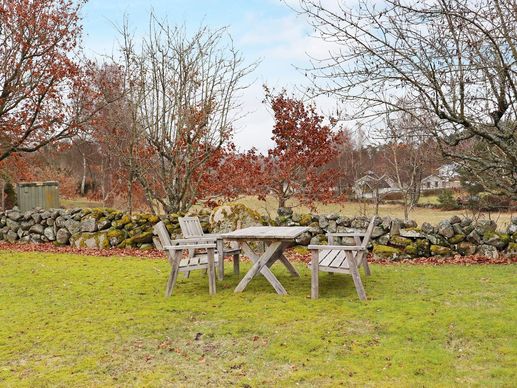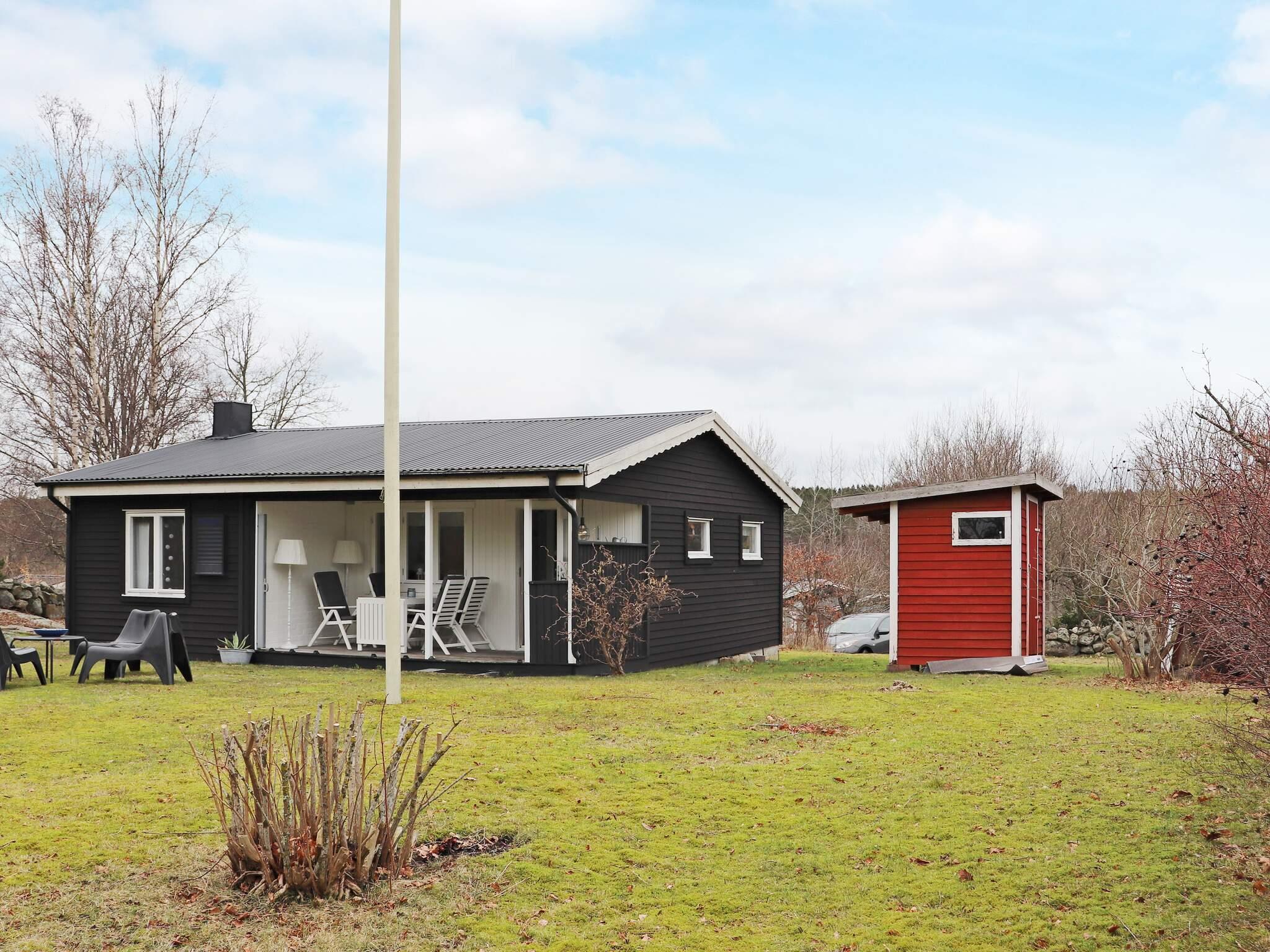 Vid husets entré finns en altan under tak med matbord och grill. Köket har all utrustning ni kan behöva. I husets centrum finns ett vardagsrum med soffgrupp och TV och en matplats. En charmig sovalkov avdelad med väggdel och draperi, rymmer en dubbelsäng. Ett mindre sovrum har en våningssäng med 120cm i nedre sängen. Badrummet har dusch. Tomten har gott om plats för alla era aktiviteter och det finns flera trädgårdsmöbler.