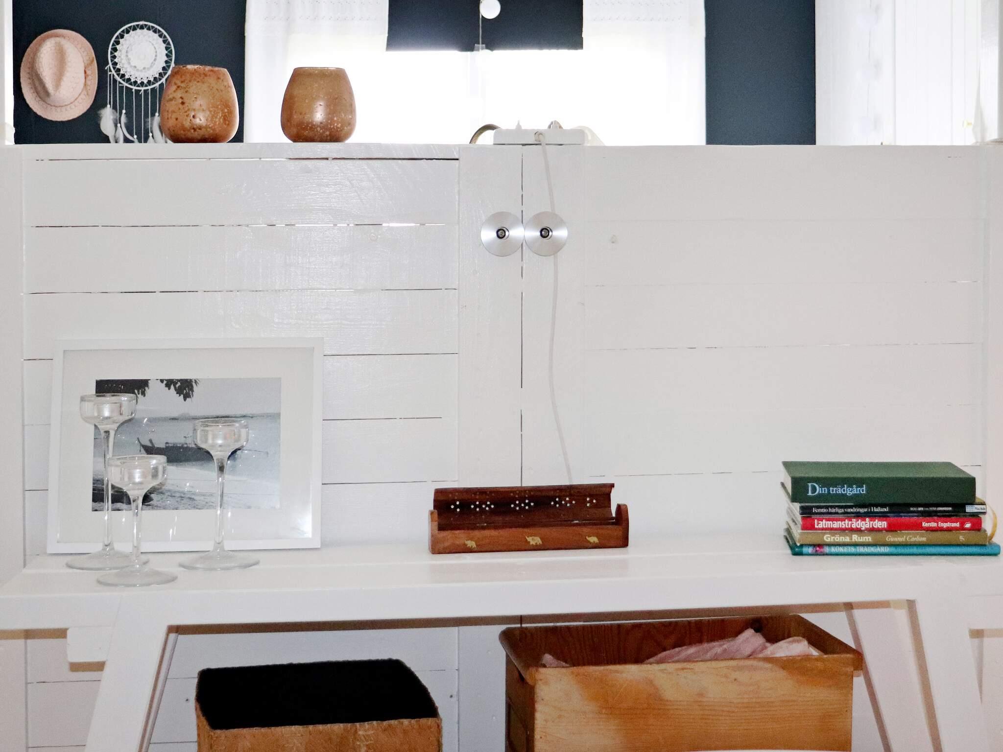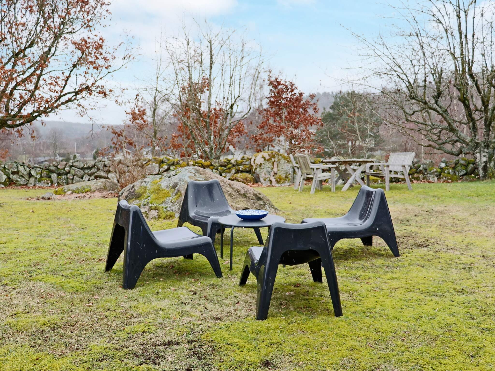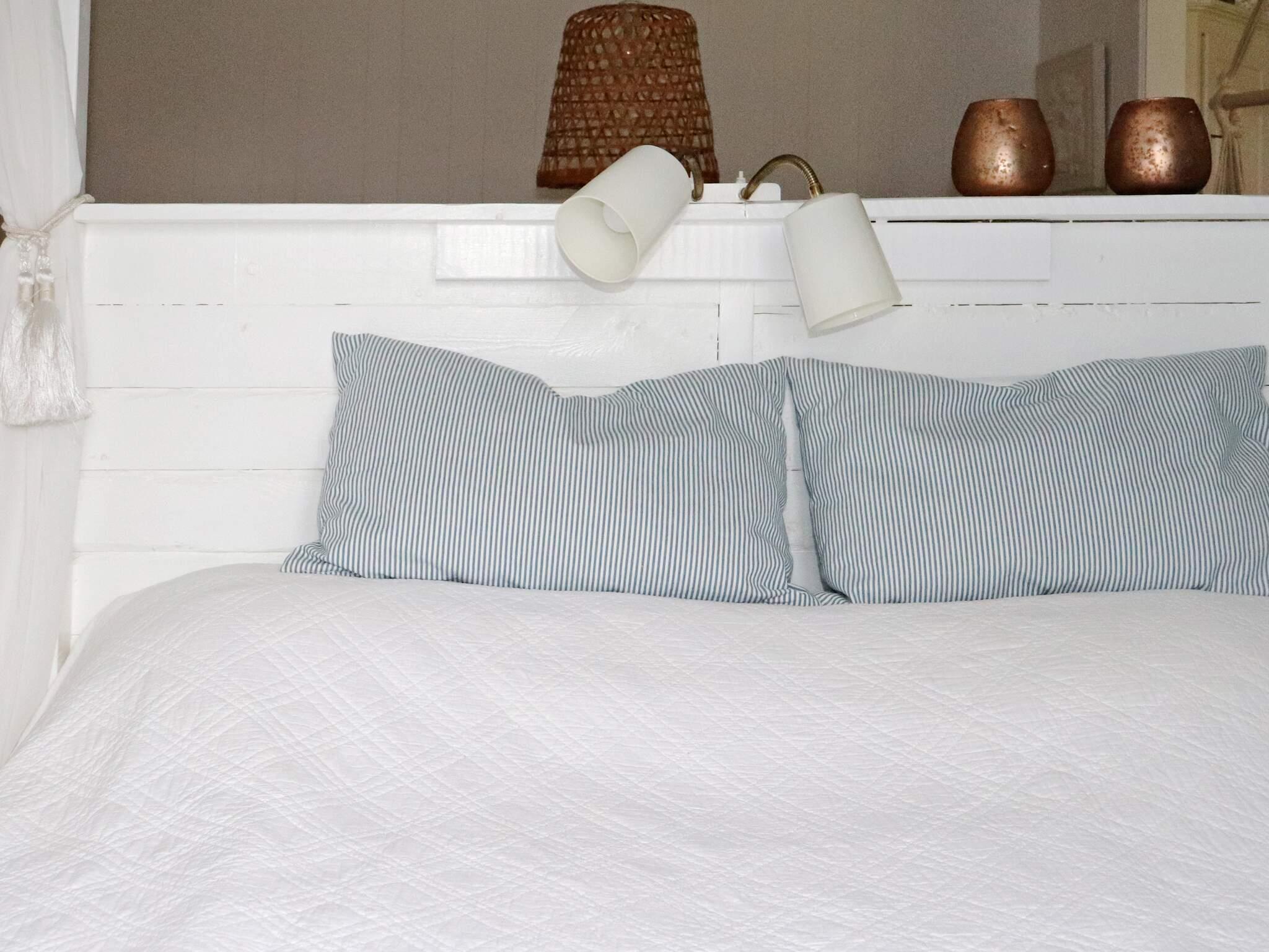 Vid husets entré finns en altan under tak med matbord och grill. Köket har all utrustning ni kan behöva. I husets centrum finns ett vardagsrum med soffgrupp och TV och en matplats. En charmig sovalkov avdelad med väggdel och draperi, rymmer en dubbelsäng. Ett mindre sovrum har en våningssäng med 120cm i nedre sängen. Badrummet har dusch. Tomten har gott om plats för alla era aktiviteter och det finns flera trädgårdsmöbler.