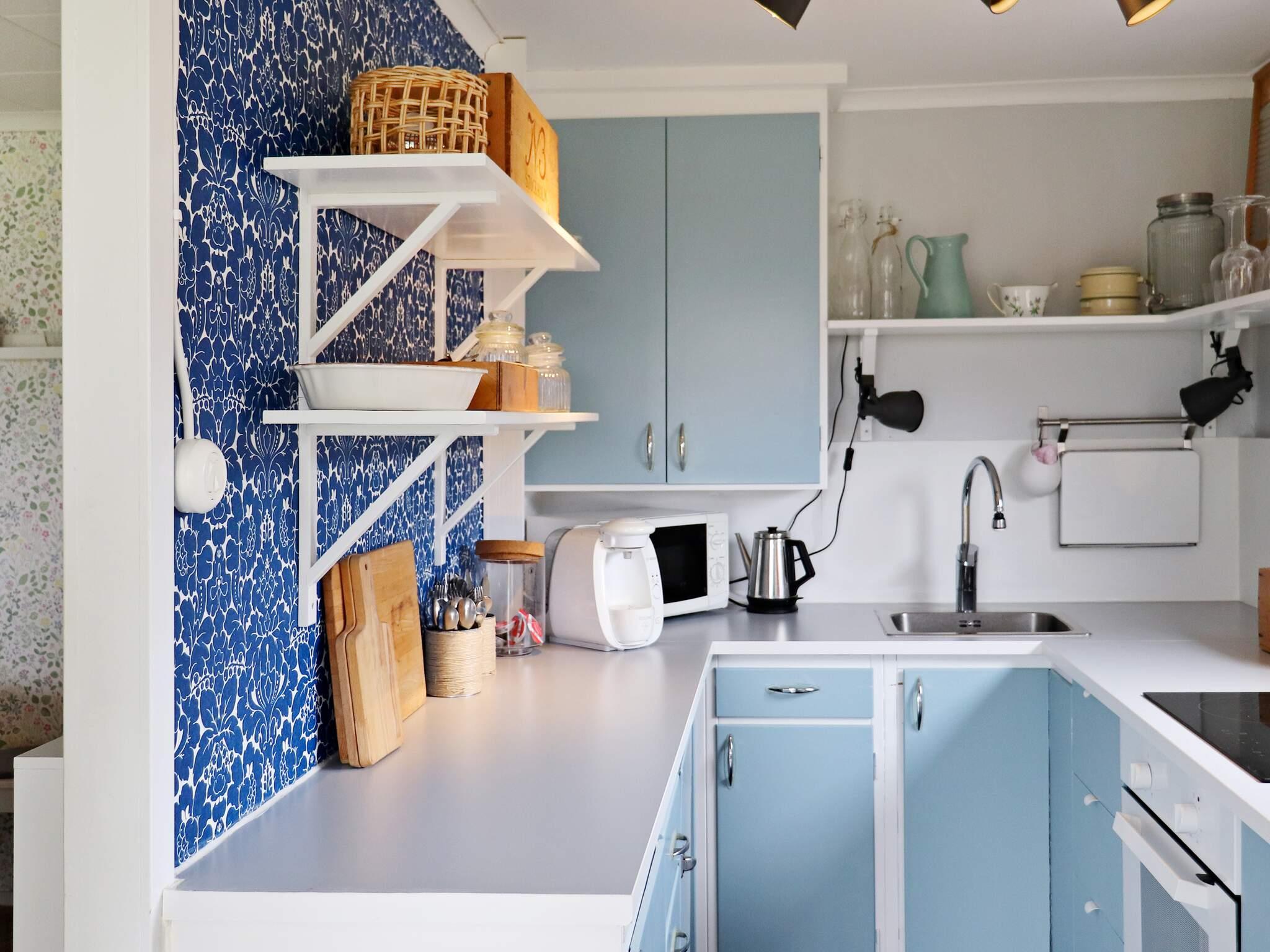 Køkken: El-komfur, køle-frys, mikroovn, kaffemaskine, vand fra brønd