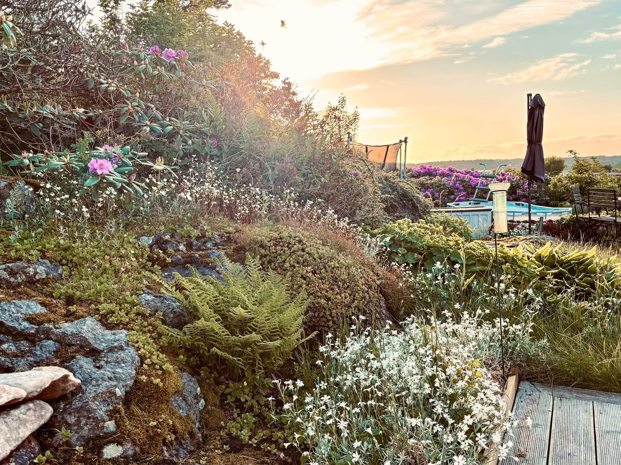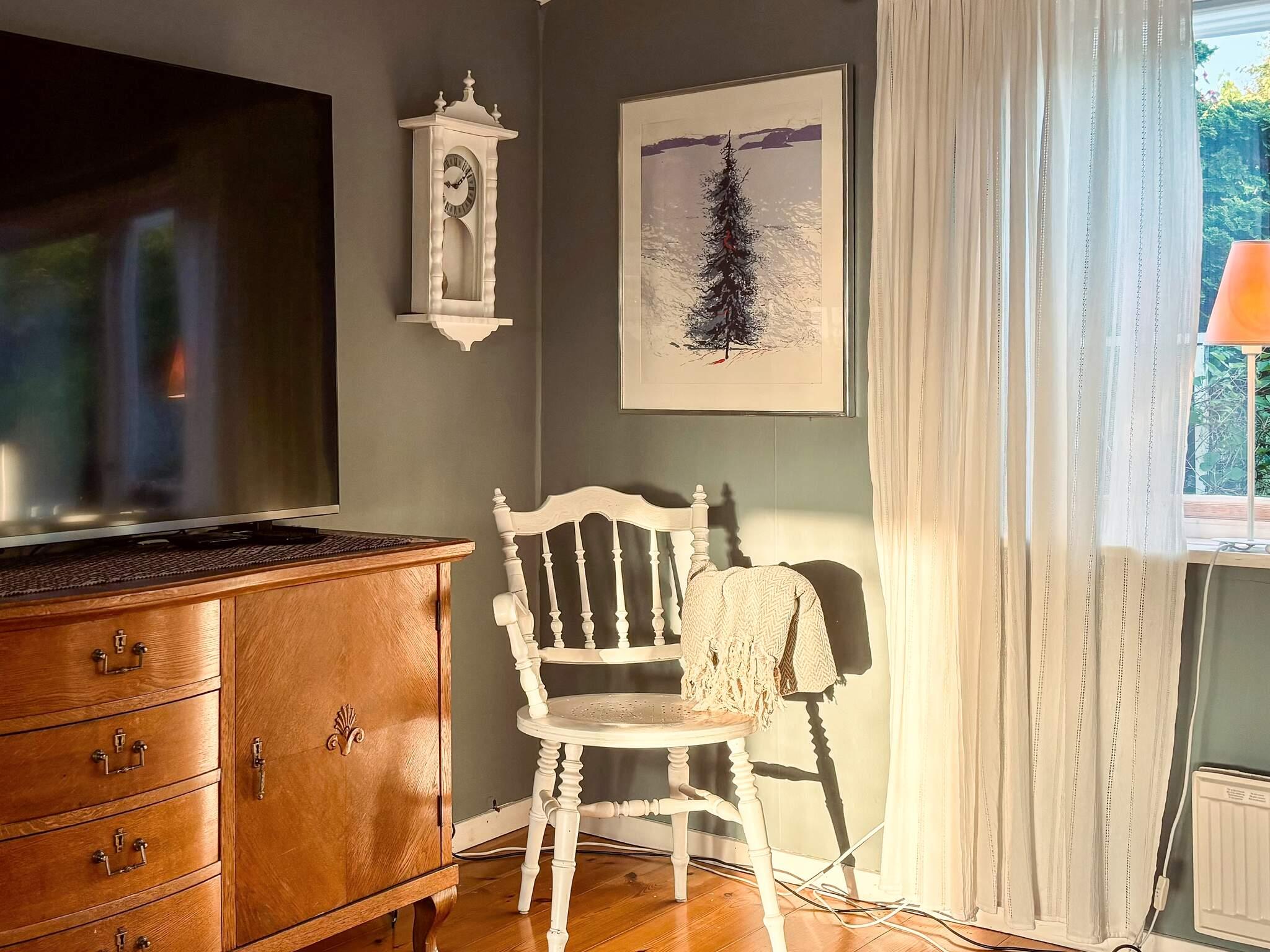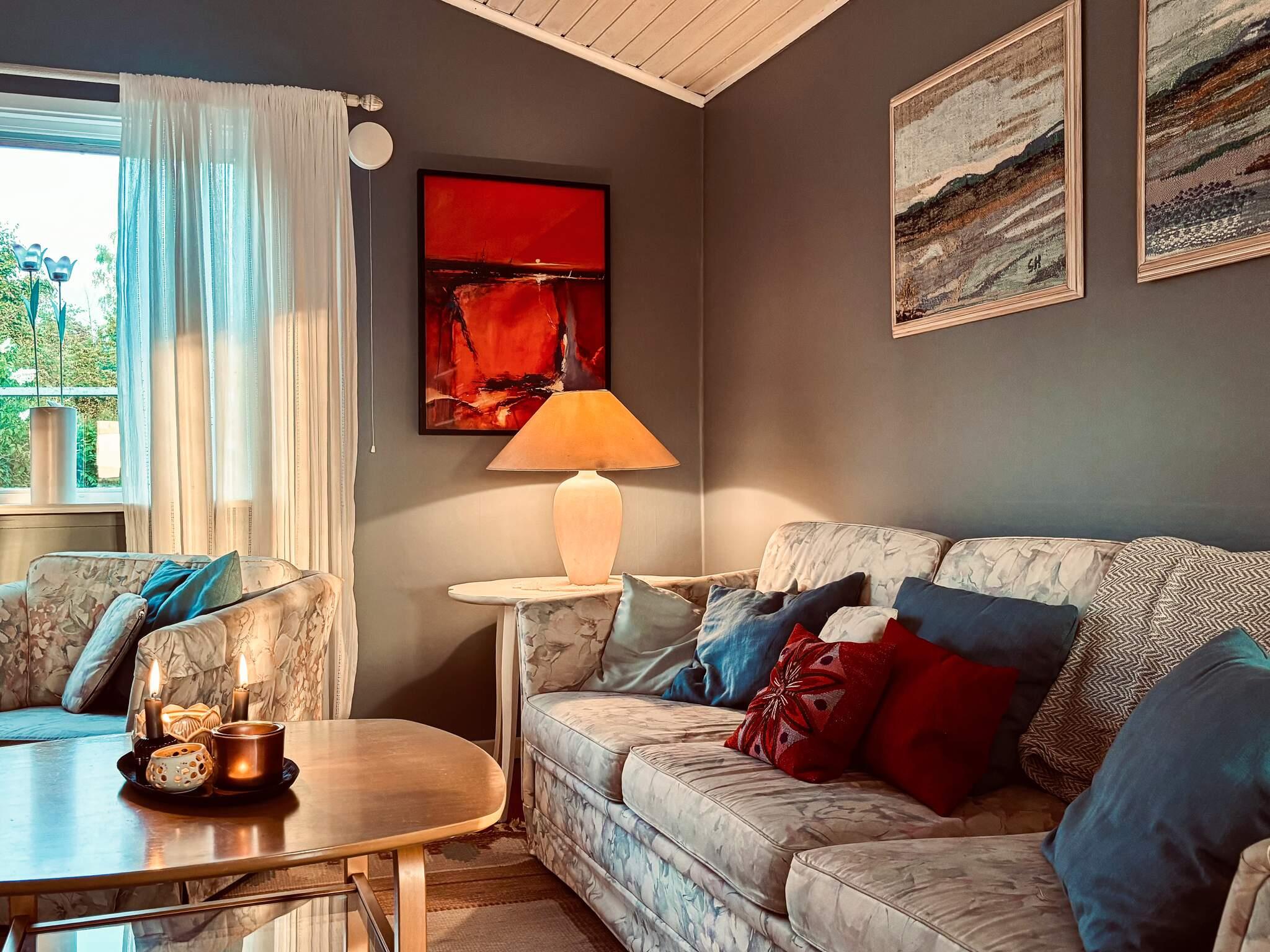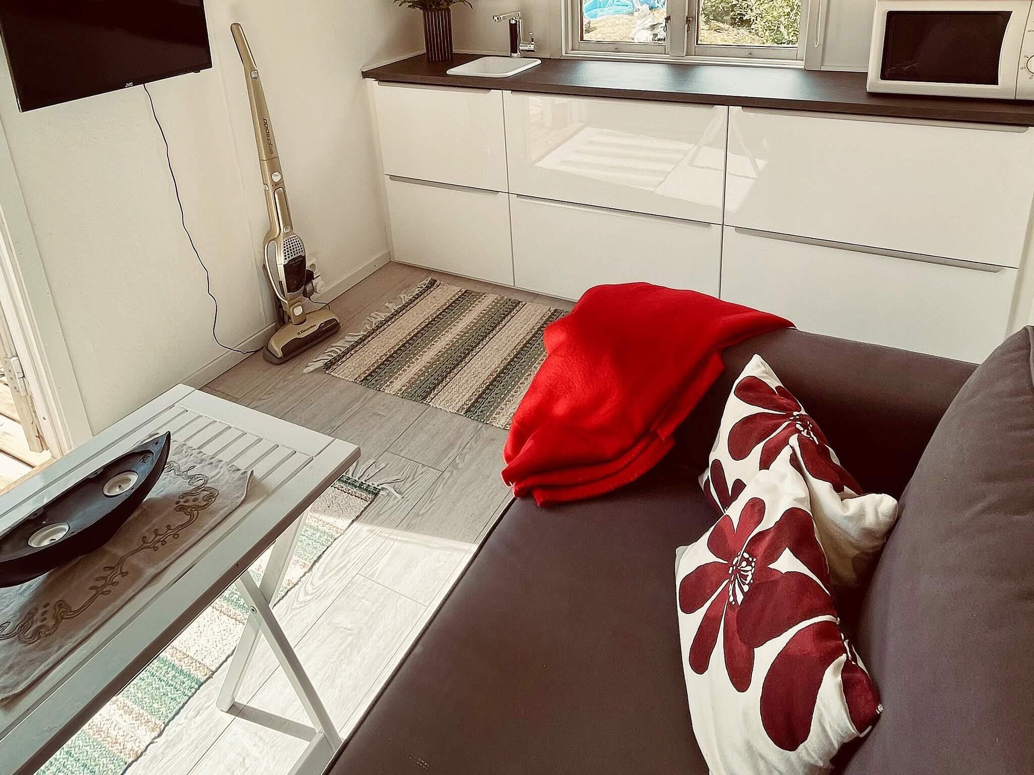 Från entrén har ni till vänster ett mindre sovrum med en enkelsäng och TV. Sedan har ni ett rymligt vardagsrum med bekväma sittmöbler, stor modern TV och en braskamin. Härifrån är det utgång till ett härligt inglasat uterum med matbord. Stugans kök är välutrustat och har matplats. Även här finns utgång till uterummet. Intill köket finns ett badrum med dusch och tvättmaskin som har ingång även utifrån. Här finns också ett sovrum med en dubbelsäng (140cm). Ett sovrum är vidbyggt stugan, har två enkelsängar och ingång utifrån. Gäststugan är inredd med en bäddsoffa för två personer och har tvättfat, micro samt TV. Totalt är boendet för 6 personer. I hela stugan finns gratis wifi. Tomten är grönskande och kuperad med många härliga små sittplatser och solstolar. Ni har en härlig utsikt över stugområdet och havet.