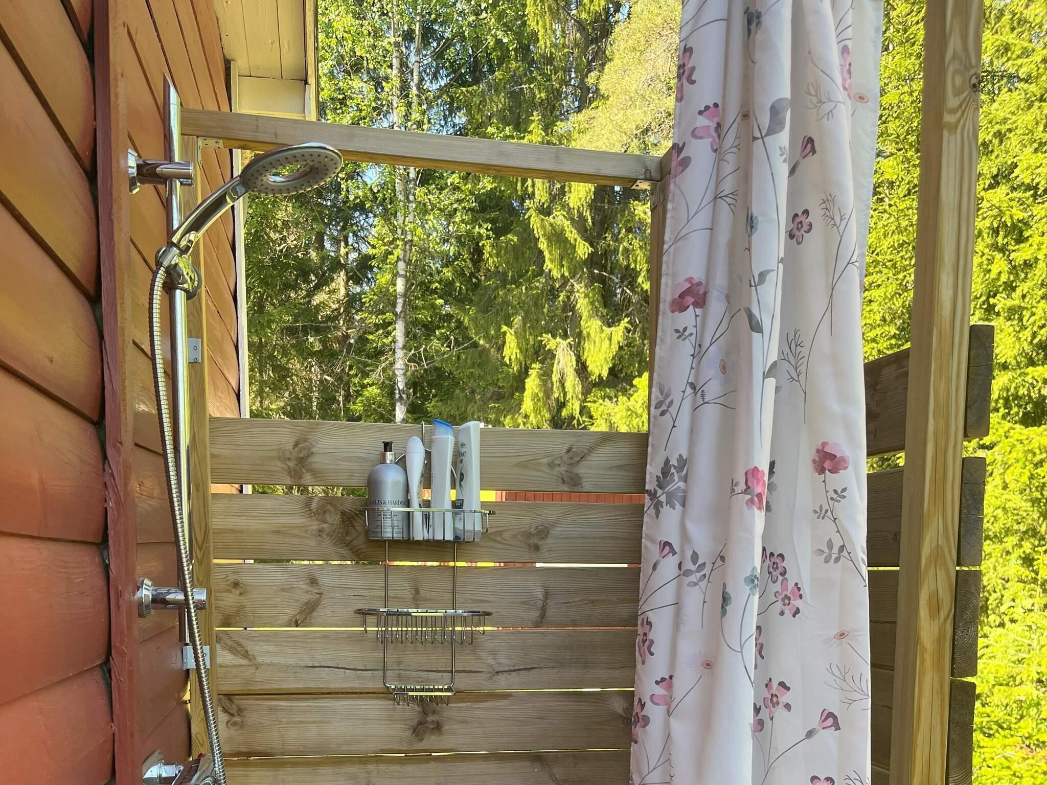 I ett separat hus hittar du en förbränningstoalett och tvättställ, följ noga instruktioner angivna vid förbränningstoaletten. Duschar gör du i utomhusduschen med varmt och kallt vatten och kan samtidigt njuta av sjöutsikten.