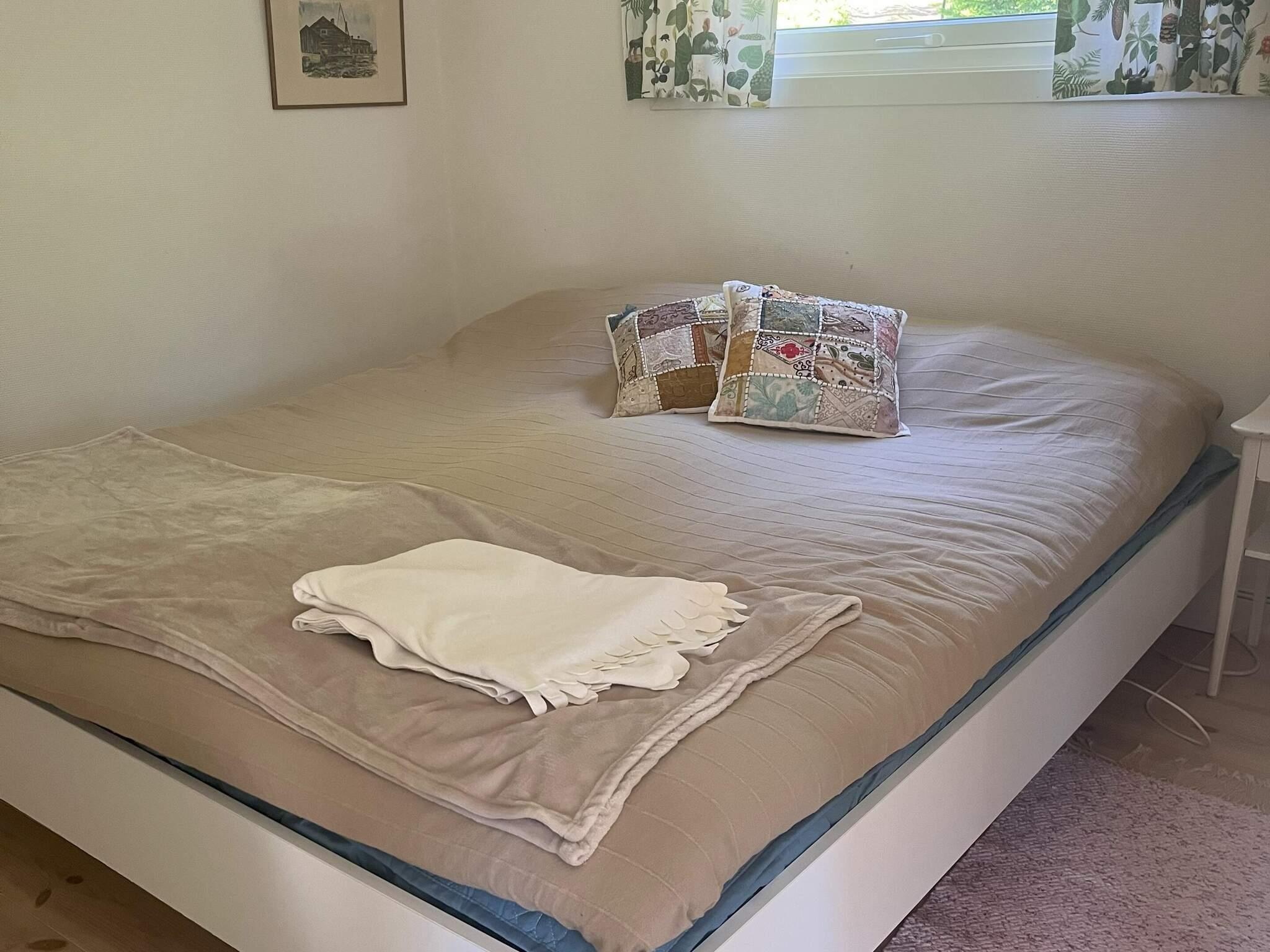 Gästhuset har två sov avdelningar där det finns en enkelsäng som är 120cm bred samt i det inre rummet en våningssäng och ett bord med stolar och du har samma fantastiska sjöutsikt från gästhuset.