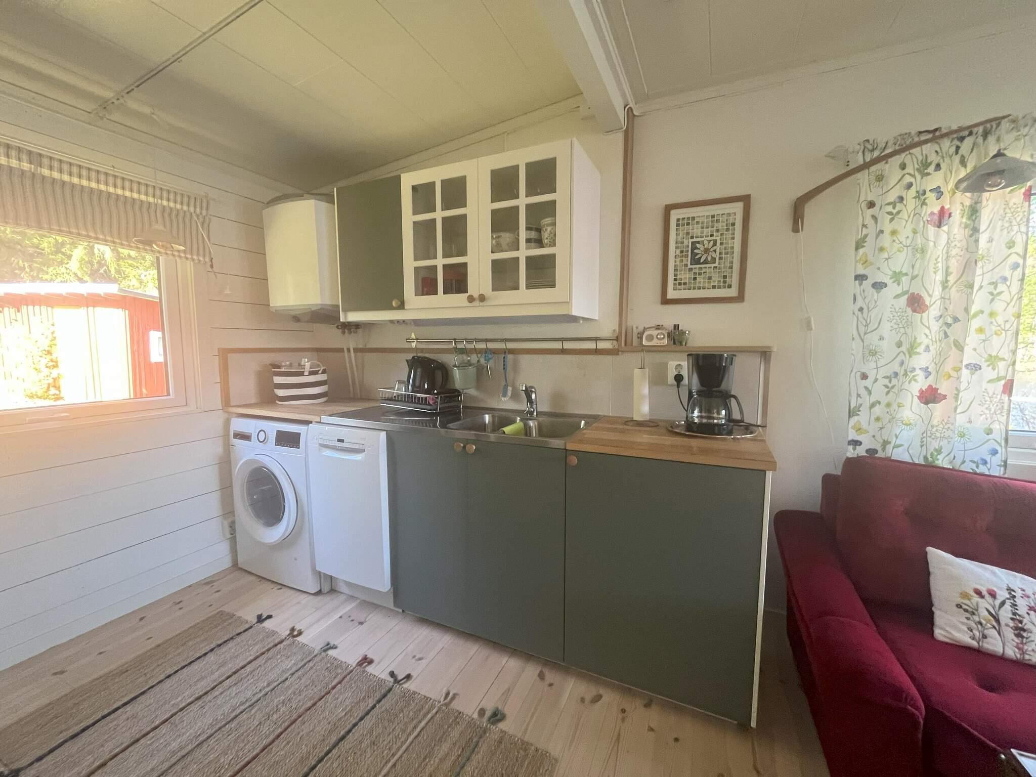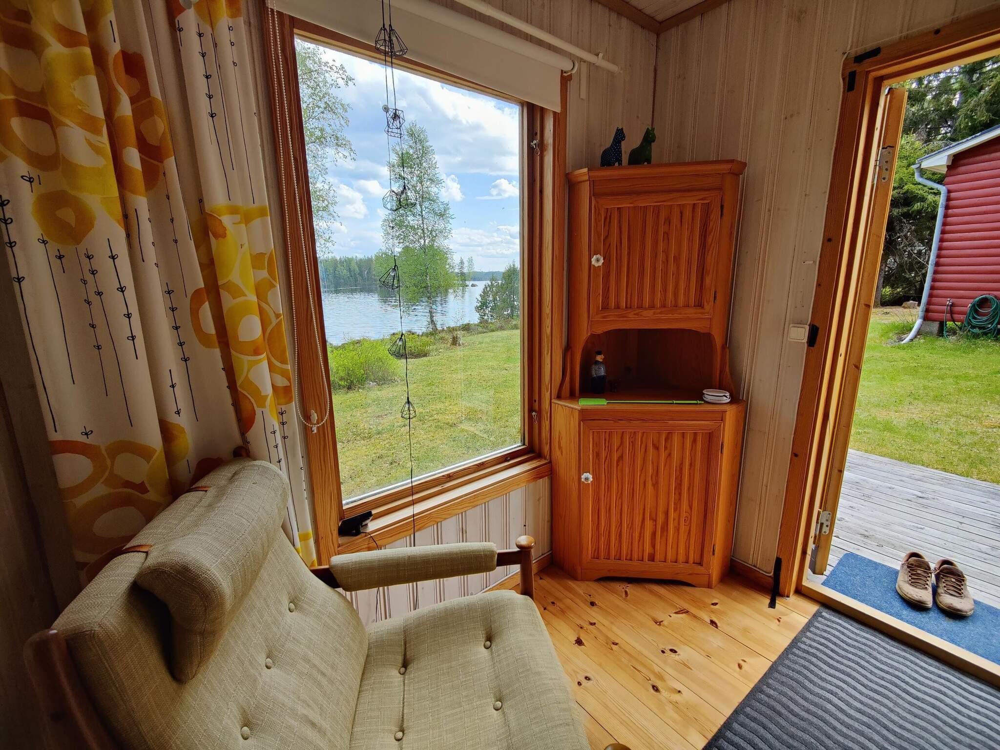 Du förfogar över två olika byggnader där det större huset har ett fullutrustat kök som ligger i en öppen planlösning mot storstugan. I stora huset sover man i en dubbelsäng, som är en typ av alkov utan dörr. Matplatsen har en underbar utsikt mot sjön och där finns det plats för familjen att äta tillsammans, en mysig soffa att krypa upp i och en öppen spis fullbordar det större huset.