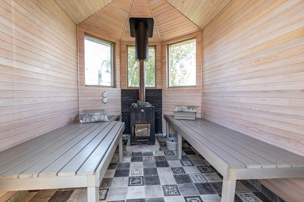 Udenfor inviterer to terrasser – den ene overdækket – med terrasse møbler og grill til afslapning. Der er også trådløst internet og efter forudgående aftale en mobil sauna. Du kan parkere på grunden. For sjov og motion er der bordtennisbord, et lille fodboldmål og en dartskive i haven.