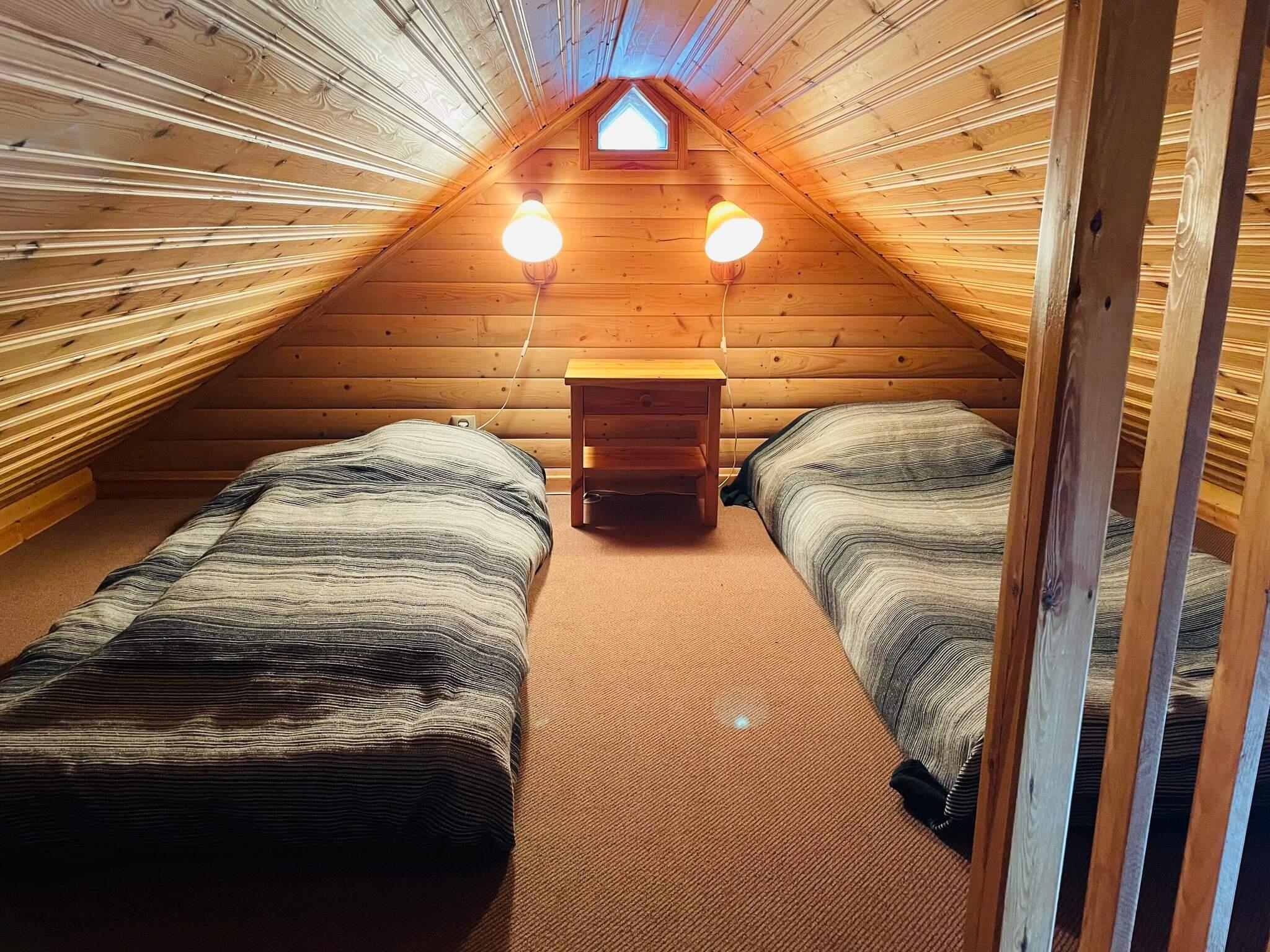 Huset präglas av en varm och ombonad atmosfär med generösa inslag av furuträ på både väggar och tak. De naturliga materialen skapar en mysig och genuin känsla som förstärks av de uppstoppade djuren som finns placerade runtom i huset. Här finns flera inbjudande sällskapsytor där familj och vänner kan samlas – oavsett om det är för långa middagar eller avkoppling framför brasan. TV finns i allrum med kanaler på flera språk. Köket är utrustat för självhushåll och har både disk-och tvättmaskin. Alla sovplatser finns en trappa upp. Ett sovrum med två enkelsängar som går att sätta ihop till en dubbelsäng. Stora sovrummet med högt till tak och öppen planlösning har dubbelsäng och sov loft med två tjockare madrasser placerade på golvet då takhöjden där är begränsad. Ytterligare ett sov loft med en madrass som enkelbädd. Till båda loften är det en brant trappa. Den charmiga övervåningen med alla sovplatser gör huset perfekt att bo i för vänner och familjer att dela på. Loftet blir snabbt en favoritplats för både stora och små – en extra mysig och avskild vrå.