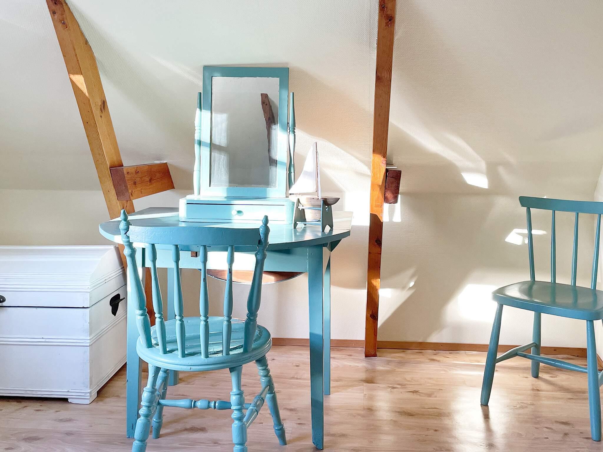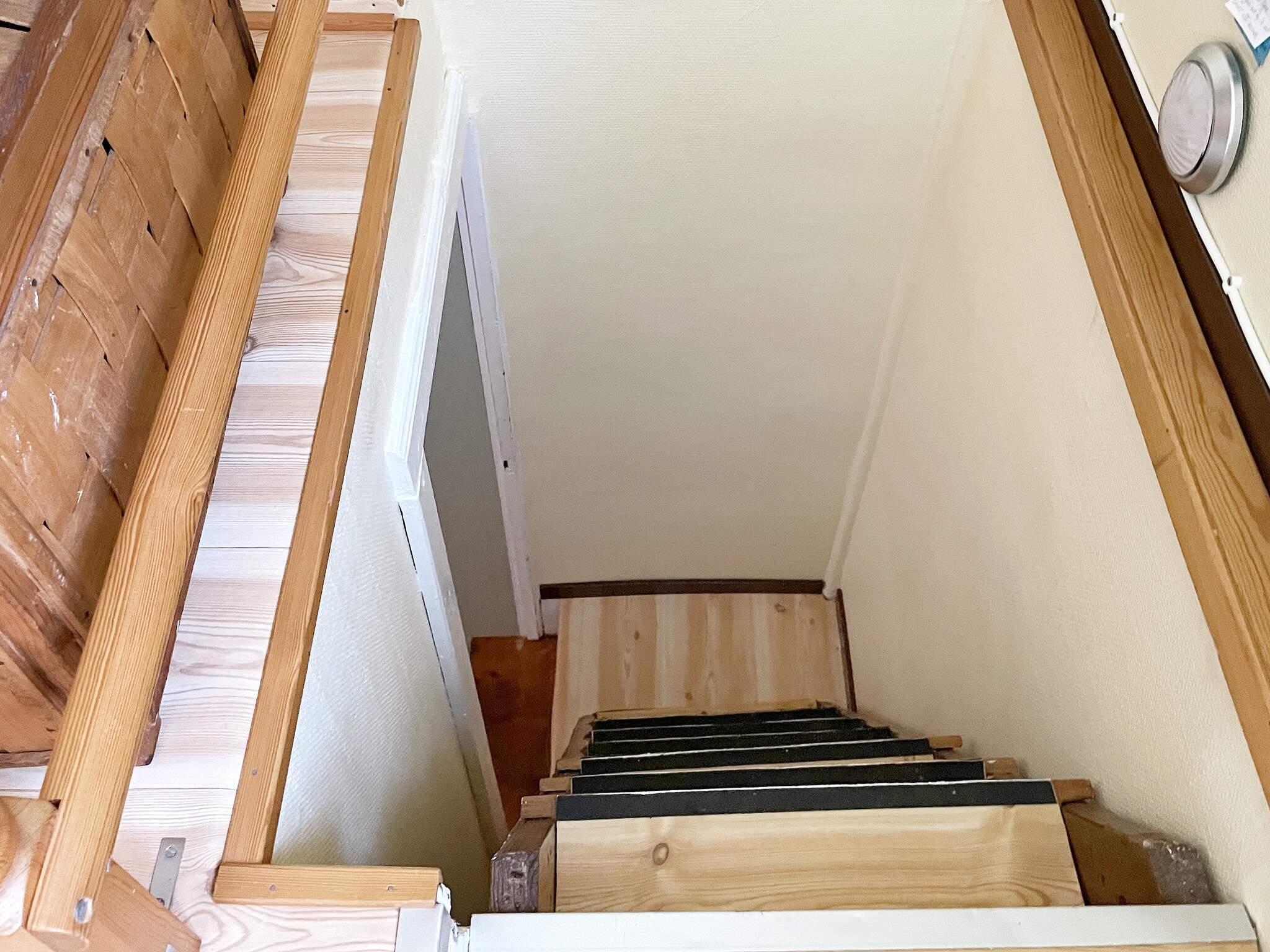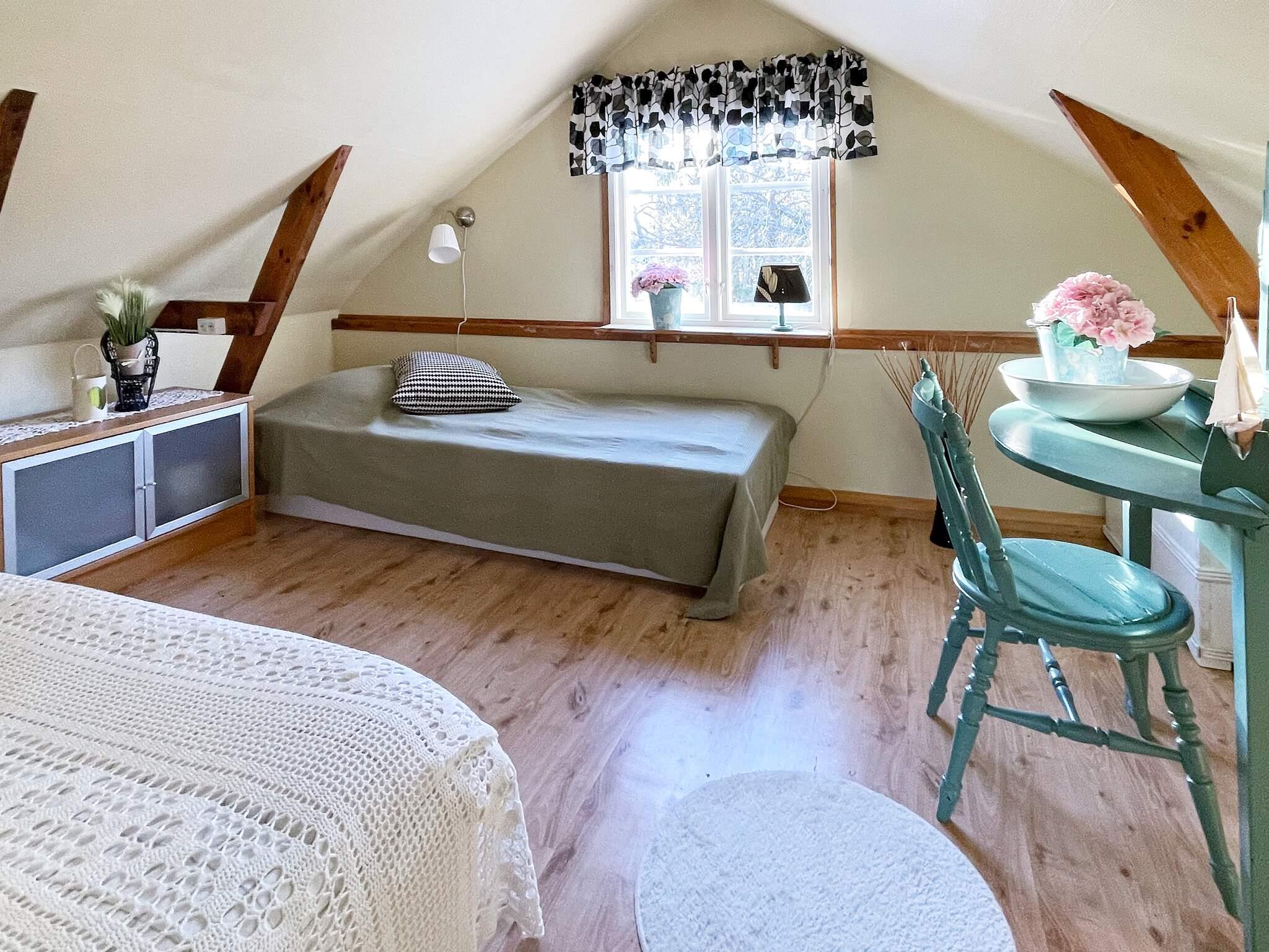 Observera att trappen upp till övervåningen är brant. Här får man se upp för det är snedtak i trappen med maxhöjd på 160 cm i självaste dörröppningen. På övre våningen finns det gott om utrymme och huset är större än man tror. Först kommer man till ett allrum med två dagbäddar. Till höger är husets större sovrum med en dubbelsäng och en spjälsäng. Rakt fram ligger ett mysigt sovrum med två enkelsängar. Huset erbjuder gott om plats och passar för familjen/sällskapet på 6 personer.
