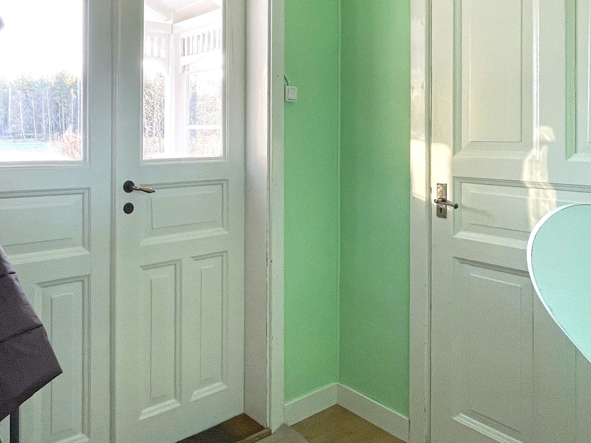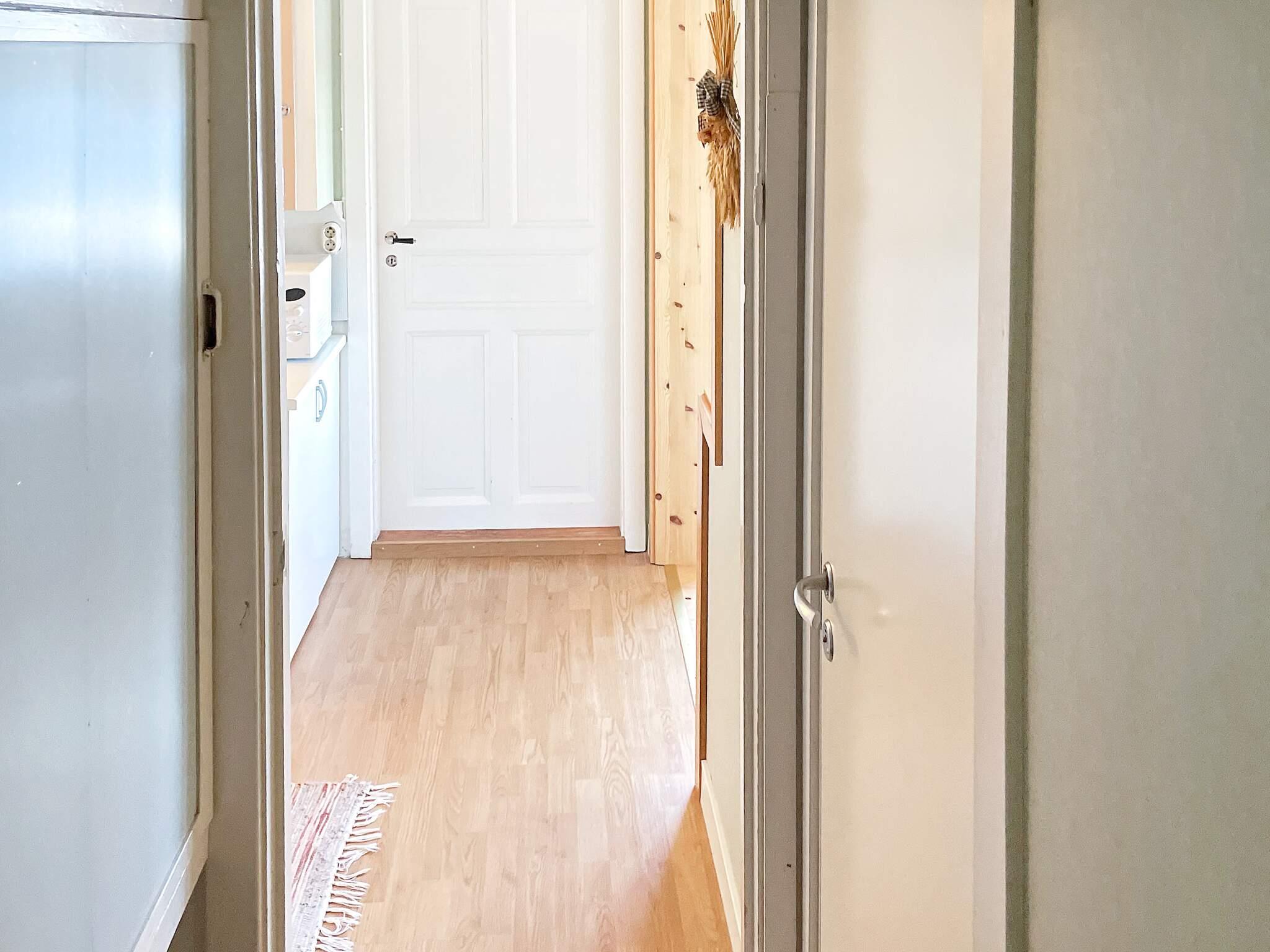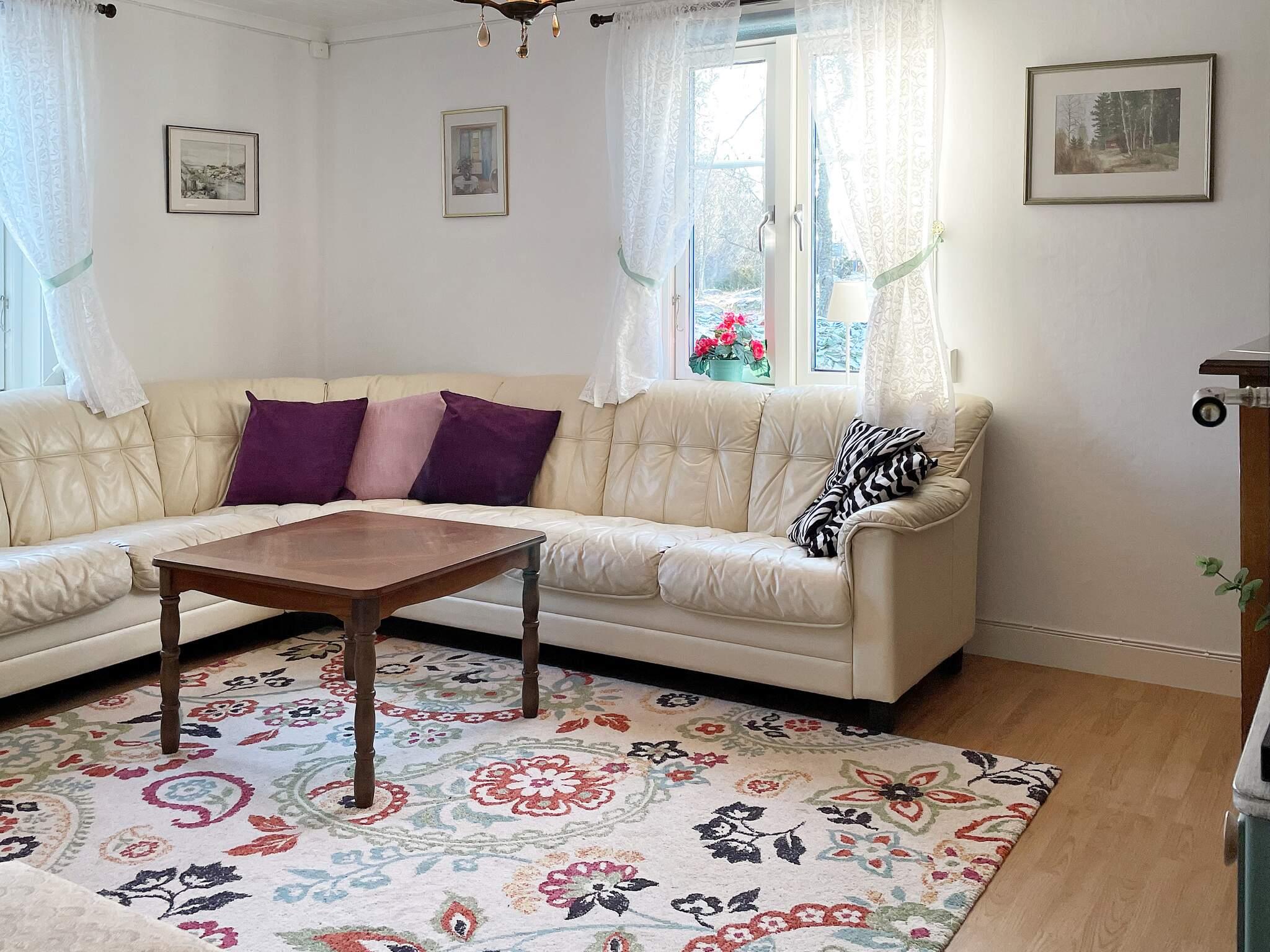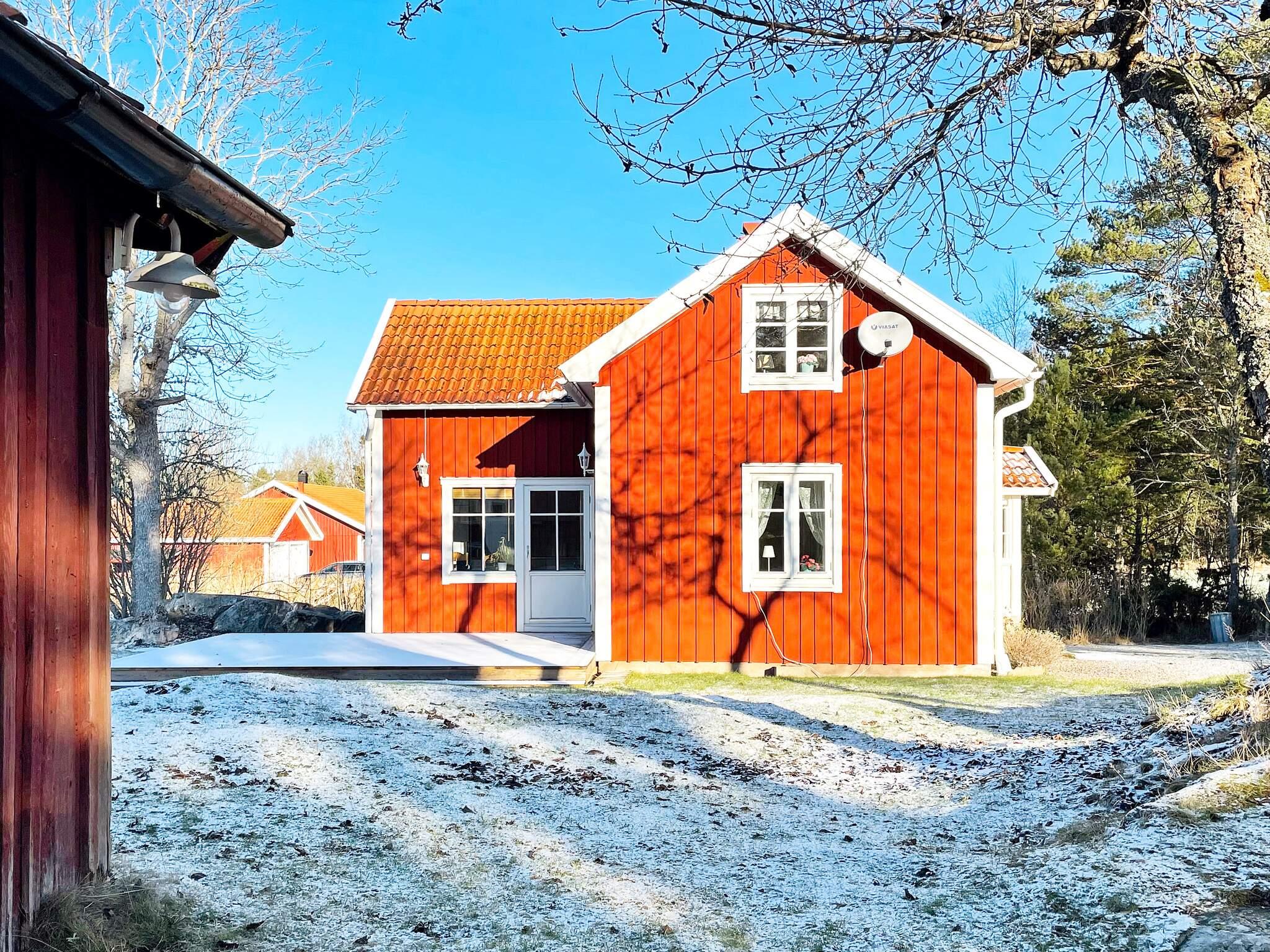 Huset är en svensk idyll. Rött hus med vita knutar omgärdar med träd och en fin grind av trä som välkomnar er. Huset är ljust möblerat, hemtrevligt, med lantlig charm. På första våningen finns en ljus mindre hall med gott om plats för ytterkläder och skor. Rakt fram kommer man till köksdelen med matplats för 6 personer. Här finns dörr ut till uteplatsen i solläge. Direkt till höger ligger husets ena sovrum med en våningssäng. Till vänster är vardagsrummet med tv, soffa och kamin. Badrummet är avlångt med toalett, handfat och duschkabin.
