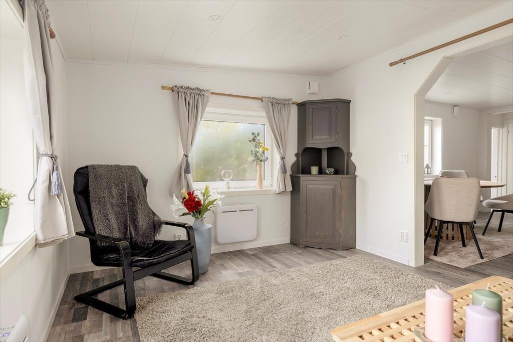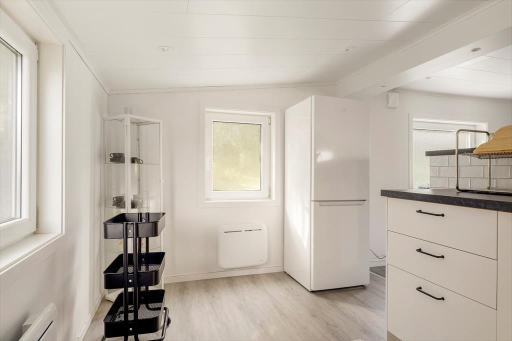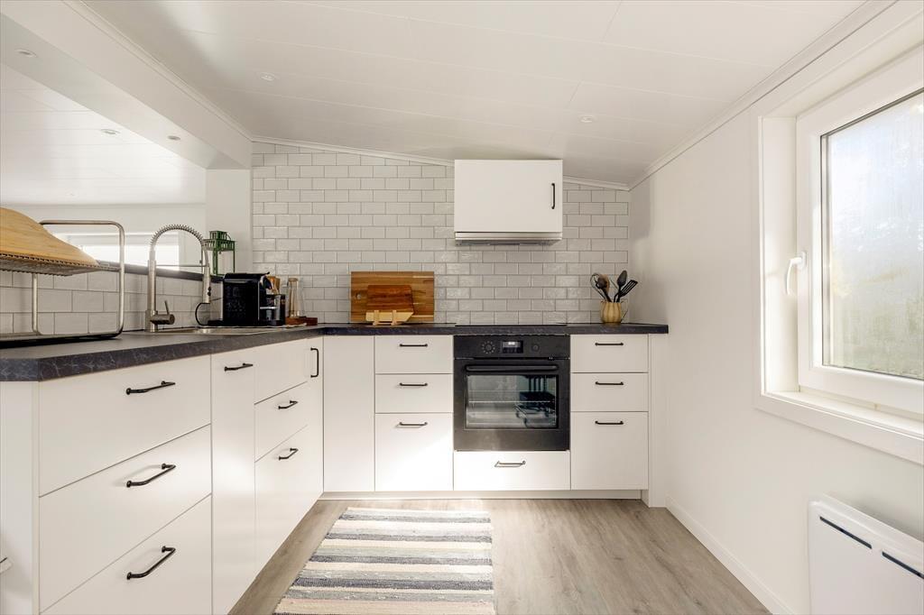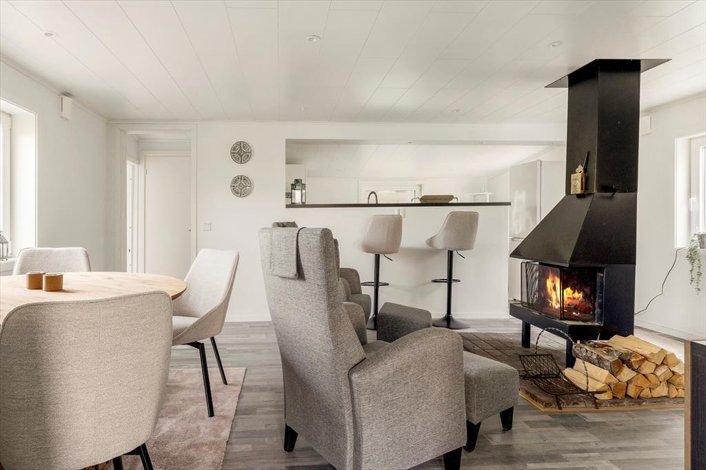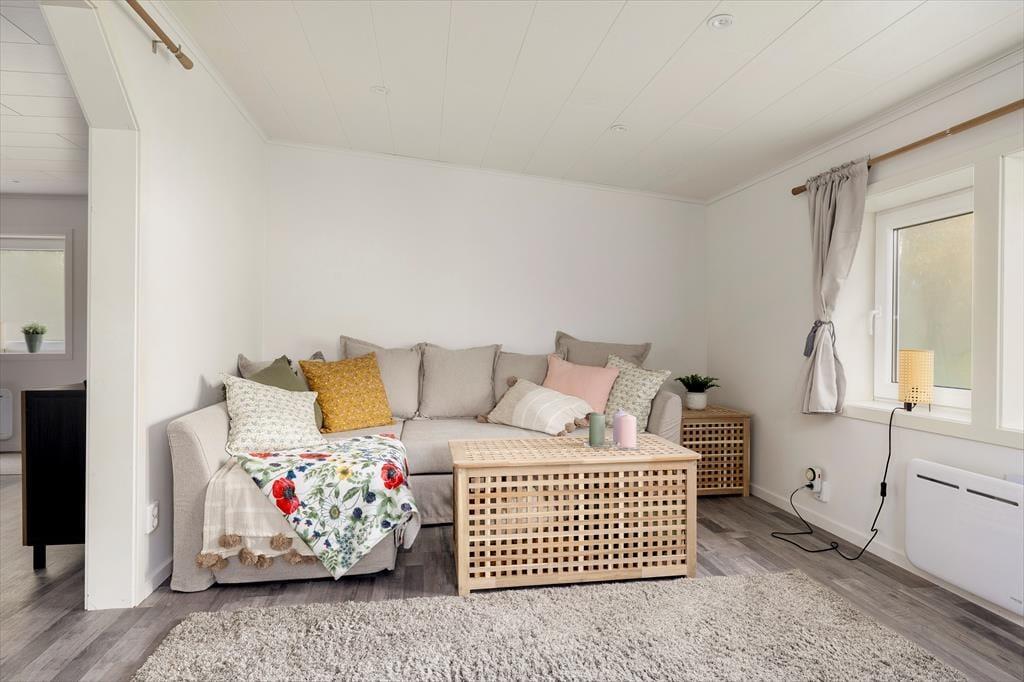 Feriehuset, der blev opført i 1960, har et boligareal på ca 58 m² og blev grundigt renoveret og moderniseret i 2023. Fra en lille entré træder man direkte ind i den lyse og indbydende opholdsstue, som er indrettet med elegante møbler, et moderne spisebord og en hyggelig brændeovn. Opholdsstuen er åbent forbundet med en mindre stue, der er indrettet med en dobbeltsovesofa. Køkkenet er adskilt fra spisestuen af en halvvæg med to barstole. Det veludstyrede køkken har elkomfur med glaskeramisk kogeplade og ovn, emhætte, køleskab med fryser, kaffemaskine og elkedel. Fra spisestuen er der også adgang til et soveværelse med dobbeltseng, samt et lyst badeværelse med bruser, toilet, håndvask og vaskemaskine. Ferieboligen har desuden internet og en veranda med havemøbler og kulgrill.