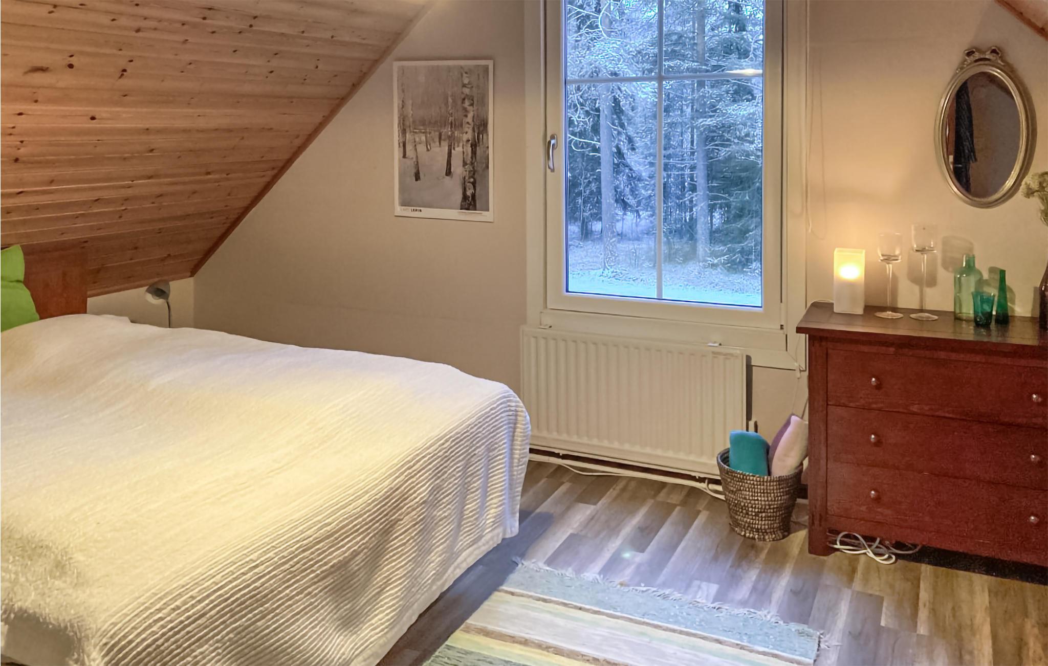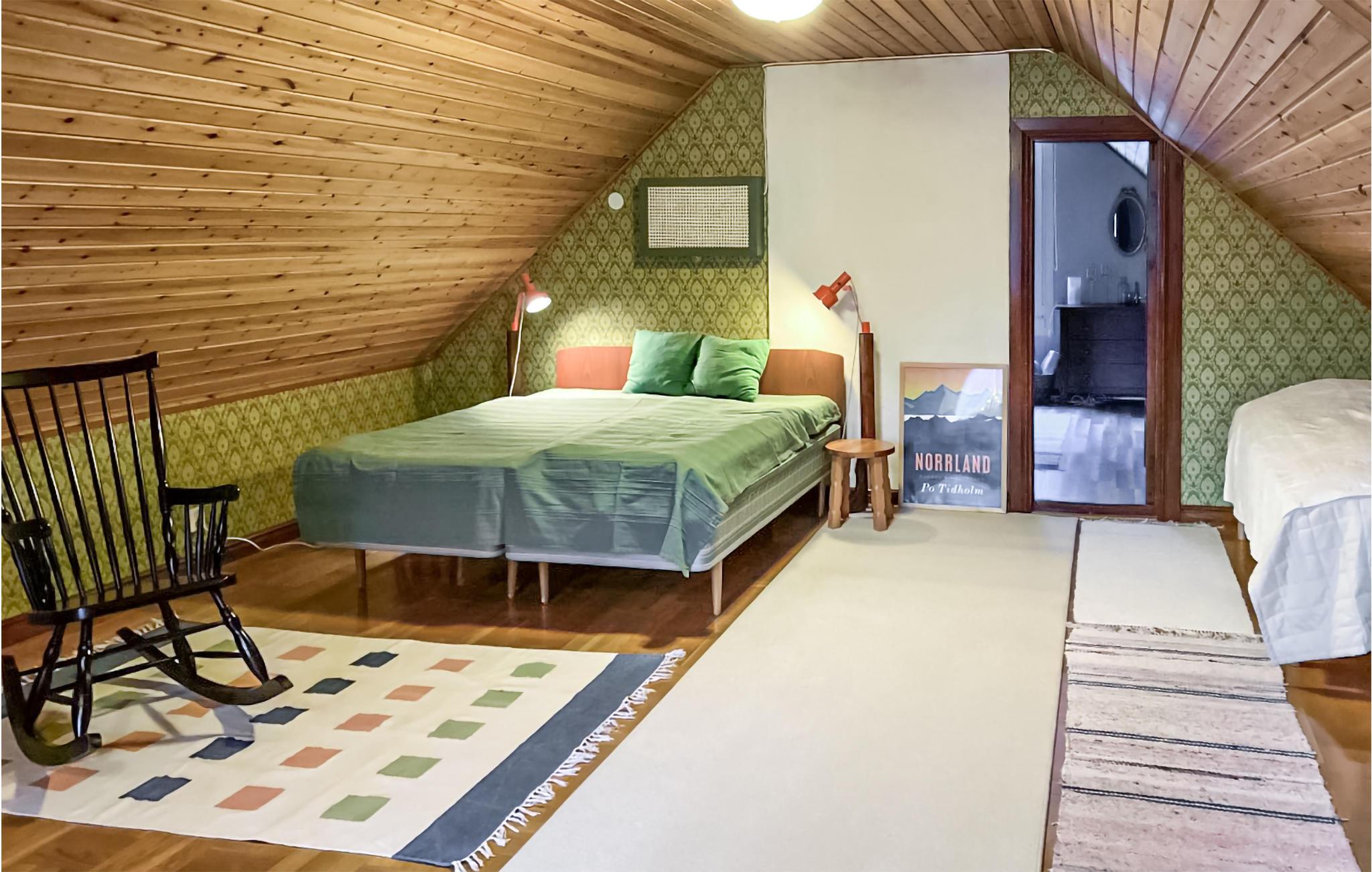 Velkommen til Nordsveriges dybe skove og fredfyldte landskaber med glimtende søer. I disse magiske rammer finder I dette hyggelige og rummelige hus. Huset er udstyret med alt, hvad I skal bruge for at hvile ud oven på en lang dag. Sæt hverdagens travle tempo ned og hent vand i brønden, fyld dagene med smukke gåture og benyt jer af tørreskabet, hvis jeres tøj bliver vådt. Efter en lang dag på farten kan I samles i den fine pejsestue til brætspil, gode bøger og film i fjernsynet. I husets have er der andre små bygninger, herunder en saunahytte, hvor I bløde de ømme muskler op oven på dagens strabadser.