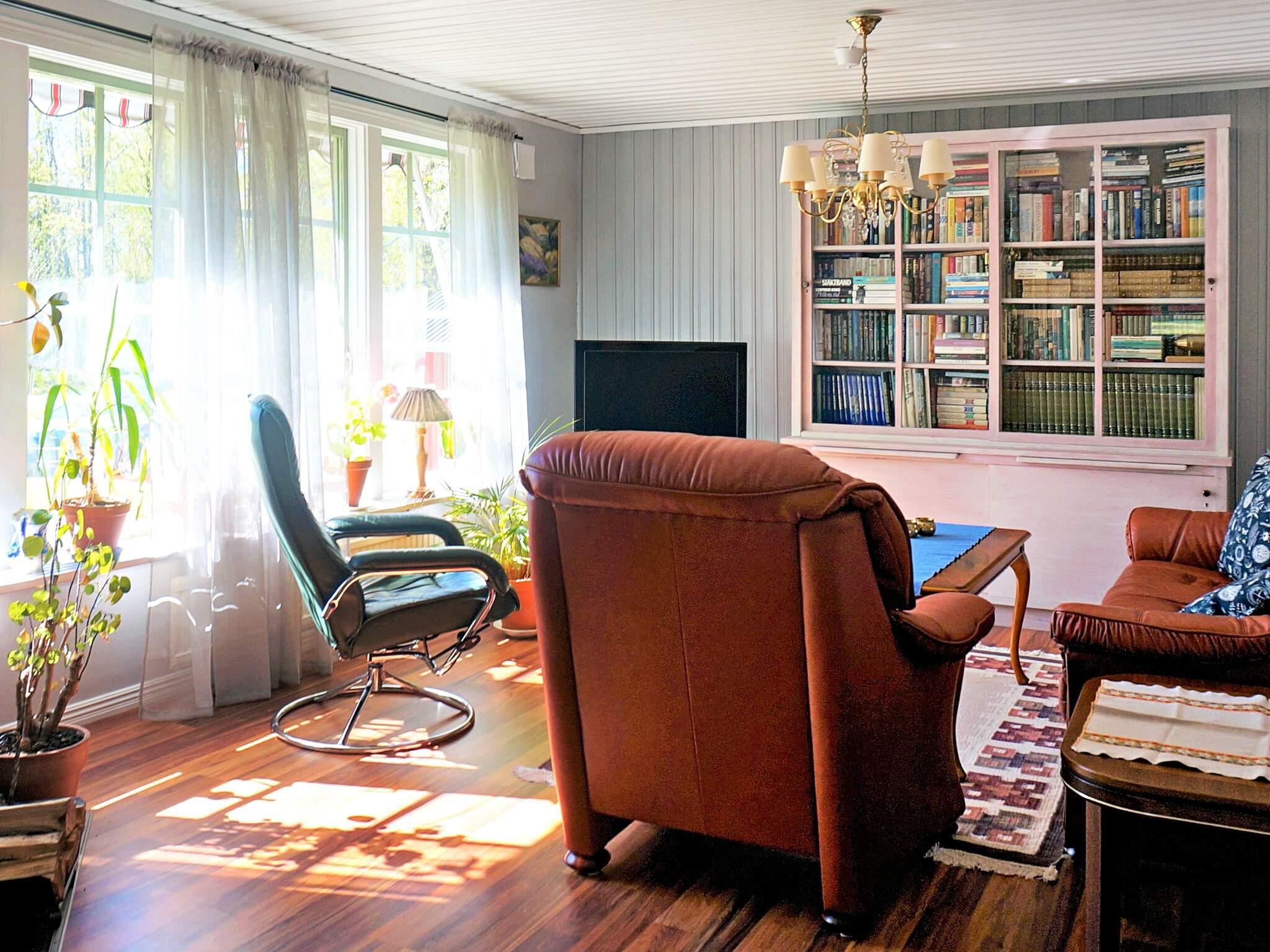 Här är bor man i ett välskött rött hus med vita knutar med promenadavstånd ner till bad. Huset ligger trivsamt i ett stug- och villaområde omgiven av härlig natur och med sjön strax nedanför. Detta boende passar utmärkt för en familj som vill ha lugnet, närheten till bad och sköna natur upplevelser. Rådjur och älg finns det gott om i området så har du tur ser du skogens konung utanför till boende.