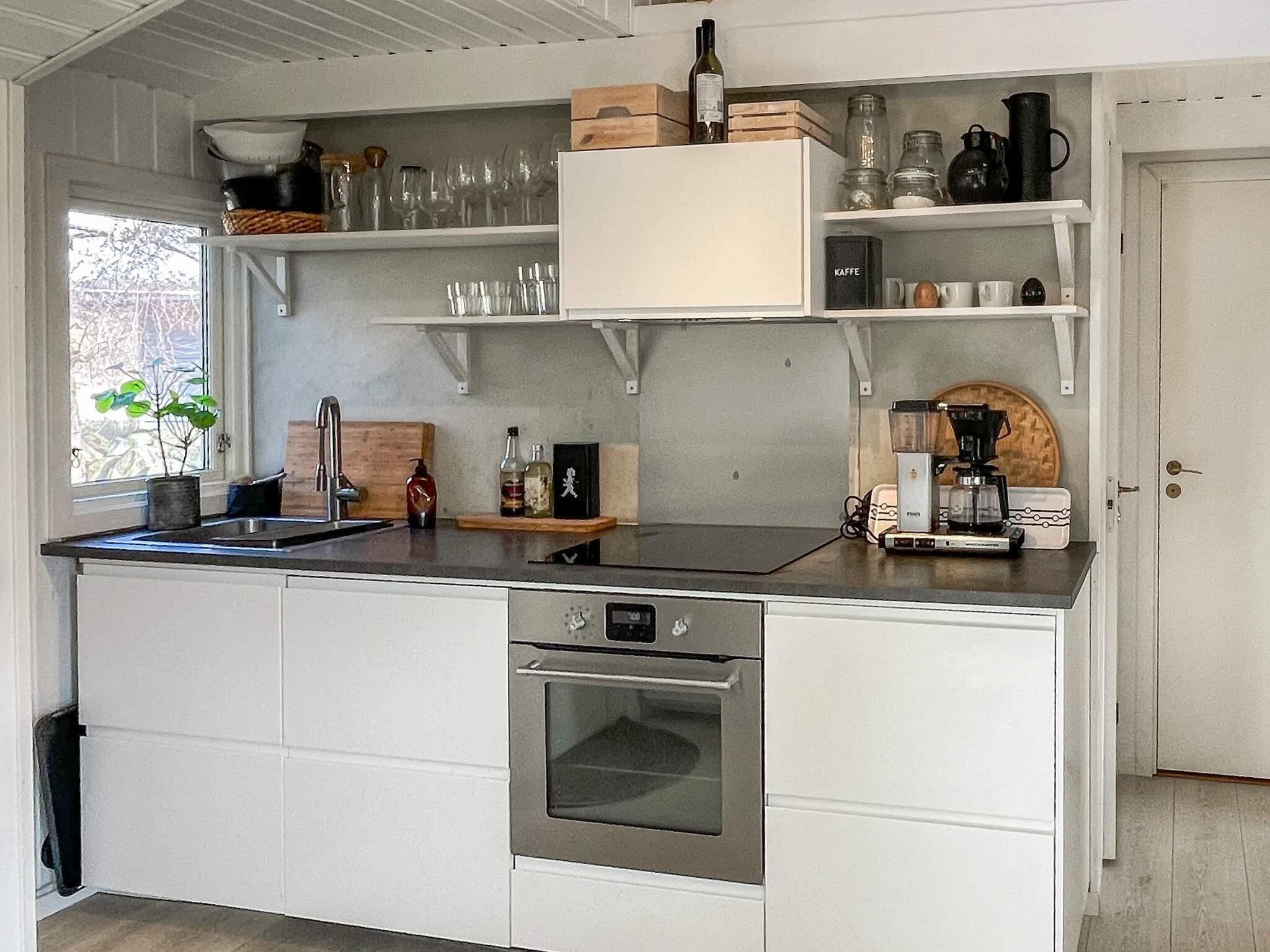 Køkken: Høj stol, el-komfur, køle-frys, mikroovn, kaffemaskine, opvaskemask.