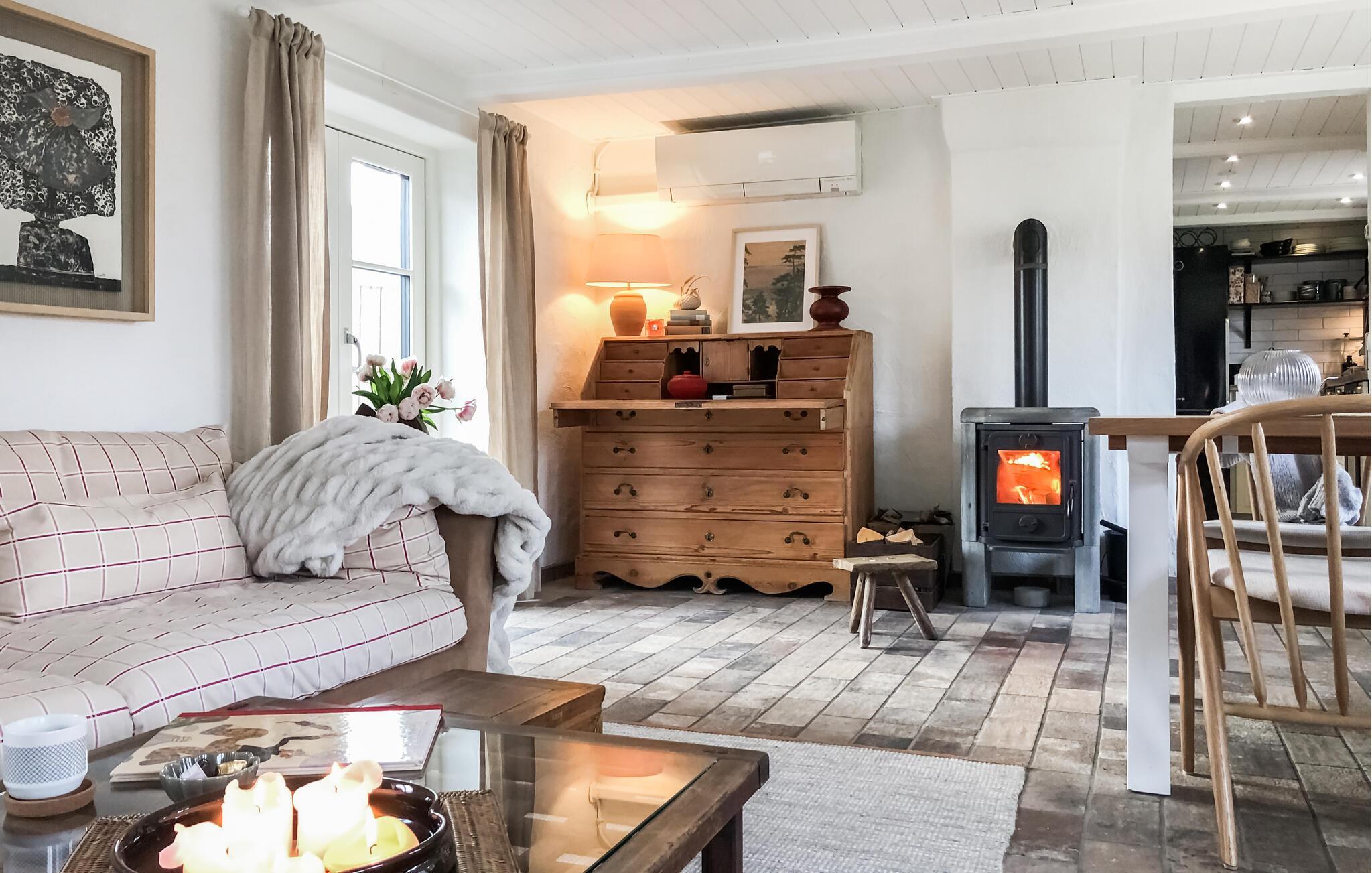 Tag familien under armen og rejs til Simrishamn, hvor dette nydelige hus danner rammen om en ferie med mange skønne udflugter i Skåne. Indretningen fremtræder yderst pænt og hjemligt med gode møbler og en brændeovn, der giver varme og det helt rette lydtapet på en gråvejrsdag, og som gør det ekstra hyggeligt at nyde en lækker aftensmad ved spisebordet. Senere kan I trække over i stuen med brætspil, hver jeres bog eller en god film, mens I lægger planer for de kommende dage.