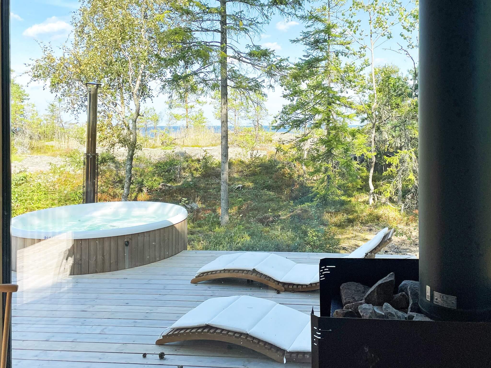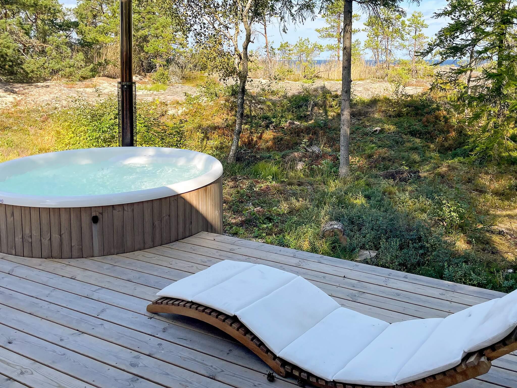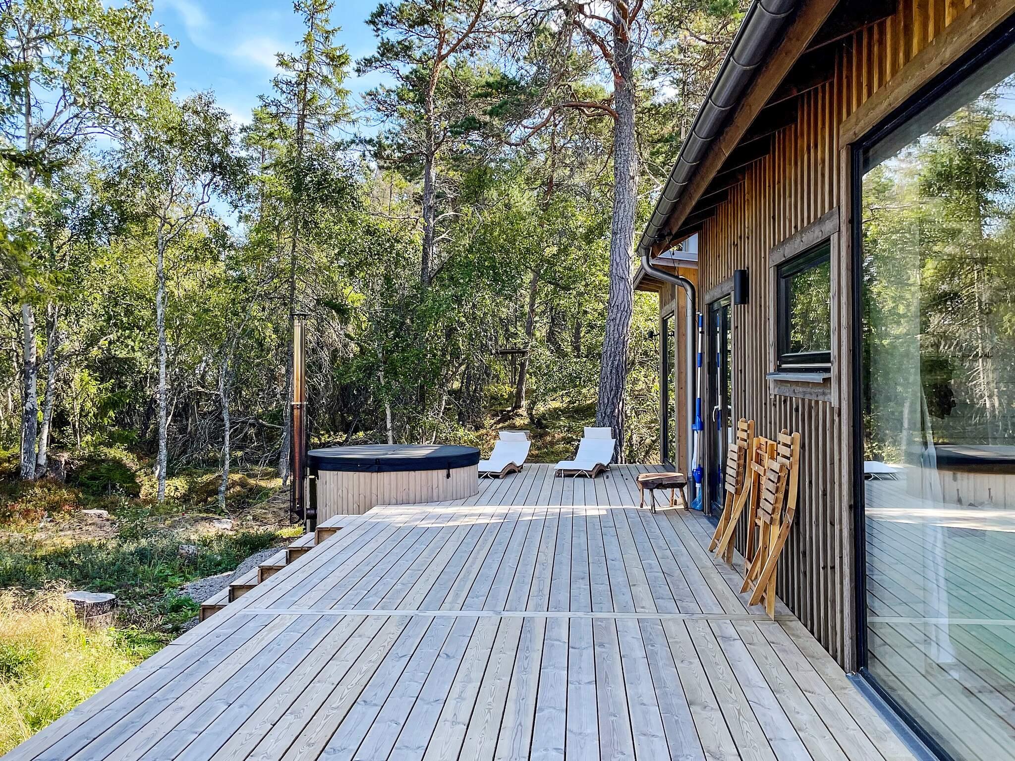 Stor terass runt hela huset med loungedel där solnedgånden kan skådas, matbord för trevliga middagar, kolgrill, solstolar vid badtunnan och bastun. Bastun nås utifrån invid badtunnan och både badtunna och bastu är vedeldad. Det finns även en utedusch med varmvatten för den som vill ta en skön dusch ute i det fria till fåglarnas sång!