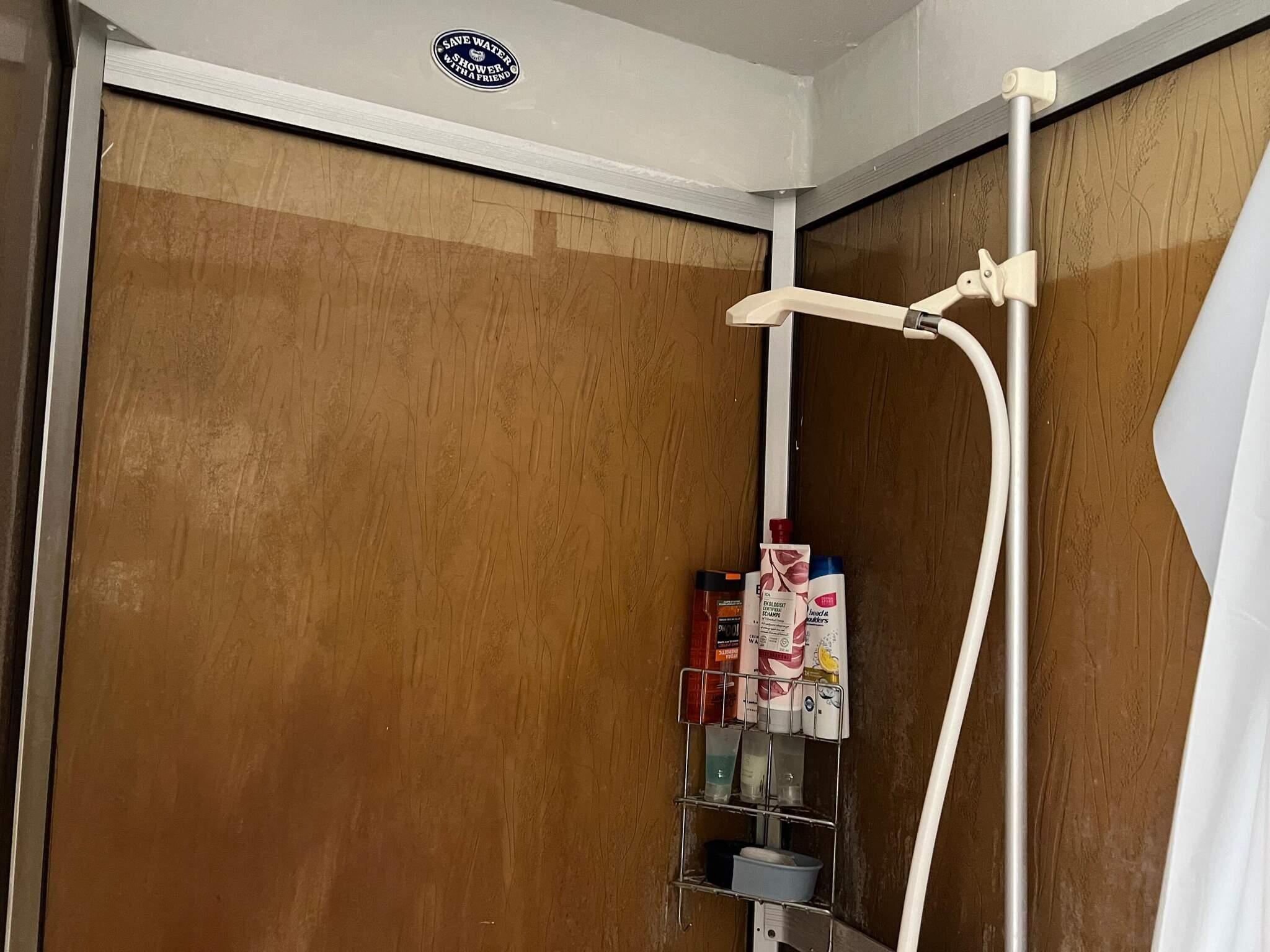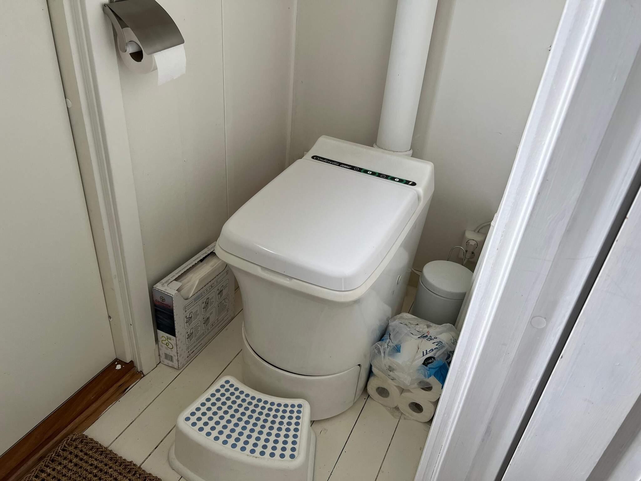 **Det är en lite annorlunda och smart lösning för dusch och WC, då det inte fanns plats för ett badrum; duschkabinen står i hallen och Eltoaletten står i den lilla hallen vid ingången.**