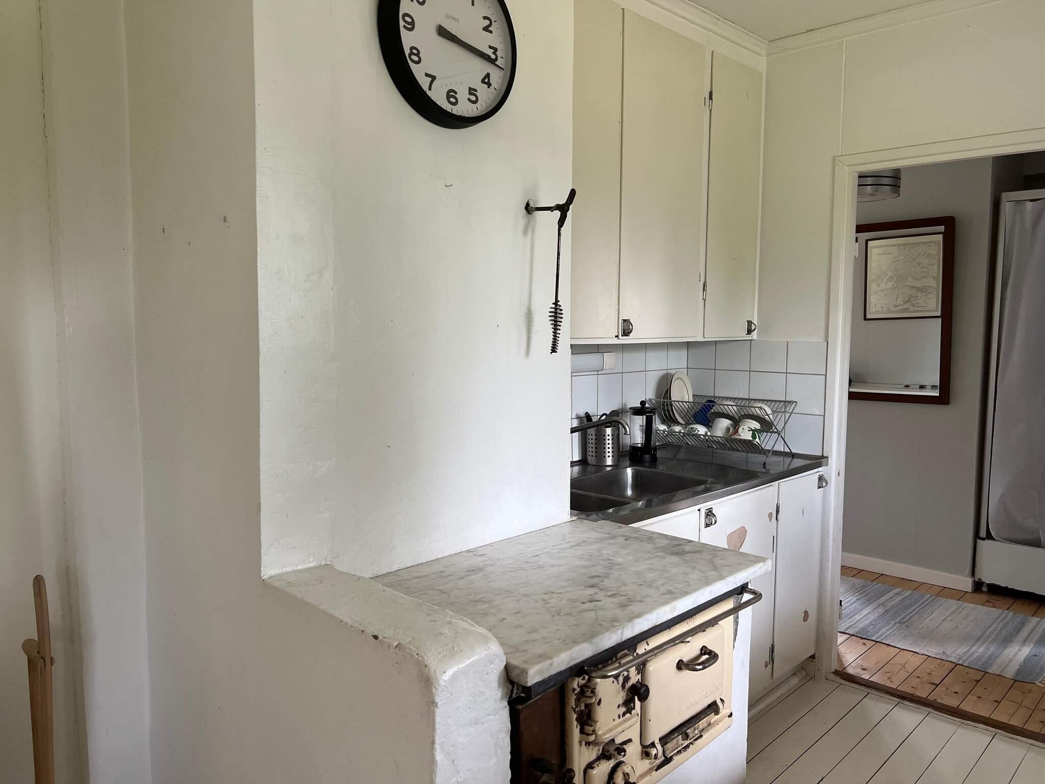 Køkken: El-komfur, køle-frys, kaffemaskine, vand fra brønd