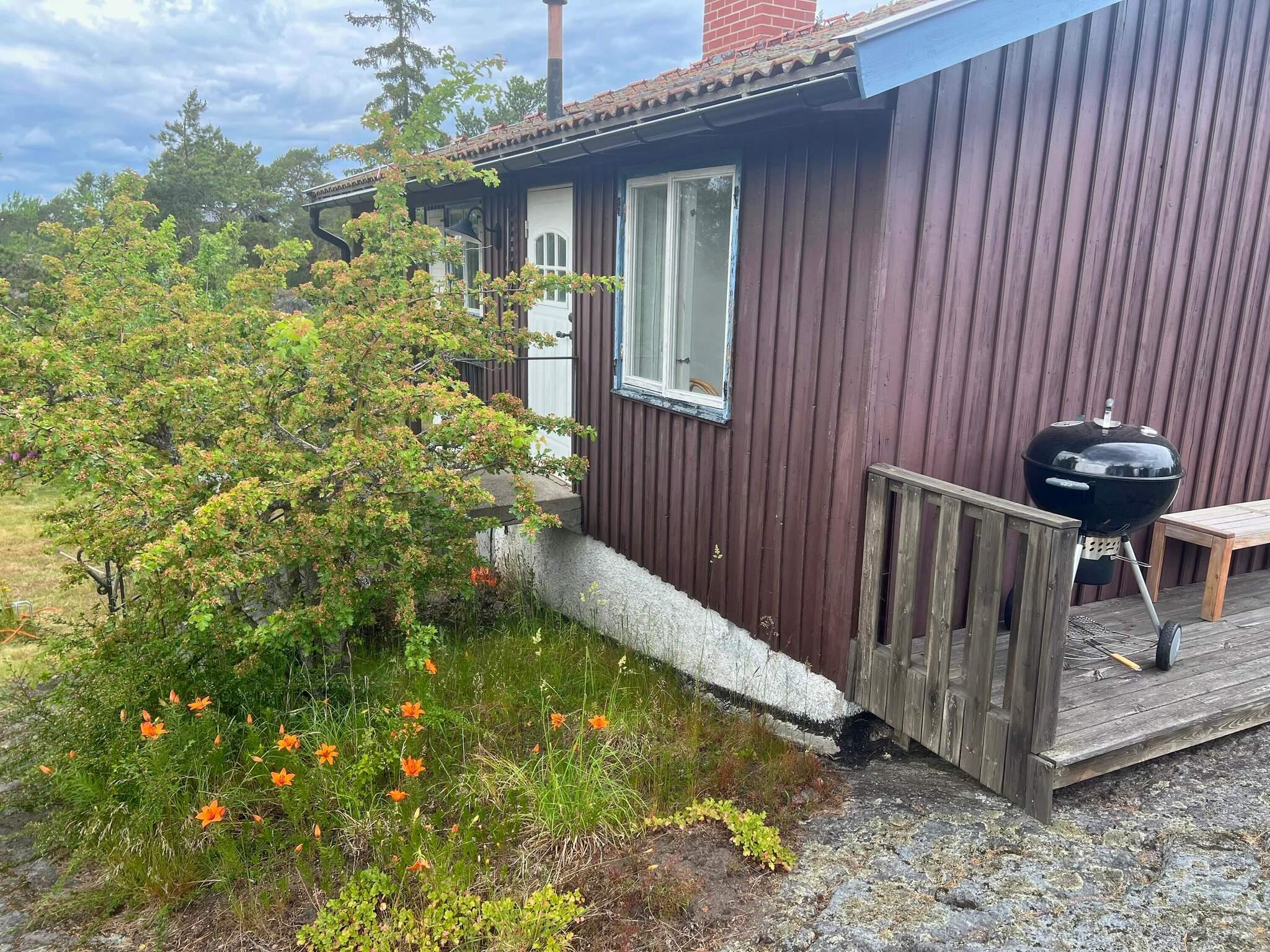 Den har mysiga stugan på Värmdö ligger insynsskyddad uppe på ett berg med knotiga tallar och fina berg i dagen med mossa och stenväxter. En lite gräsmatta finns framför huset.