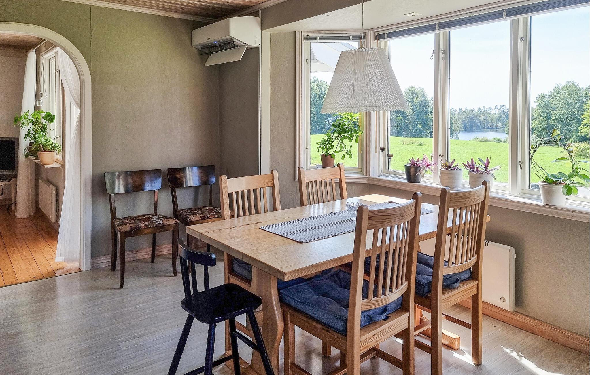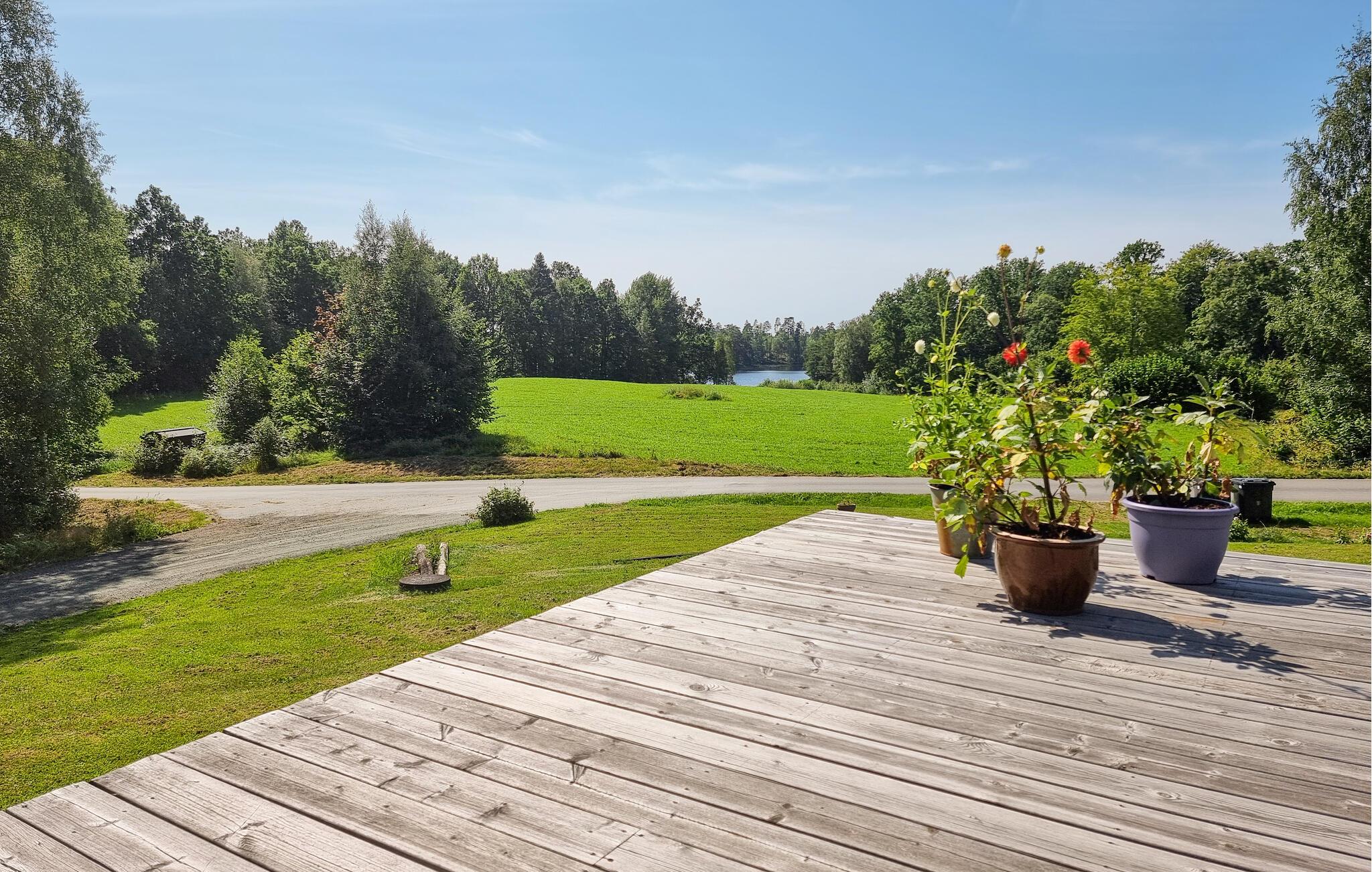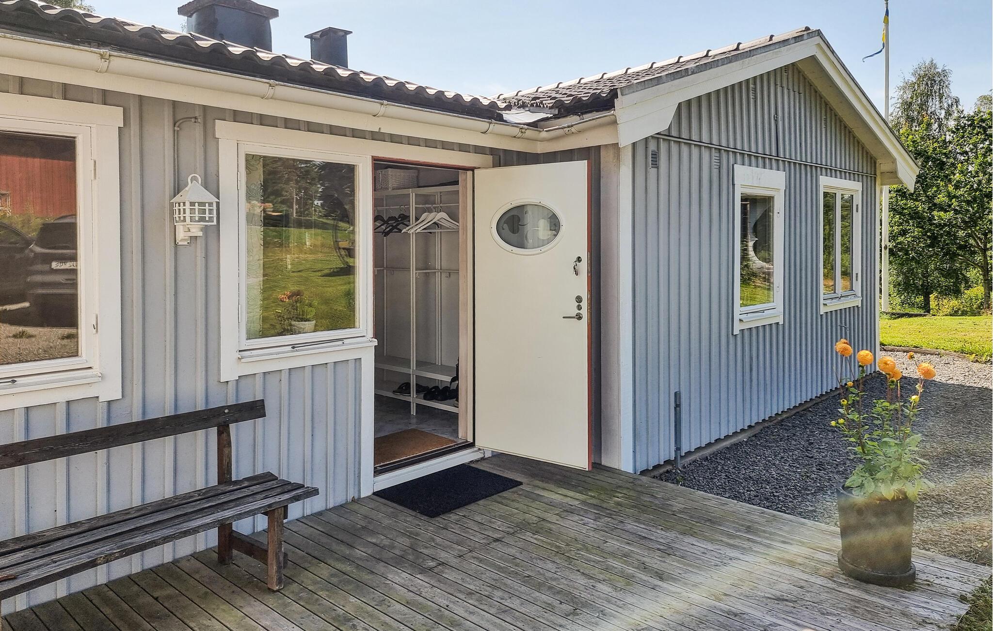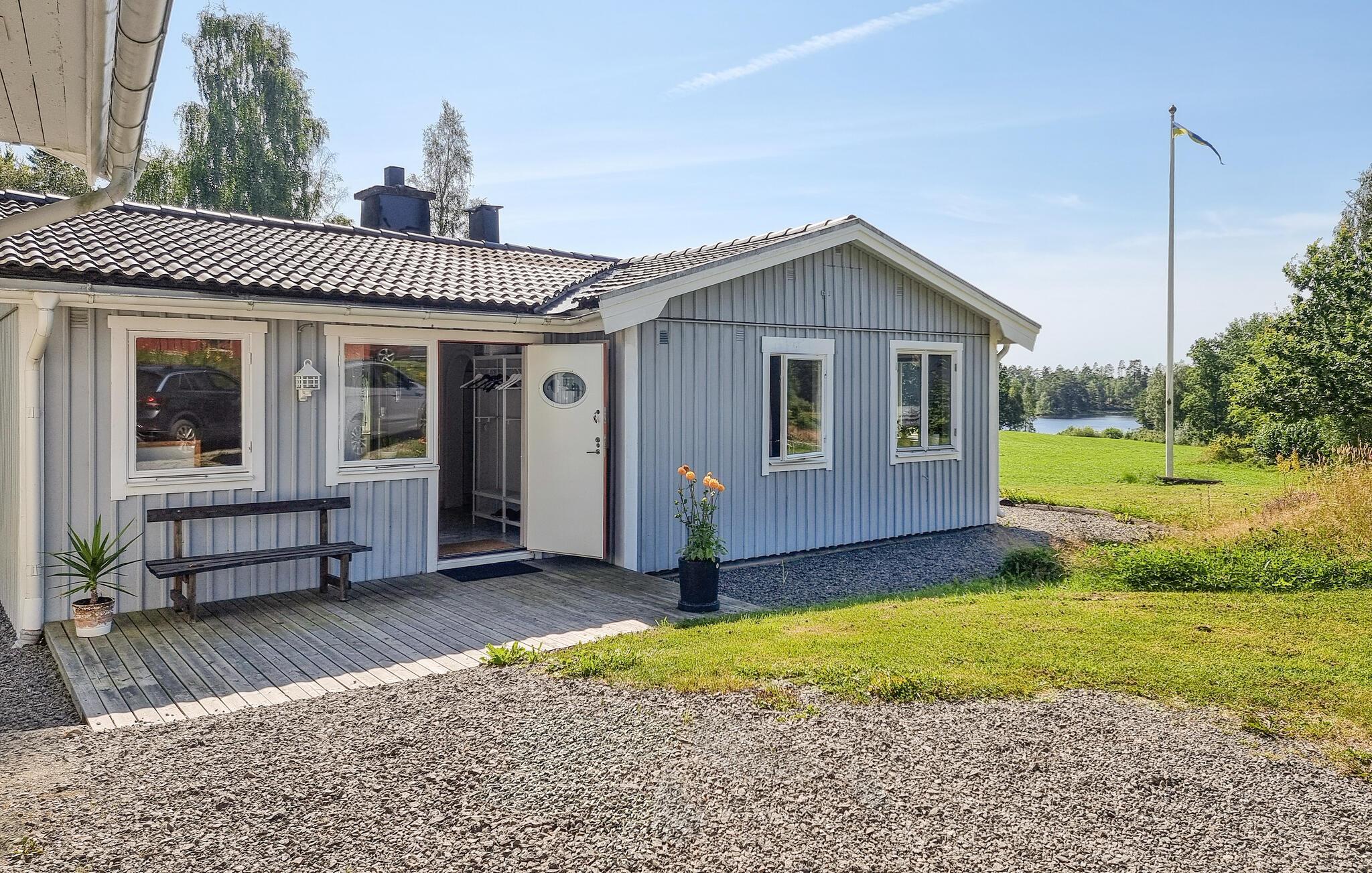 Nyd en afslappende ferie i dette hyggelige feriehus med idylliske omgivelser. Pak jeres tasker, og glæd jer til at finde jer til rette i dette lyse og indbydende feriehus nær en rolig sø. I det smukke landkøkken kan I trylle jeres yndlingsretter frem, og ved det indbydende spisebord kan I nyde harmoniske måltider med en charmerende udsigt over søen. Efter en lang dag udenfor inviterer den komfortable sofa jer til at slappe af og læse – eller til at holde en sjov spilleaften med familien. Jeres veranda giver en dejlig mulighed for at nyde morgenmaden udenfor i solskinnet. Bagefter kan I slentre ned til søen for en forfriskende dukkert og derefter tænde op i grillen. Gå en tur langs træbrogader gennem hedelandskabet i Store Mosse Nationalpark, bliv inspireret af moderne kunst på Vandalorum Museum i Värnamo, eller besøg historiske bondegårde i Apladalen. Overrask jeres børn med en tur til High Chaparral Western Park, oplev kunsten at puste glas i Smålands glasværker, og prøv regionale specialiteter på hyggelige gårdcaféer.