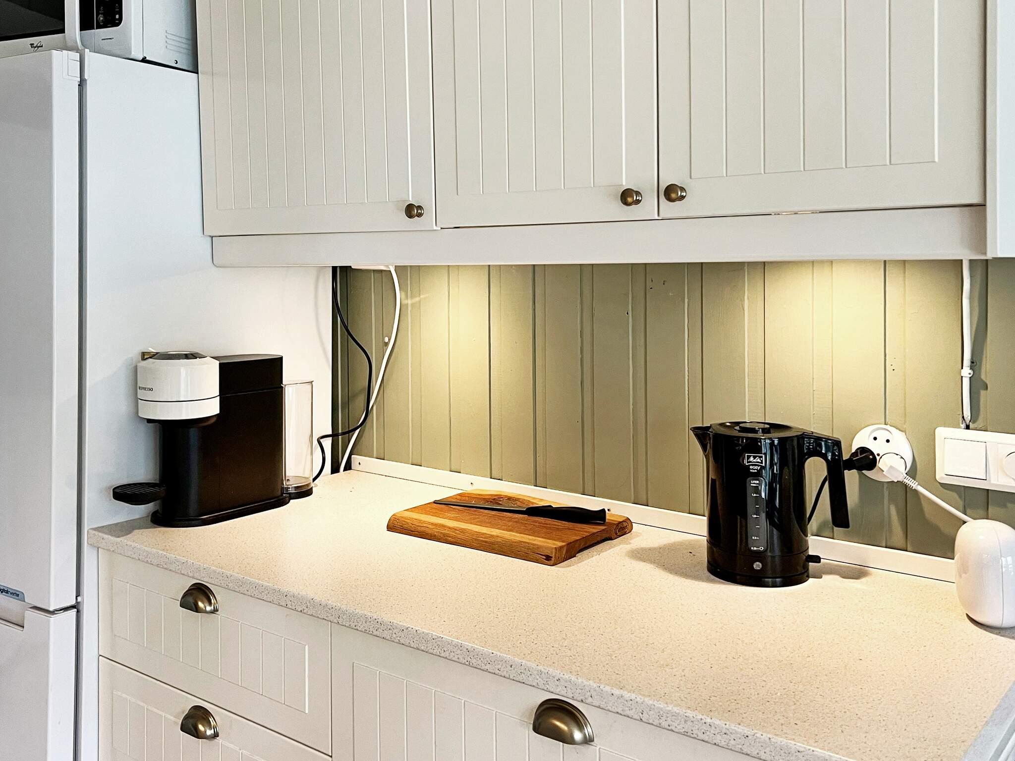 Køkken: El-komfur, køle-frys, mikroovn, kaffemaskine, vand fra brønd