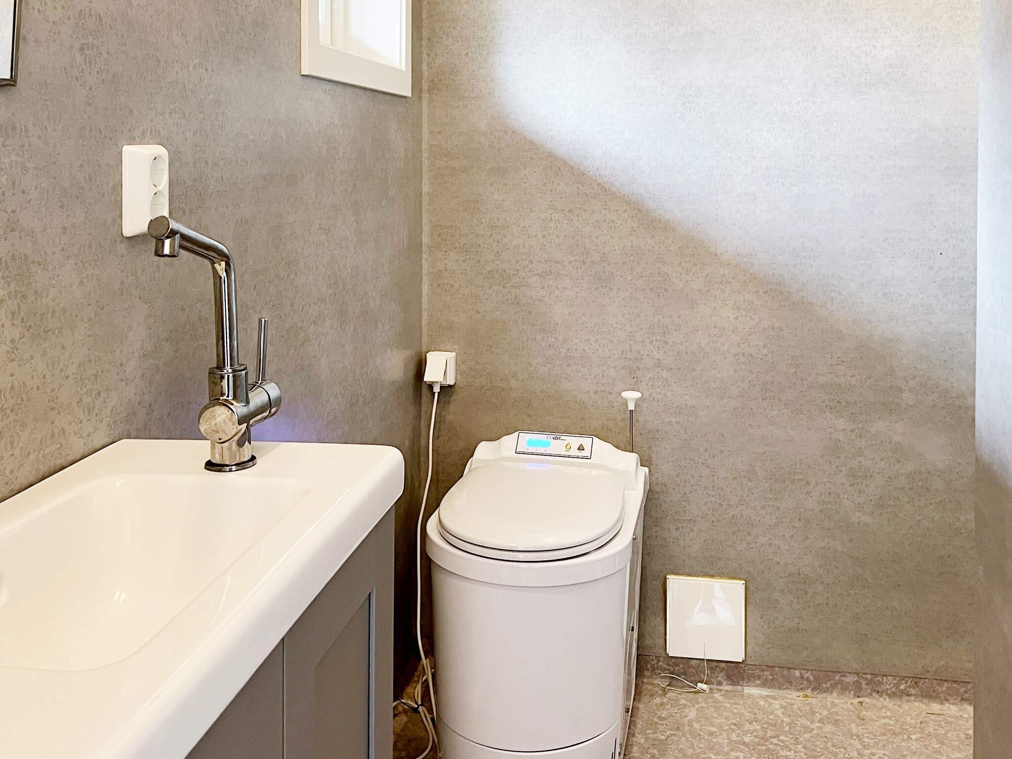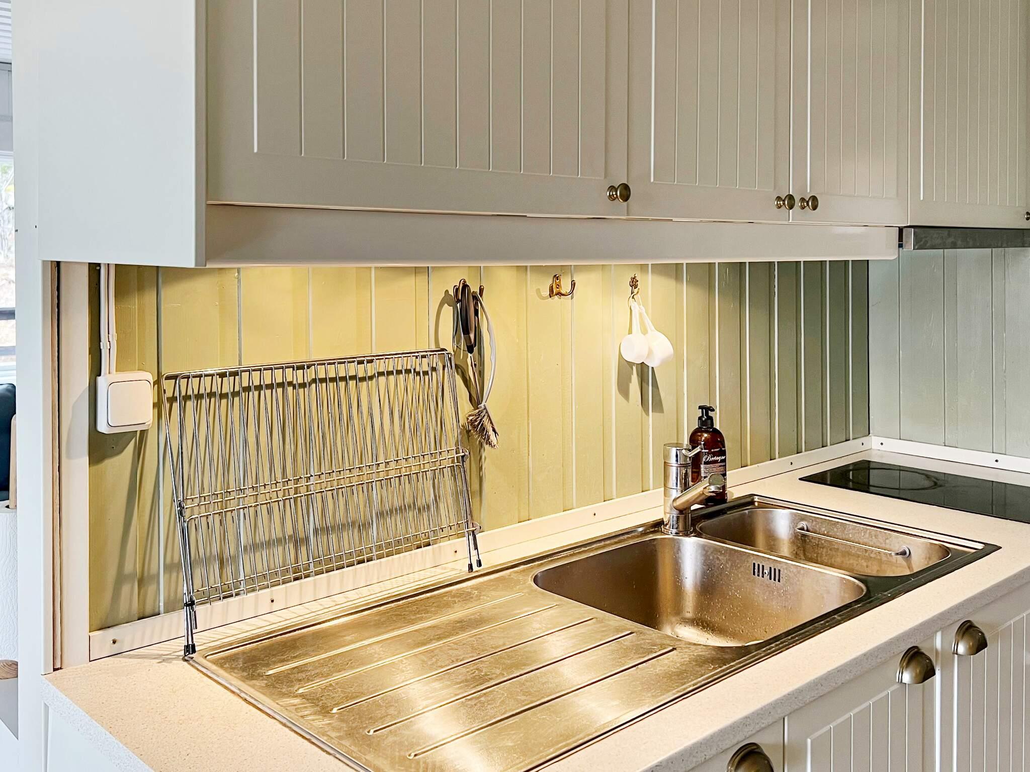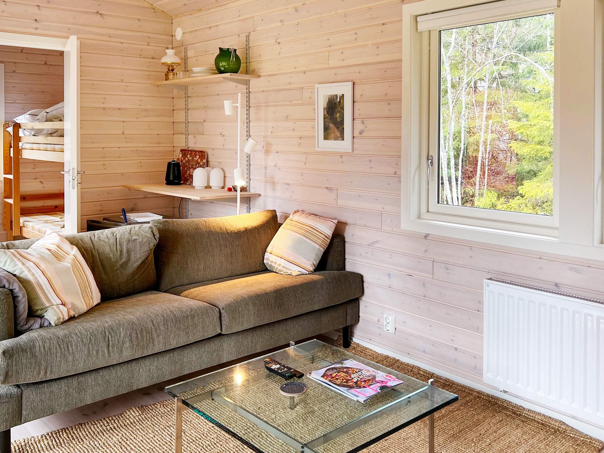 I den nybyggda vackert inredda gäststugan finns ett vardagsrum med kamin, ett litet kylskåp och vattenkokare. De finns två sovrum, det ena med en våningssäng och en med en säng på 120 cm. Det rummet har en egen utgång till terrassen utanför. Här finns ett badrum med eltoalett, men ingen dusch.
