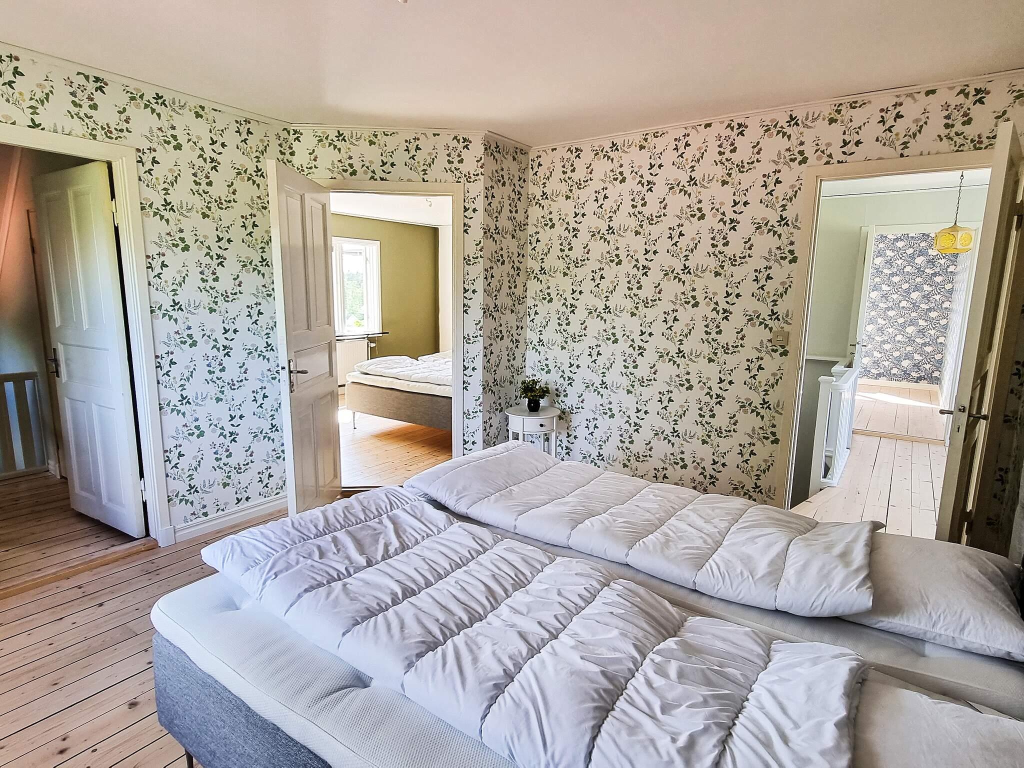 På övre plan har ni tre sovrum med en dubbelsäng i varje (varav två ihopsatta 90 cm sängar i ett rum), kvalitetssängar från Mio inköpta 2023. Två mindre sovalkover med en 90 cm säng i varje. Så här kan ni verkligen sprida ut er och sova gott! Badrum i lite äldre stil med WC, badkar och handfat. Luftig balkong där ni njuter av utsikten och kanske ser tranorna som häckar i området.