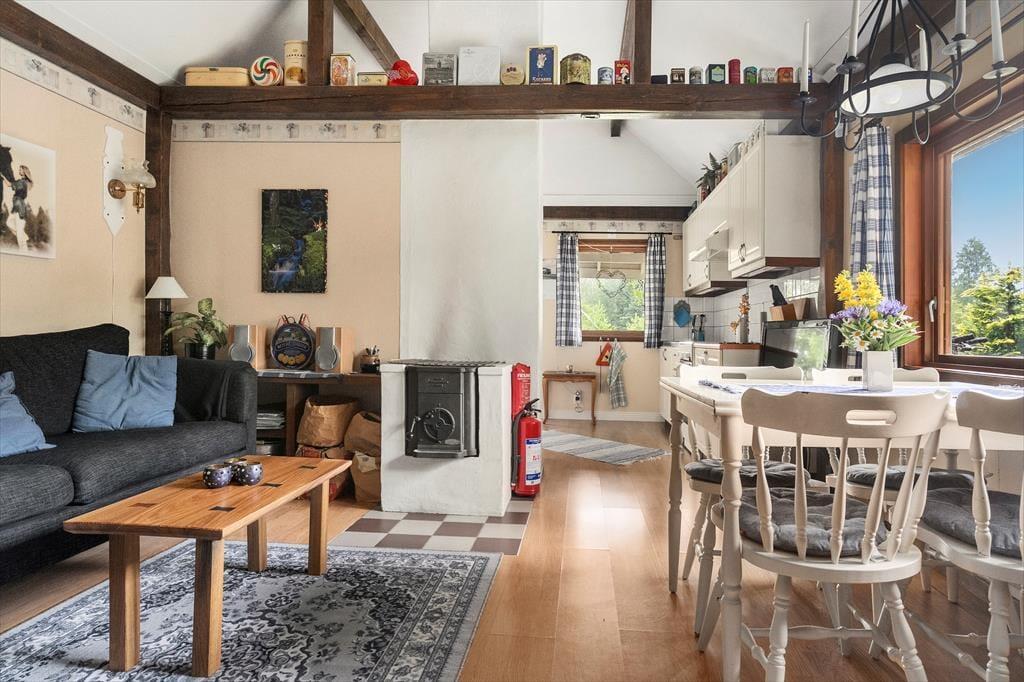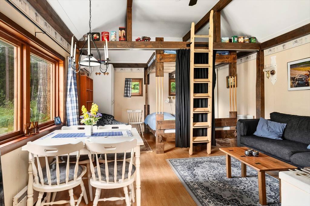Det vinterisolerede sommerhus fra 2003 tilbyder omkring 35 m² funktionel og hyggelig bolig. Opholdsrummet kombinerer stue, spiseplads og køkken i ét åbent og indbydende miljø. En brændeovn og elradiatorer sørger for varme på køligere dage. Der er WiFi tilgængeligt. Det fuldt udstyrede køkken indeholder alt, hvad du har brug for: elkomfur, ovn, køleskab med fryser, mikrobølgeovn, kaffemaskine og brødrister. I opholdsområdet finder du en sofa og et fjernsyn – perfekt til afslappede aftener efter en dag i naturen. Soveområdet er åbent til opholdsrummet og har plads til op til fire personer med en hyggelig dobbeltseng i etagesengsformat. En tremmeseng til de mindste kan lånes efter forudgående aftale. Badeværelset er simpelt, men funktionelt, og har bruser og toilet. En vaskemaskine kan benyttes efter aftale med udlejeren.