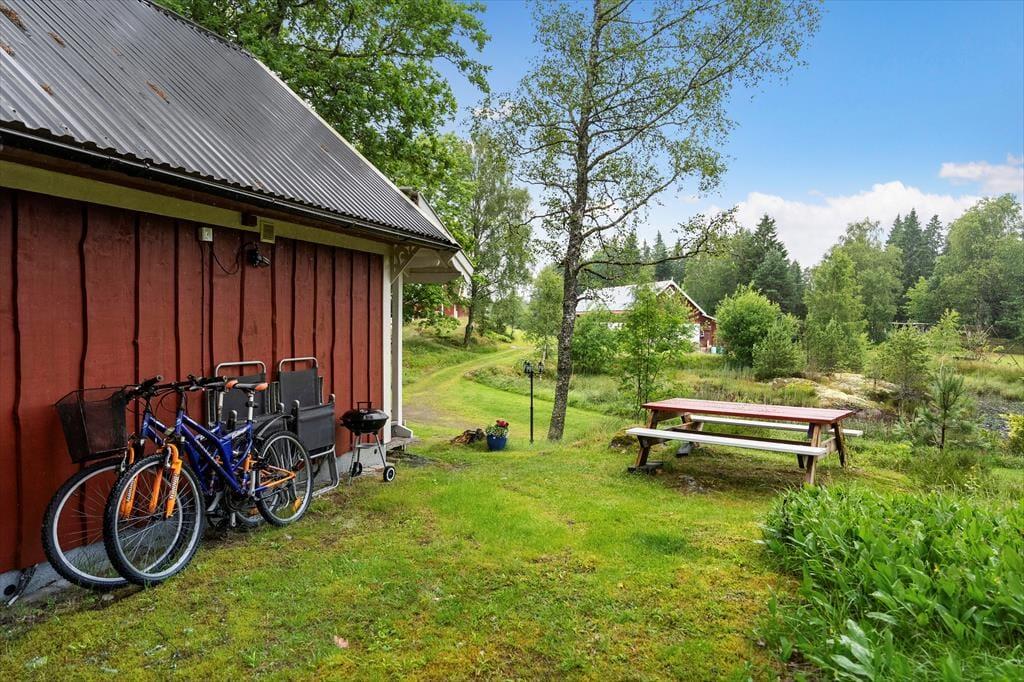 Udenfor venter en stor have med flere siddeområder, havemøbler og en grillplads. Den store lege- og solplæne indbyder til leg, boldspil eller ren afslapning. Et kano står til din rådighed, så du kan udforske de nærliggende vande. Op til fire voksen-cykler kan lejes efter aftale på stedet. Der er parkering direkte ved huset, og på verandaen kan du nyde morgenkaffen med udsigt til grønne omgivelser.