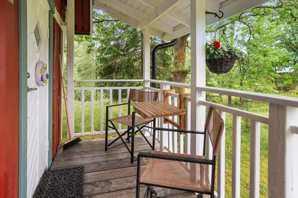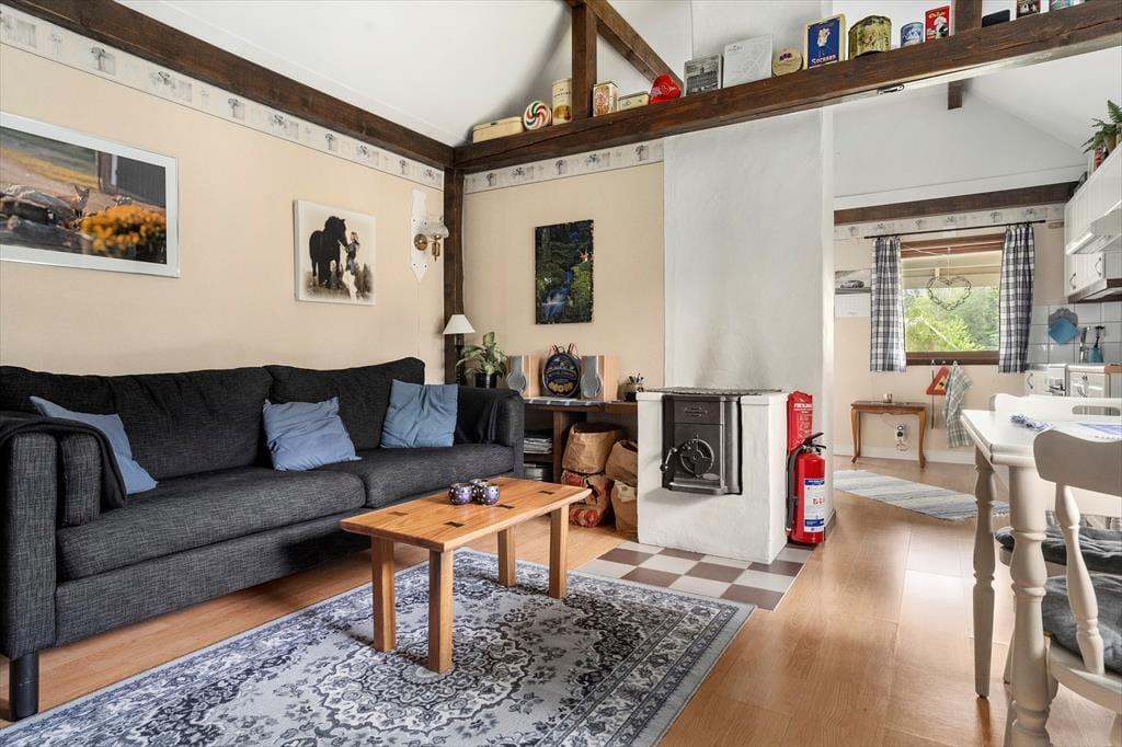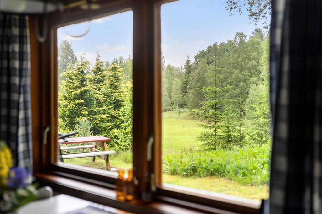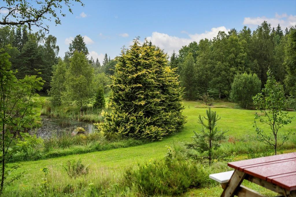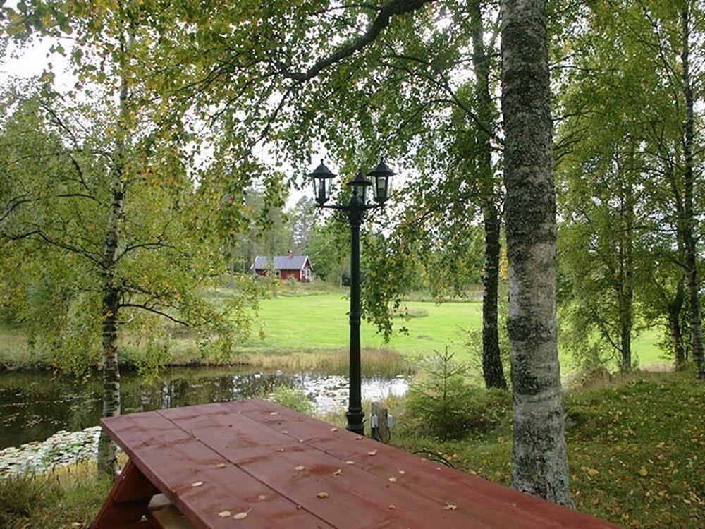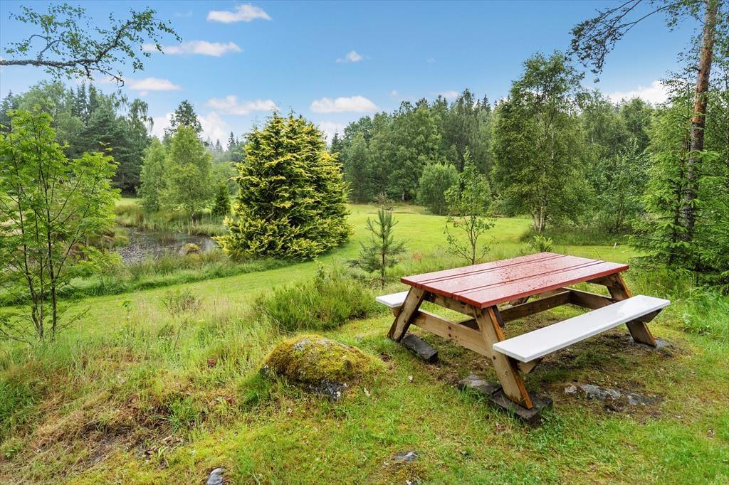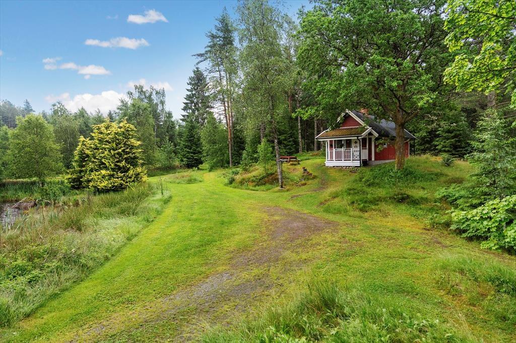 Dette charmerende lille sommerhus ligger idyllisk placeret midt på en cirka 10.000 m² stor naturgrund – et sandt paradis i ugenert beliggenhed for dem, der søger ro, og for børnefamilier. Omgivet af enge, en åkandedam og en rislende bæk, kan du her finde fred og nyde det åbne sydsvenske landskab. Den nærmeste nabo – udlejeren – bor cirka 50 m væk, dog afskærmet, så dit privat ferieliv bevares. Den nærliggende sø Sandsjön med lavt, børnevenligt badeområde, badebro og grillplads ligger kun cirka 500 m fra huset. Nærmeste indkøbsmulighed er i Ljurhalla, ca. 8 km væk, og til byen Alingsås, kendt for sine mange caféer, er der 25 km.