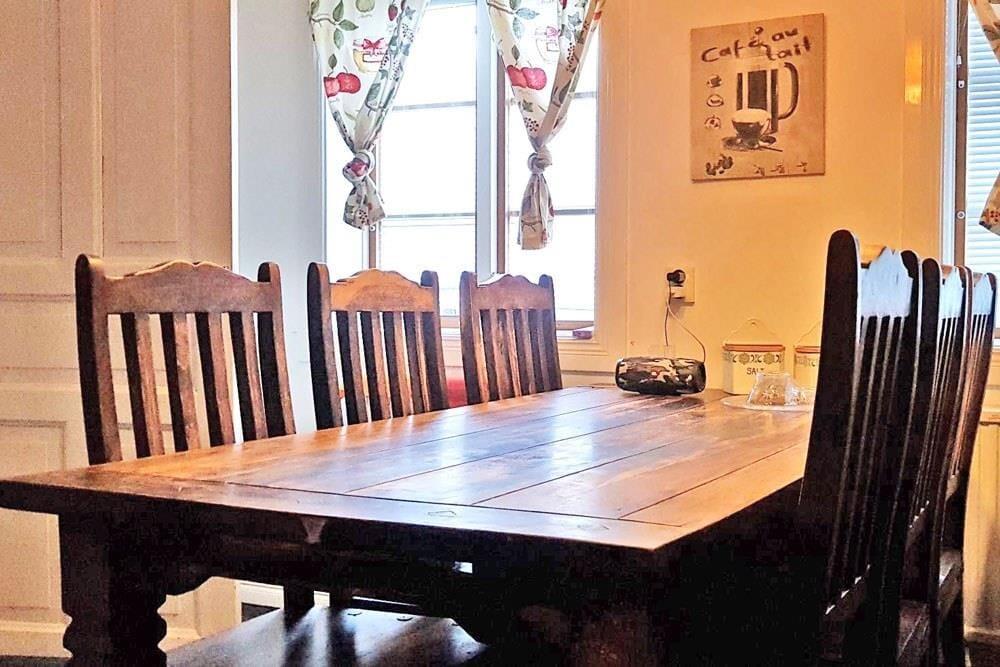 Det toetagers bolighus fra 1911, som er bevaret i sin oprindelige stil, byder på ca. 90 m² hyggelig atmosfære med nostalgisk charme. I alt står fire værelser, et fuldt udstyret køkken, badeværelse med toilet samt seks sovepladser til rådighed. Det moderne køkken, hvor den gamle brændeovn er bevaret, har elkomfur med fire kogeplader og ovn, opvaskemaskine, køle-/frysekombination, mikrobølgeovn, kaffemaskine og brødrister samt et stort spisebord. Fra en lys karnap med siddeplads har du udsigt over søen. En yderligere siddeplads samt et fjernsyn findes i stuen. Af de tre soveværelser har ét en dobbeltseng, mens de to andre hver har to enkeltsenge. En tremmeseng til småbørn er også tilgængelig. Badeværelset har toilet, bruser og vaskemaskine – perfekt til længere ophold. Udendørs står havemøbler til rådighed, og efter aftale kan du også leje cykler hos husejeren.