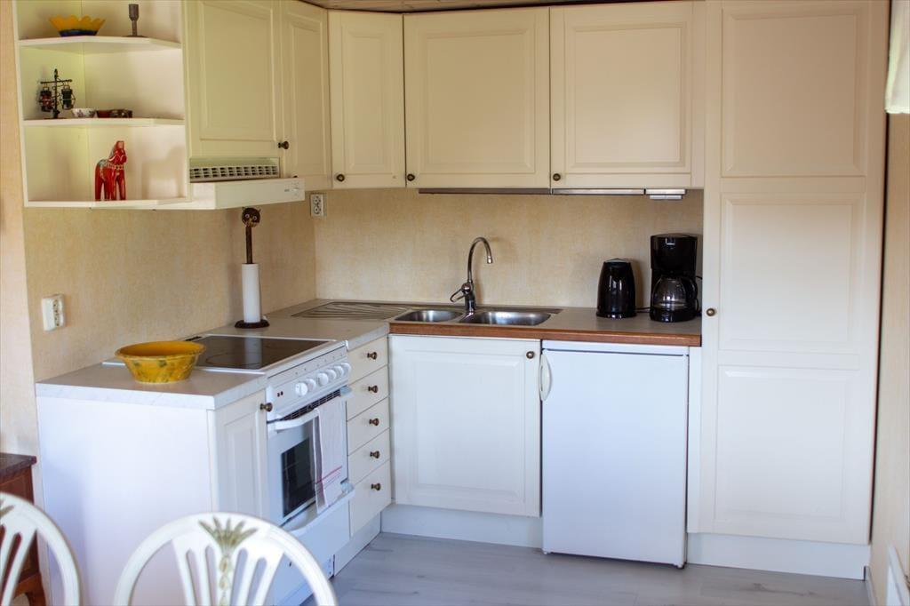 Det cirka 35 m² store feriehus har et kombineret opholds- og køkkenområde med en hyggelig svensk køkkenbænk. Køkkenet er udstyret med elkomfur, ovn, køleskab, kaffemaskine og spisebord. Soveværelset har en dobbeltseng og en køjeseng, så der er plads til i alt fire personer. Badeværelset har varmt vand, bruser og toilet. Vaskemaskine kan benyttes efter aftale. Elektrisk opvarmning og delvis gulvvarme sørger for varme. Udendørs finder du havemøbler, grill og en græsplæne til leg og afslappning. Din bil kan parkeres ved ferieboligen. Derudover hører en egen robåd til huset, så du kan udforske Storsøen. Cykler kan også stilles til rådighed efter aftale.