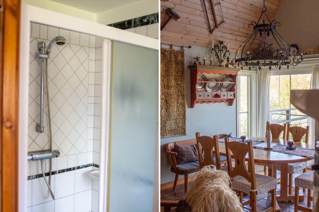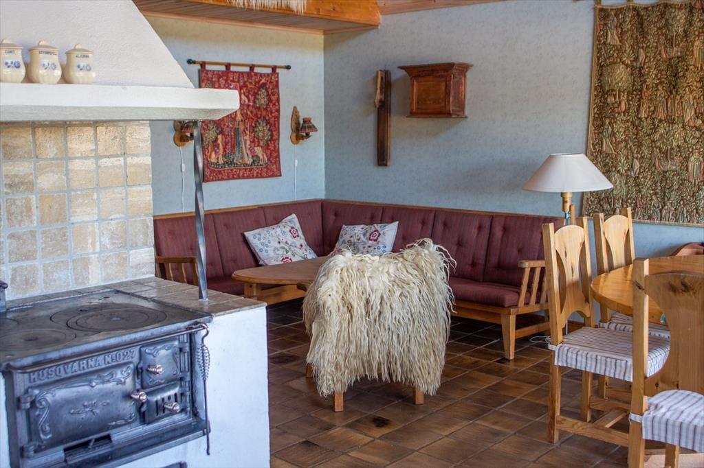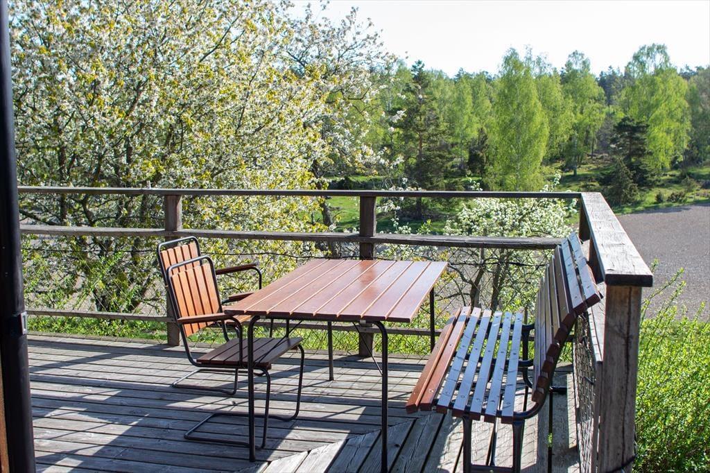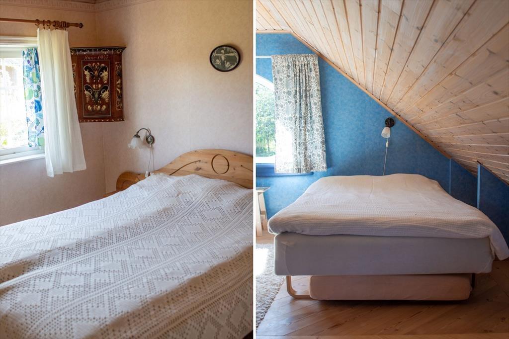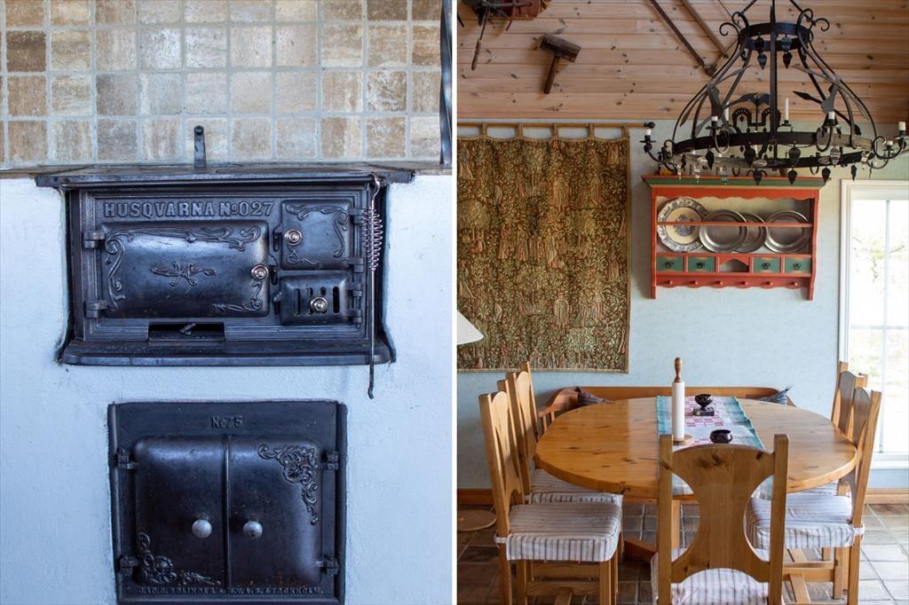 Sommerhuset, som har kælder og er fordelt over halvanden etager, tilbyder ca. 90 m² til op til syv gæster. I stueetagen findes et åbent opholdsrum med køkken og en smuk gammel brændeovn, der er forsynet med en emhætte og en nyere brændeovn mod opholdsområdet. Det moderne og smagfuldt indrettede køkken er udstyret med elkomfur med ovn, køle- og fryseskab, opvaskemaskine, mikroovn, kaffemaskine og brødrister. Køkkenet er forbundet med en spiseplads med fem stole og en typisk svensk bænk til to personer. Ved siden af spisepladsen er der en hjørnesofa og et fladskærms-tv (svenske kanaler), og herfra fører en for ikke-svenskere lidt uvant stejl trappe op til den delvist udbyggede førstesal. I stueetagen findes desuden et badeværelse med bruser, toilet og håndvask samt to soveværelser – det ene med en dobbeltseng, det andet med en sovesofa til to personer. Fra galleriet på førstesalen er der udsigt over spiseområdet, som er beklædt med træ helt op til taget. Oppe under skråvæggene er der to enkeltsenge og et bord med fire stole; derudover kan der stilles madrasser til rådighed ved behov. I kælderen findes en sauna med yderligere bruser samt et motionsrum med kondicykel – perfekt til køligere dage. Der er trådløs internetadgang (Wi-Fi) til gæsternes rådighed. En stor veranda med havemøbler og en kulgrill indbyder til udendørs hygge. Hos udlejerne kan der også lånes cykler til både børn og voksne.