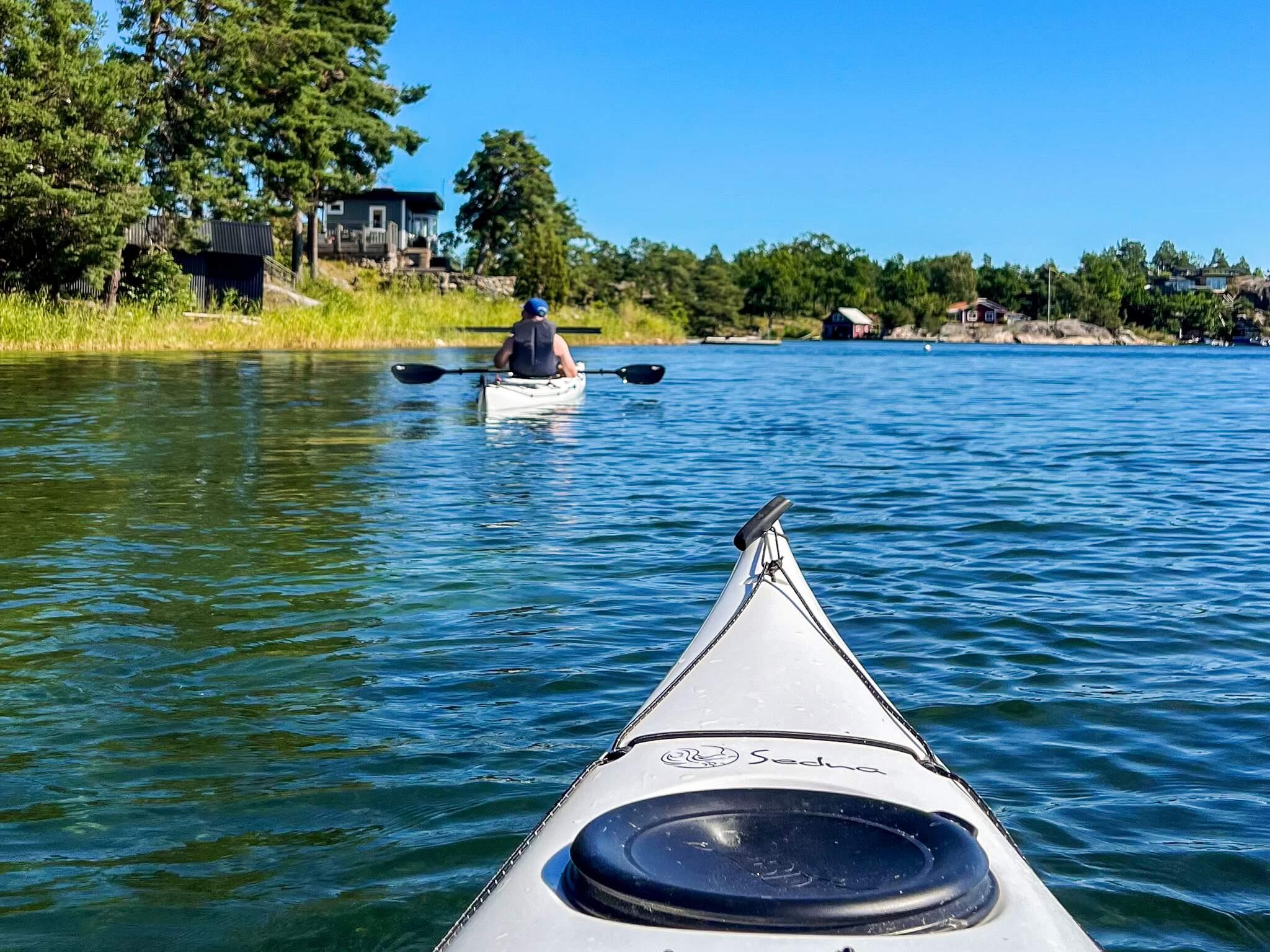Två ensitsiga kajaker och flytvästar ingår