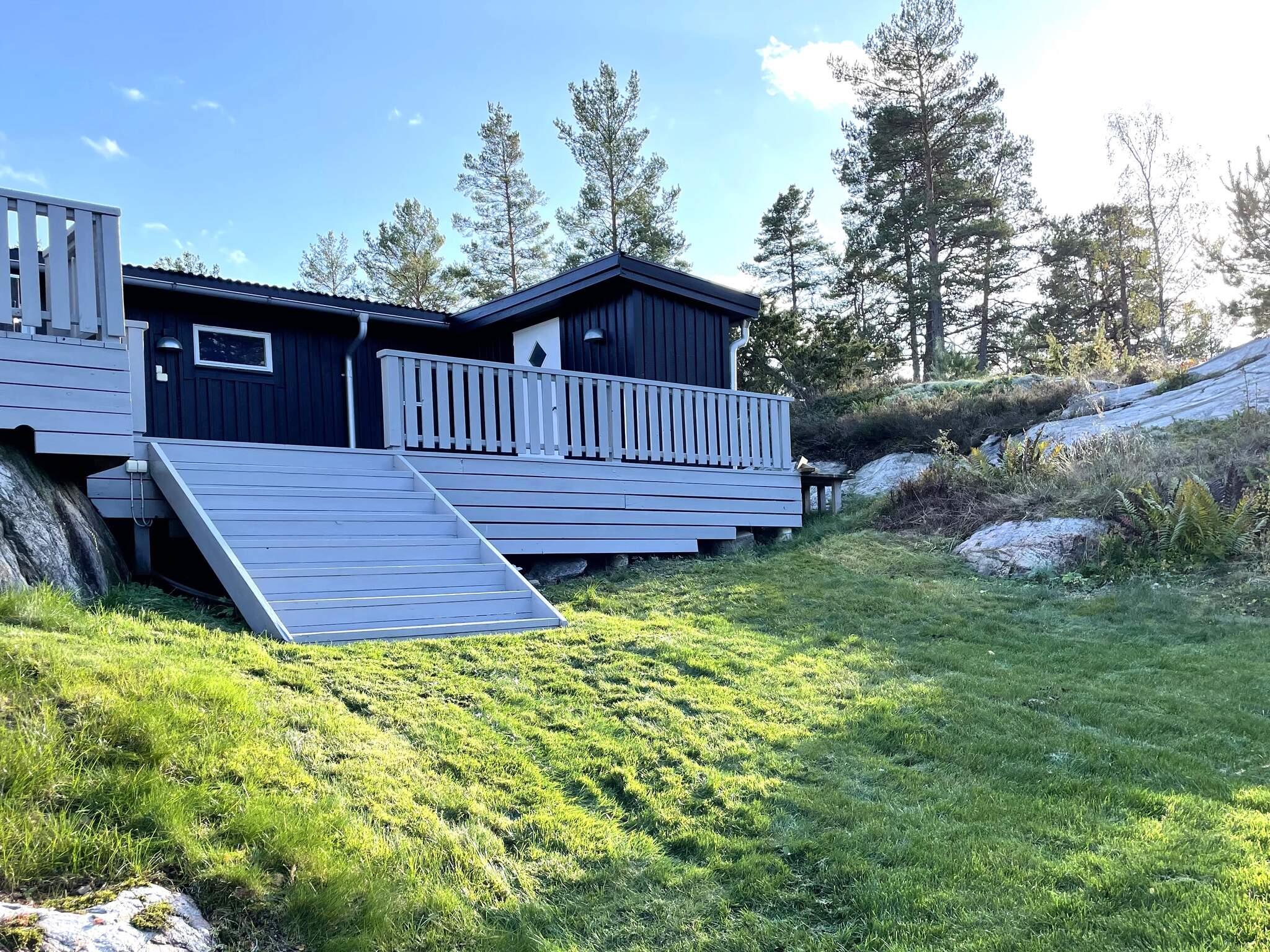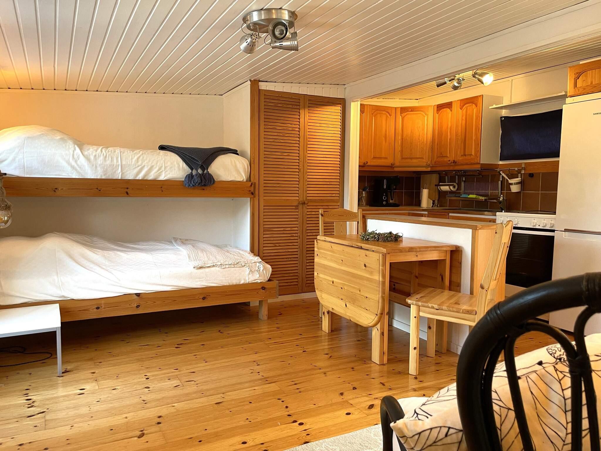 Inomhus möts ni av ett ljust allrum med köksdel, sittgrupp och våningssäng. I sovrummet fins en bekväm dubbelsäng och badrummet ligger i direkt anslutning. Från allrummet når ni baksidans nyrenoverade soldäck med loungegrupp och delvis skymd havsutsikt. Nedanför huset breder en gräsmatta ut sig som leder vidare ner mot vattnet.