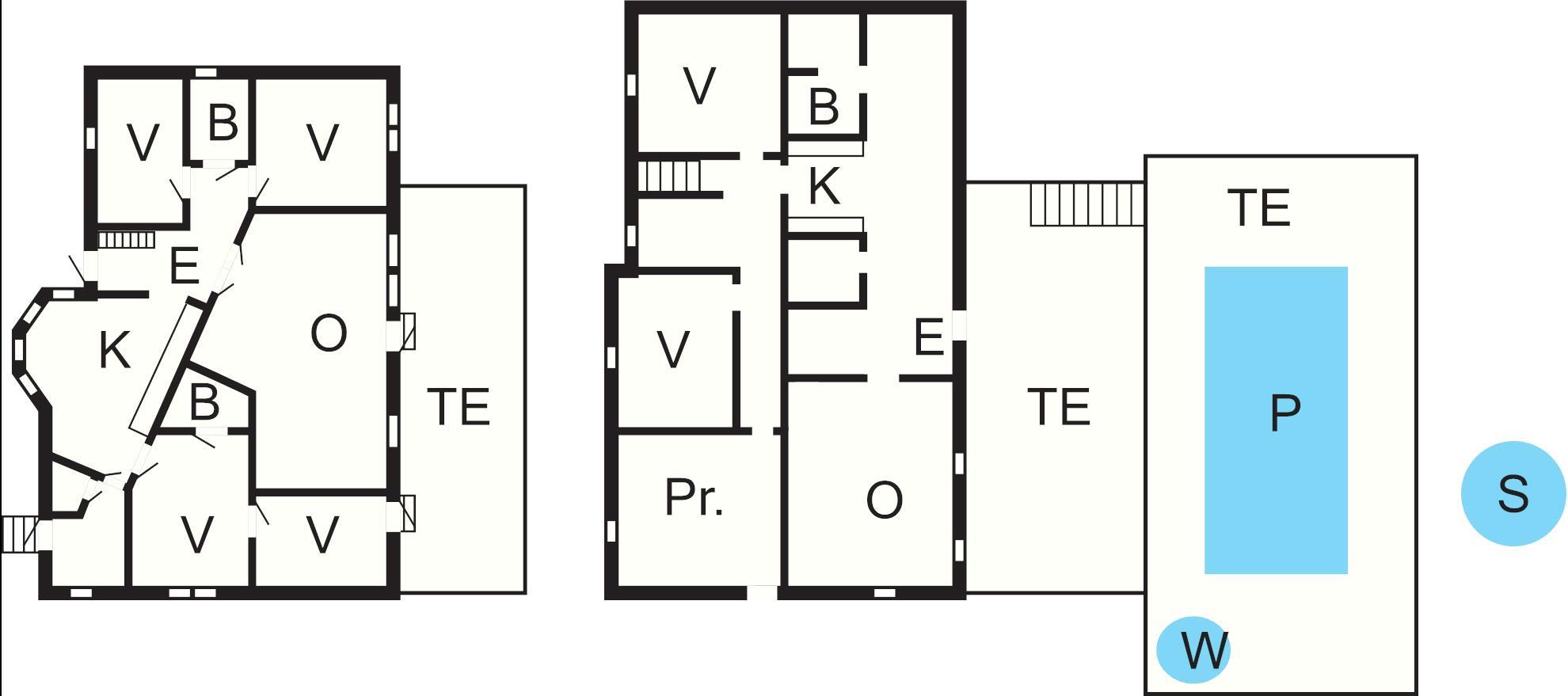 6 Soveværelser: (2S)+(1DS)+(1DS)+(1DS)+(2S)+(1DS), barneseng