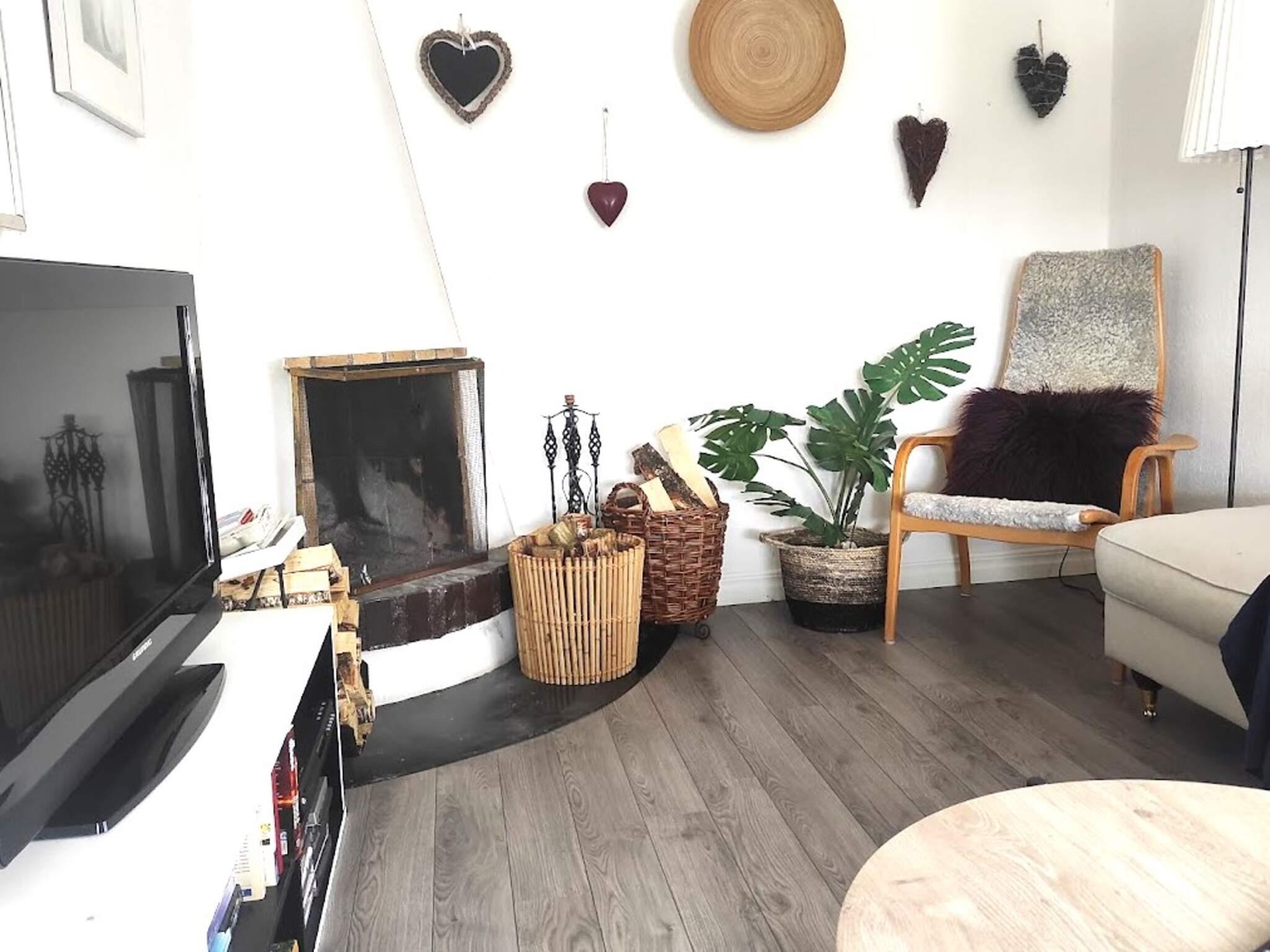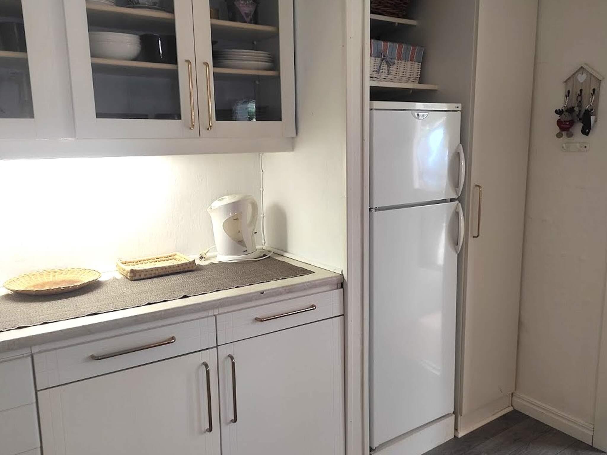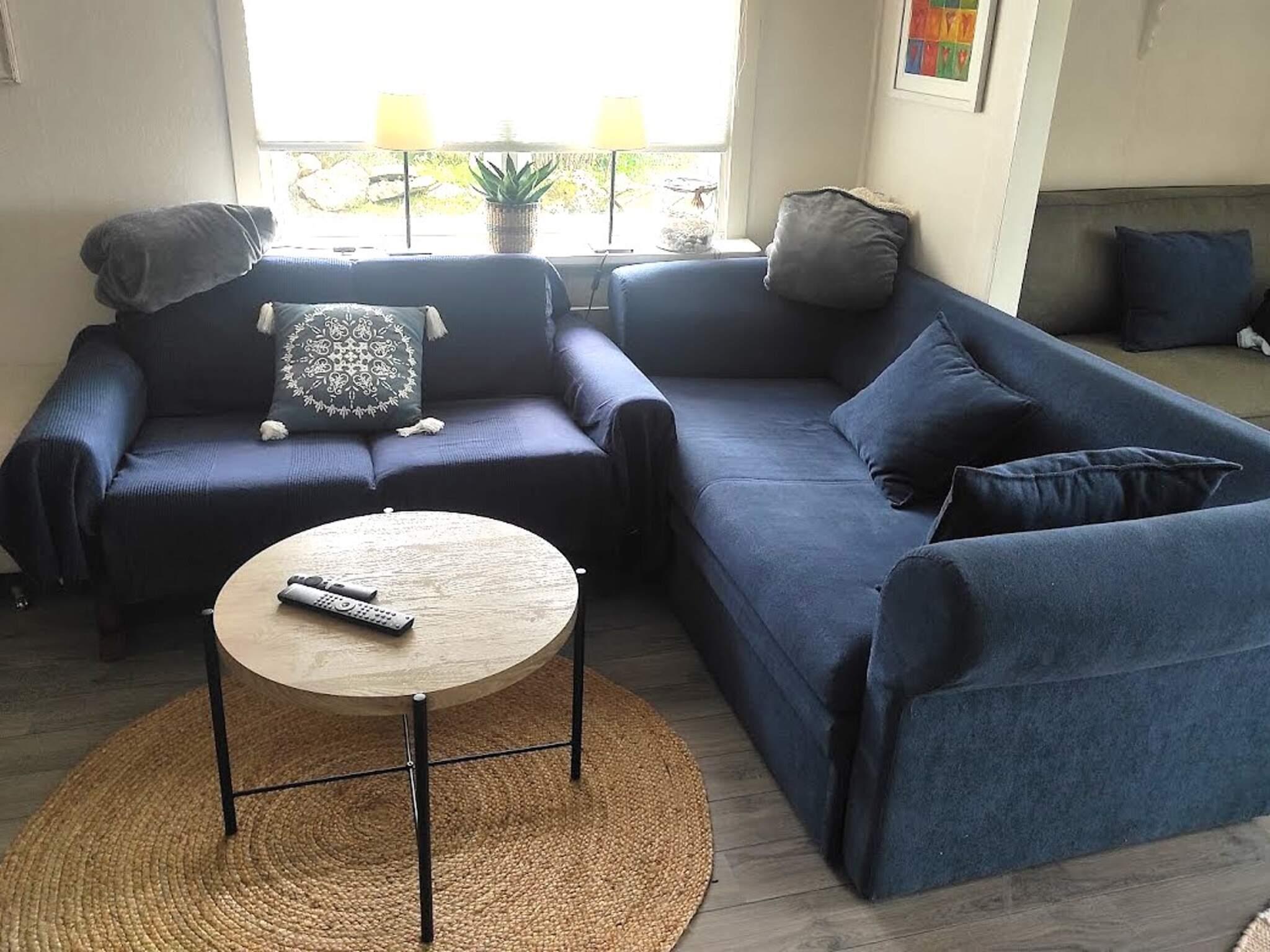 I det ljusa vardagsrummet kan du njuta av två bekväma soffor som enkelt kan omvandlas till sängar och en TV för avkoppling. Rummet har också en charmig vedspis som skapar en mysig atmosfär under svala sommarkvällar. Köket är fullt utrustat med allt du behöver och ett matbord med plats för fyra personer, där ni kan njuta av måltider tillsammans. Det finns ett sovrum med en stor dubbelsäng. Badrummet är praktiskt med toalett och dusch, och handfatet ligger precis utanför toaletten. På den täckta terrassen kan du njuta av ditt morgonkaffe i lugn och ro eller grilla kvällens middag.