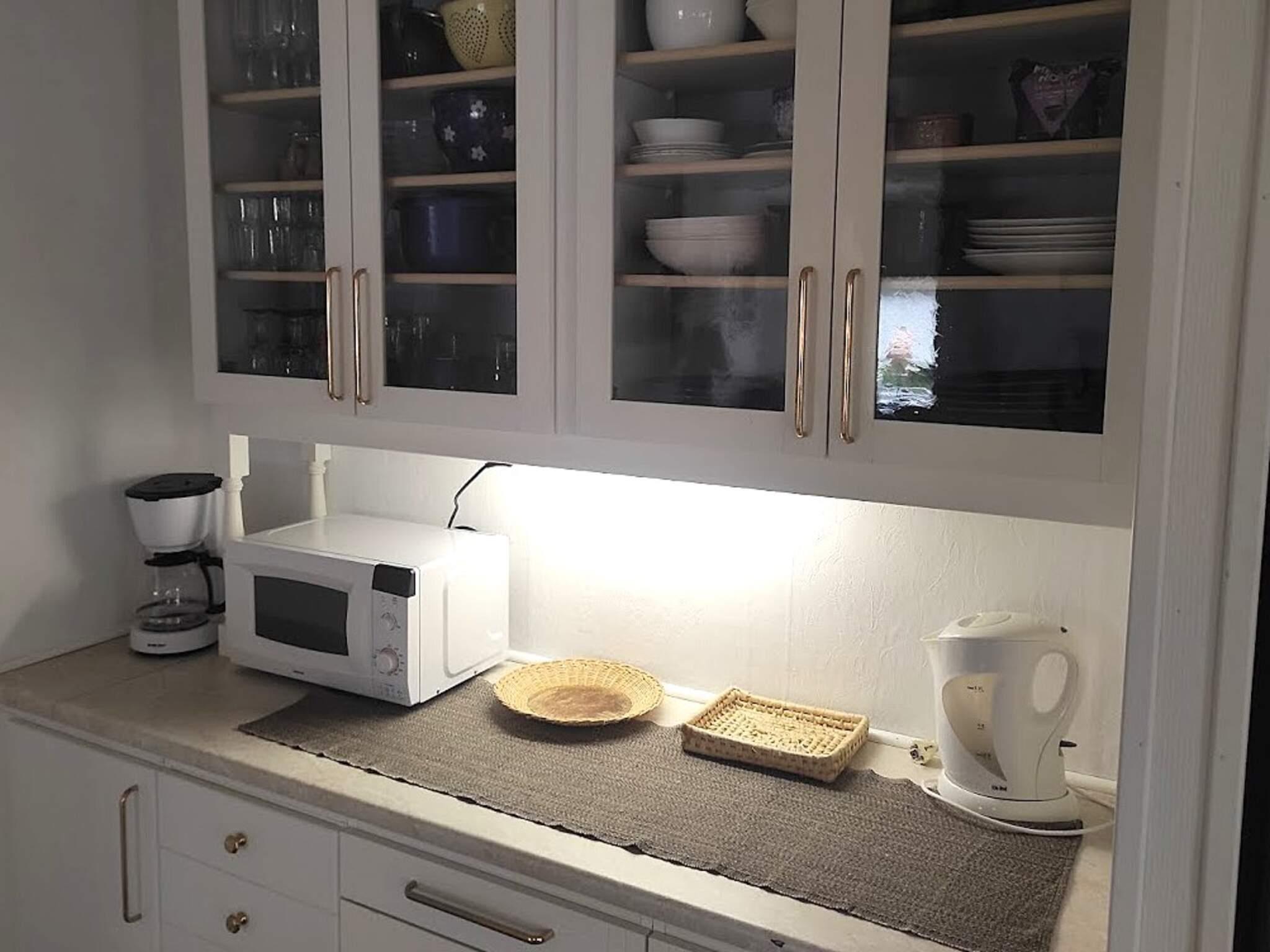 Køkken: El-komfur, elkogepl., ovn, køle-frys, mikroovn, kaffemaskine