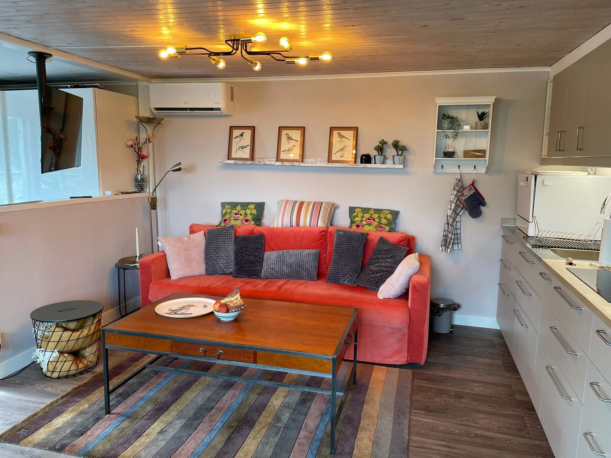 Stugan består av ett större allrum med en välutrustad köksdel och en matplats vid fönstret där ni kan blicka ned mot Hjälmarens vatten. En mjuk och bekväm soffa där ni kan sitta och vila efter dagens aktiviteter, kanske titta på något avkopplande på tv’n. Nattetid omvandlas soffan till en bekväm säng.