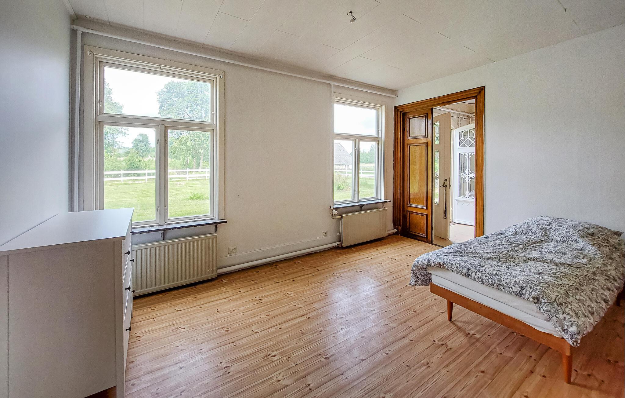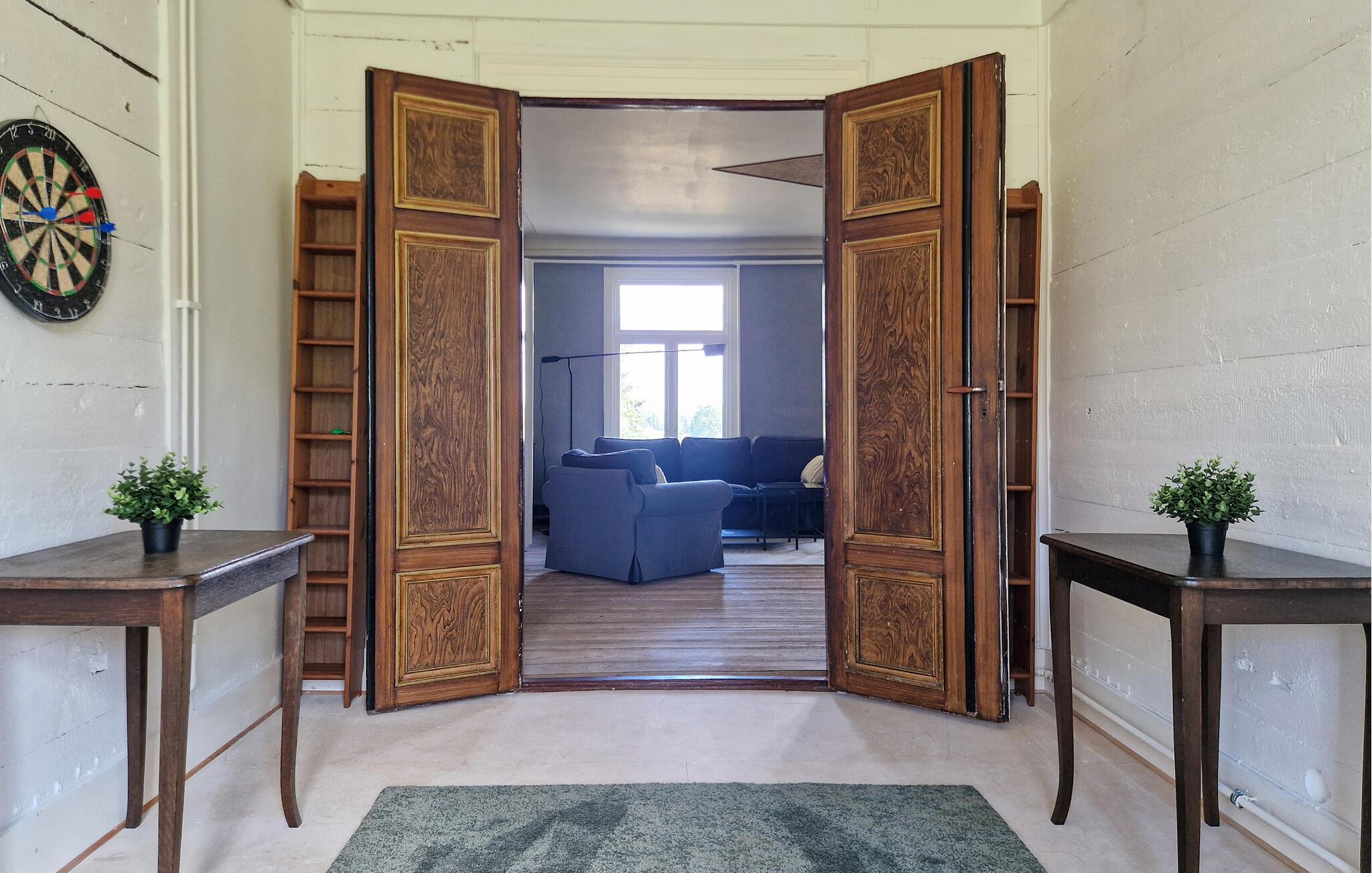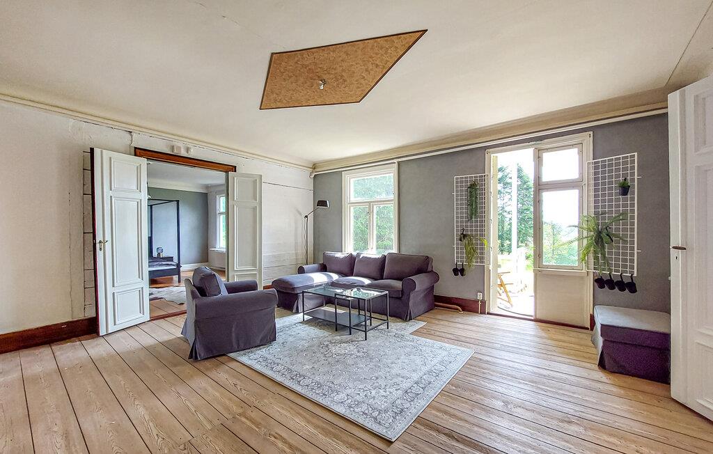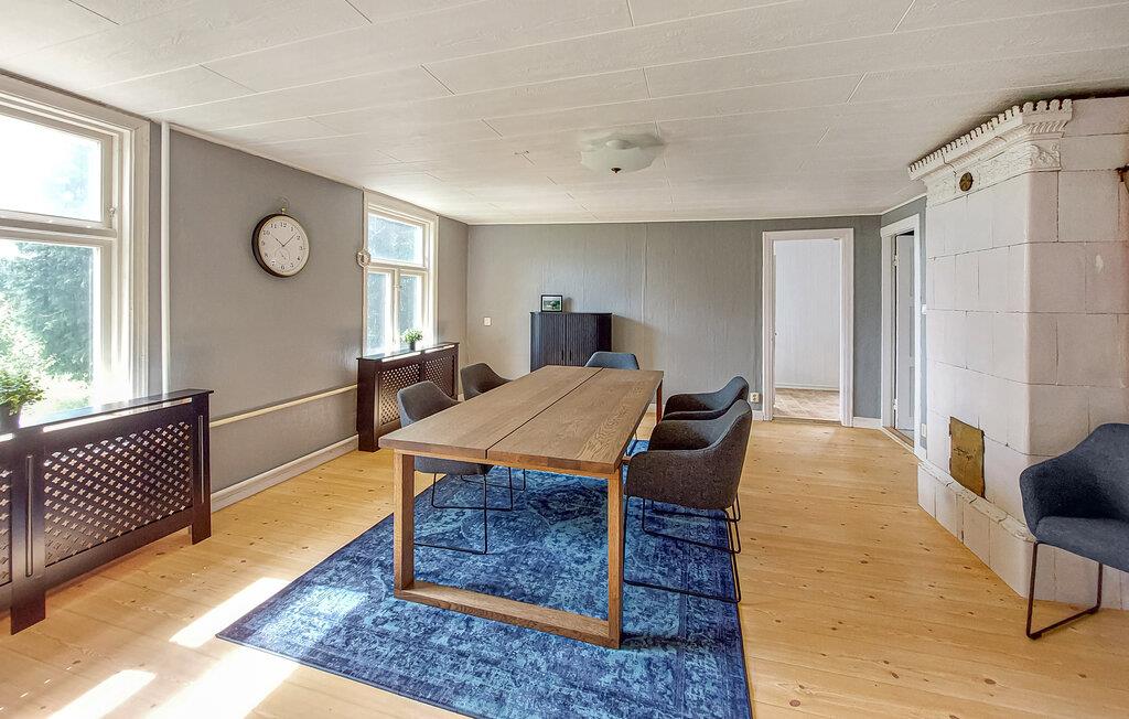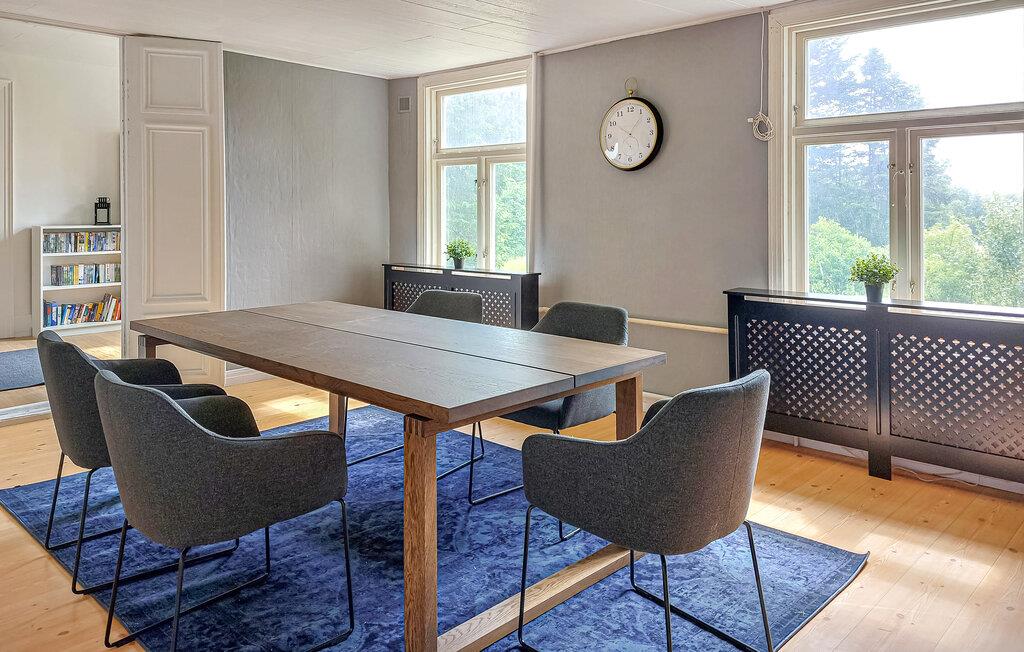 I dette rummelige, gamle herregårdshus kombineres komfort og rustik stil for at skabe en hyggelig atmosfære. Store vinduer lukker varmt naturligt lys ind, mens komfortable sofaer lægger op til at slappe af og snakke. Fordyb jer i en god bog i det lille bibliotek eller lav et lækkert måltid til jer selv og familien i det praktiske køkken.