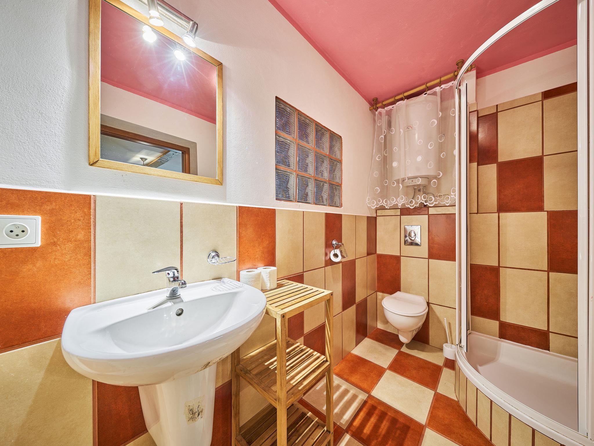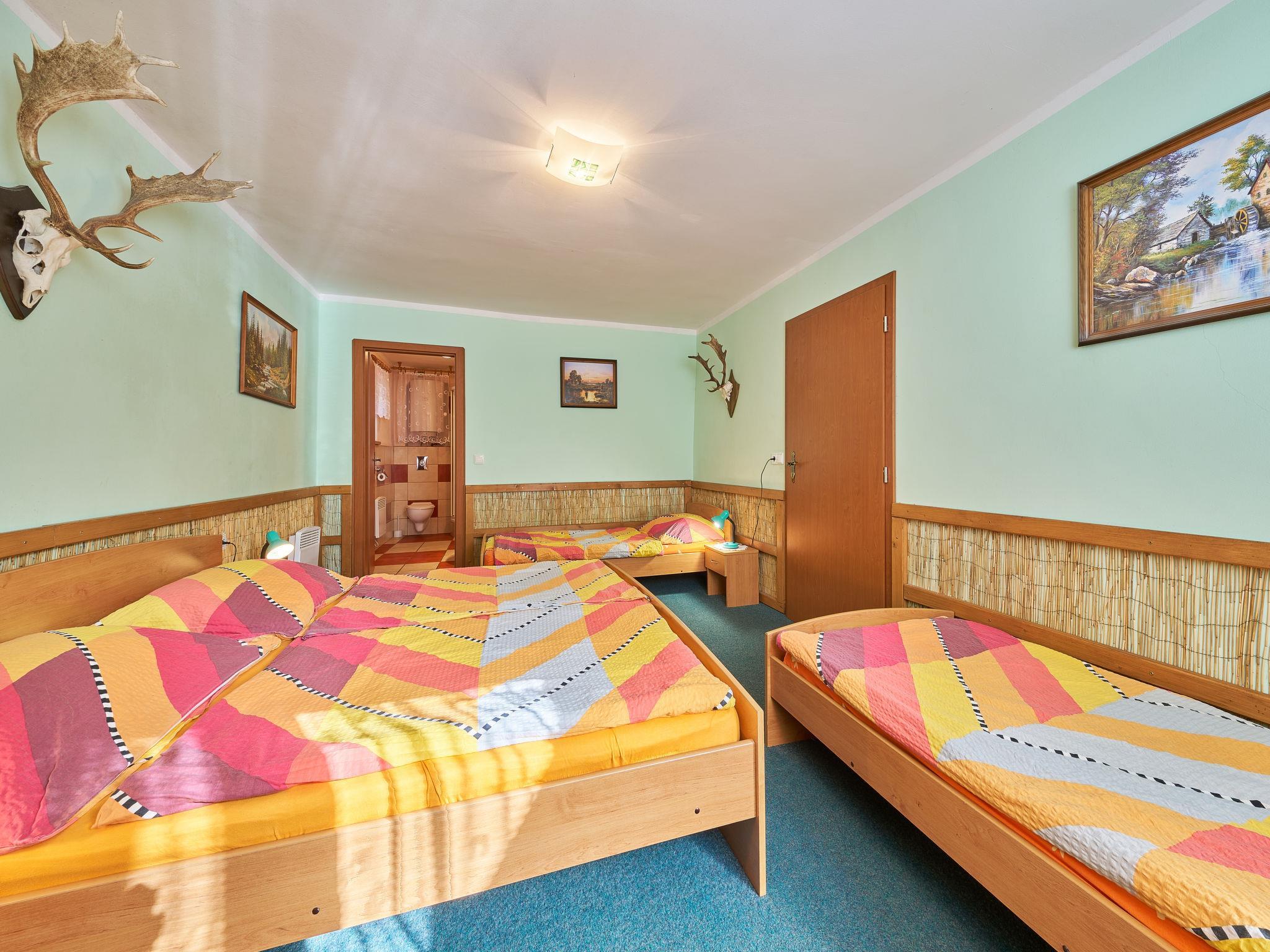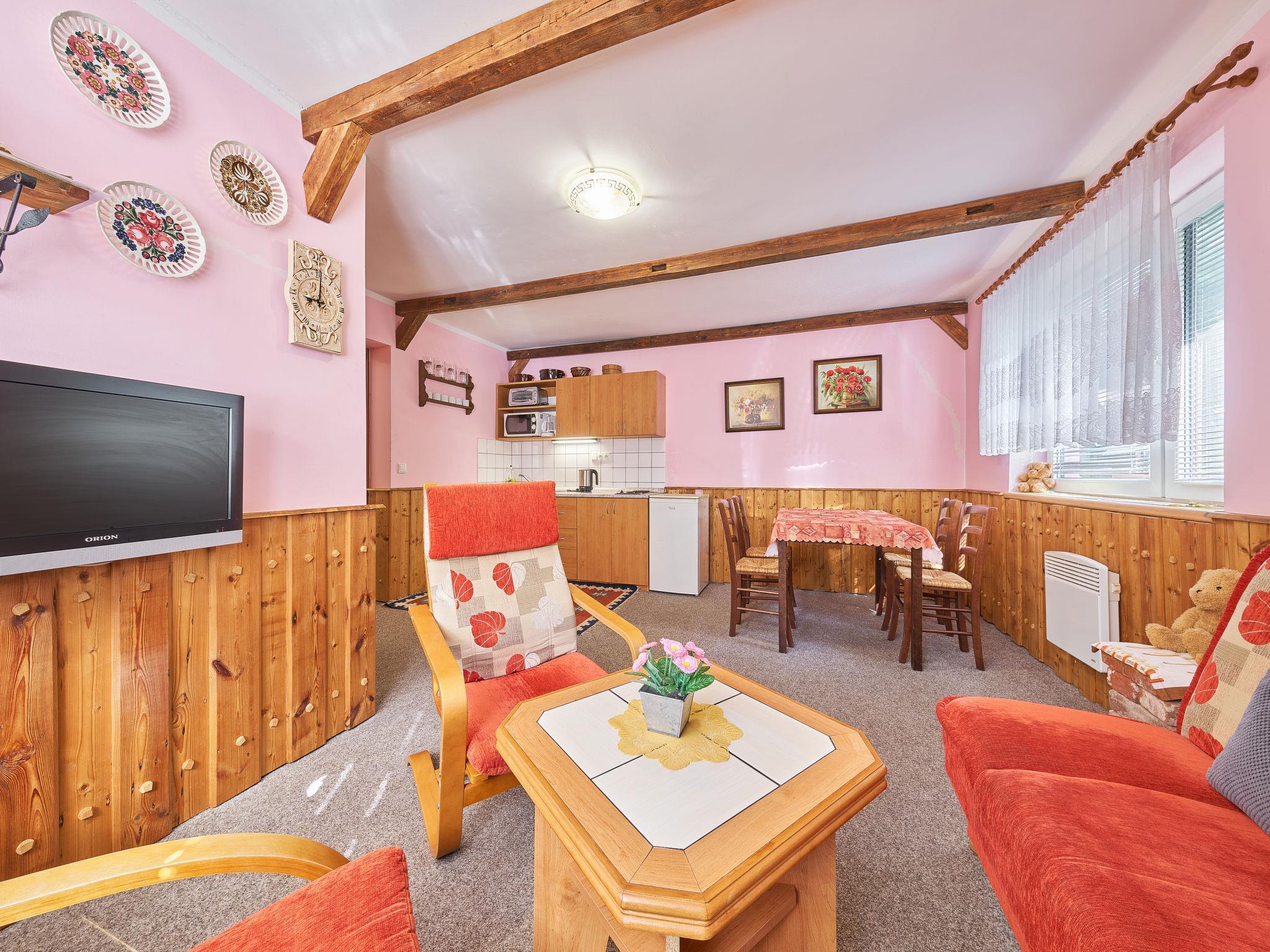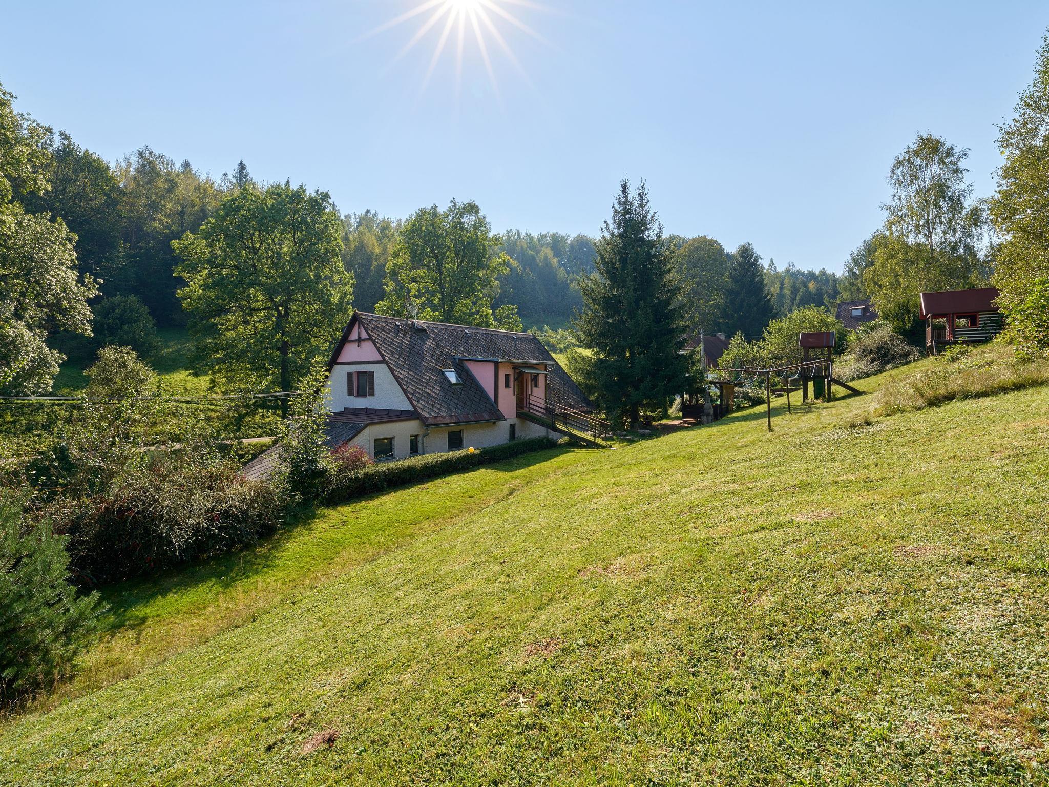 Chlívce 8 km from Hronov: Cosy country house "Chlívce u Hronova", 2 storeys, detached. Outside the resort, in a quiet, elevated position. For shared use: property 1'000 m2, swimming pool round (4,60 m diameter, seasonal availability: 01.Jul. - 31.Aug.). Arbour, garden furniture, barbecue, fireplace, barbecue house, children's playground, parking at the house. Shop 3.5 km, shopping centre 8 km, restaurant 250 m, bus stop "Chlívce" 500 m, railway station "Hronov, Cervený Kostelec" 8 km, outdoor swimming pool 9 km, indoor swimming pool 35 km, natural swimming pond 4 km. Ski lift, slopes 200 m, cross country ski track 10 m. Nearby attractions: Muzeum Aloise Jiráska/Hronov 8 km, Adršpašsko-teplické skály 17 km, Broumovské steny, Náchod 17 km, Ratiborice a Babiccino údolí 20 km, Broumov 28 km, Relaxpark Pec pod Snežkou 50 km. Well-known ski regions can easily be reached: Radvanice 10 km, Petrikovice 16 km, Mladé Buky 34 km, Janské Lázne 40 km. Well-known lakes can easily be reached: vodní nádrž Rozkoš 25 m. Children's house in the garden. It is possible to arrange meals in a private club, which is at a distance of 250 m (on request). This cottage can be rented as a whole house or separately as 4 fully equipped apartments in the low season.