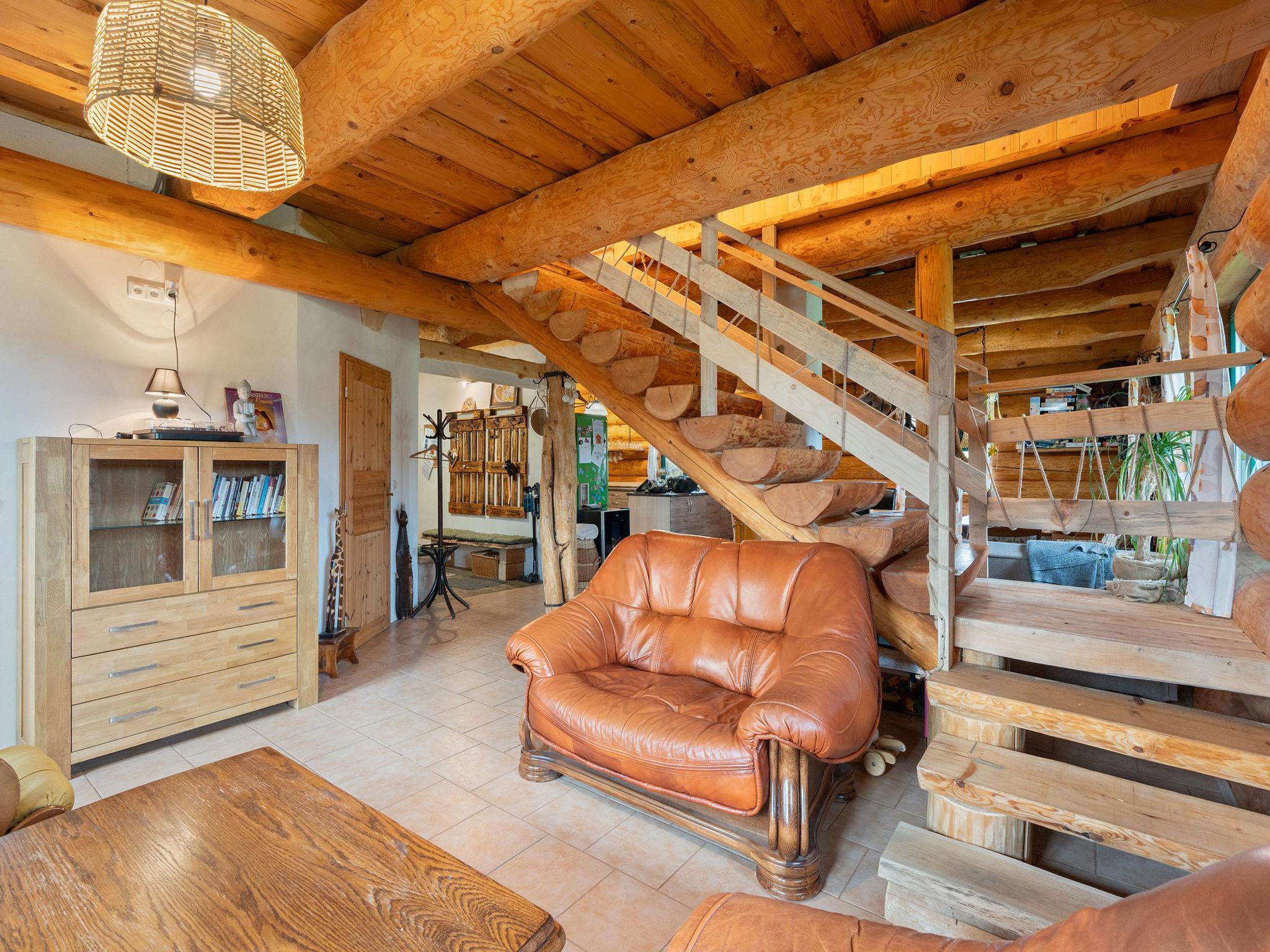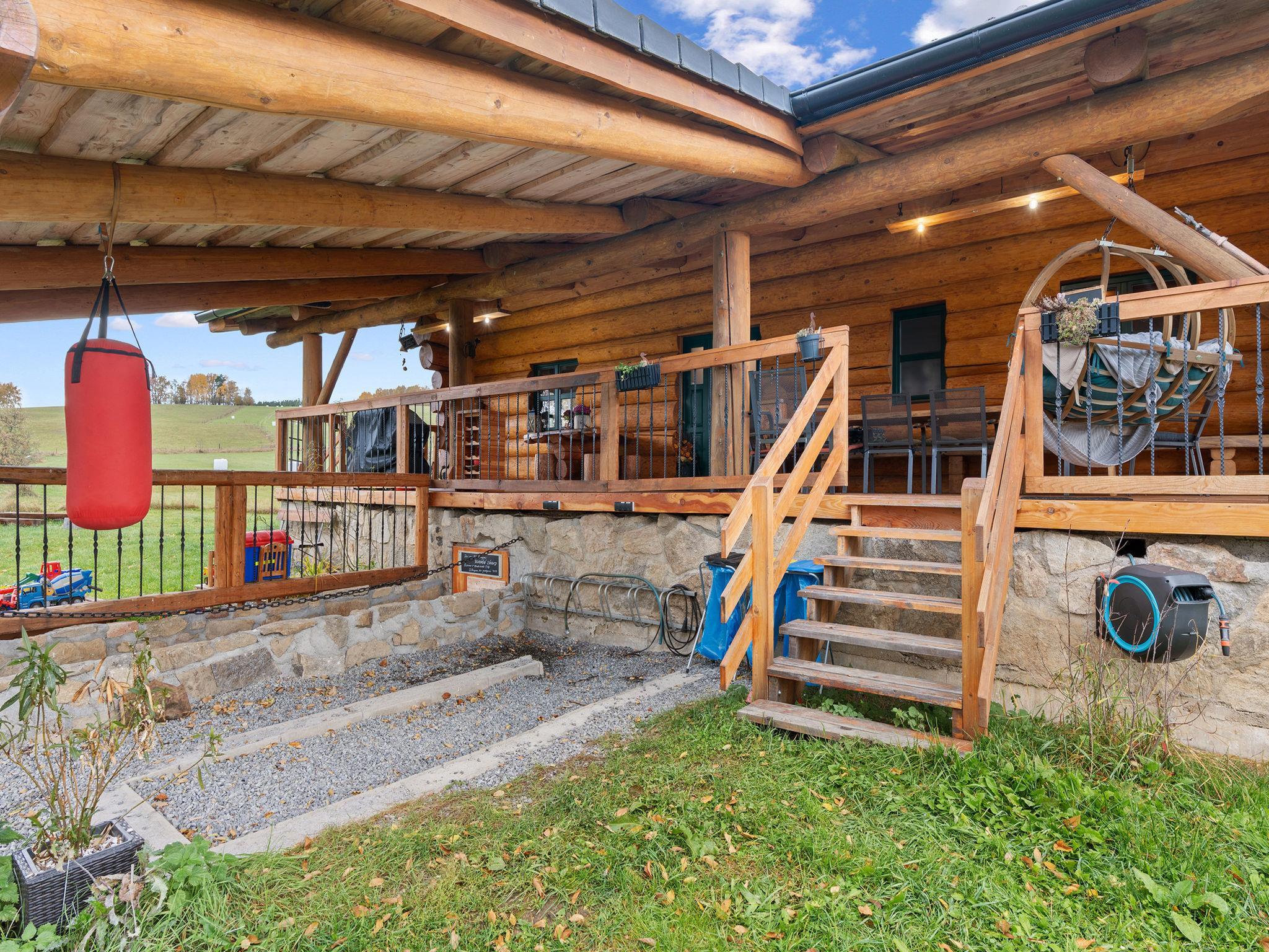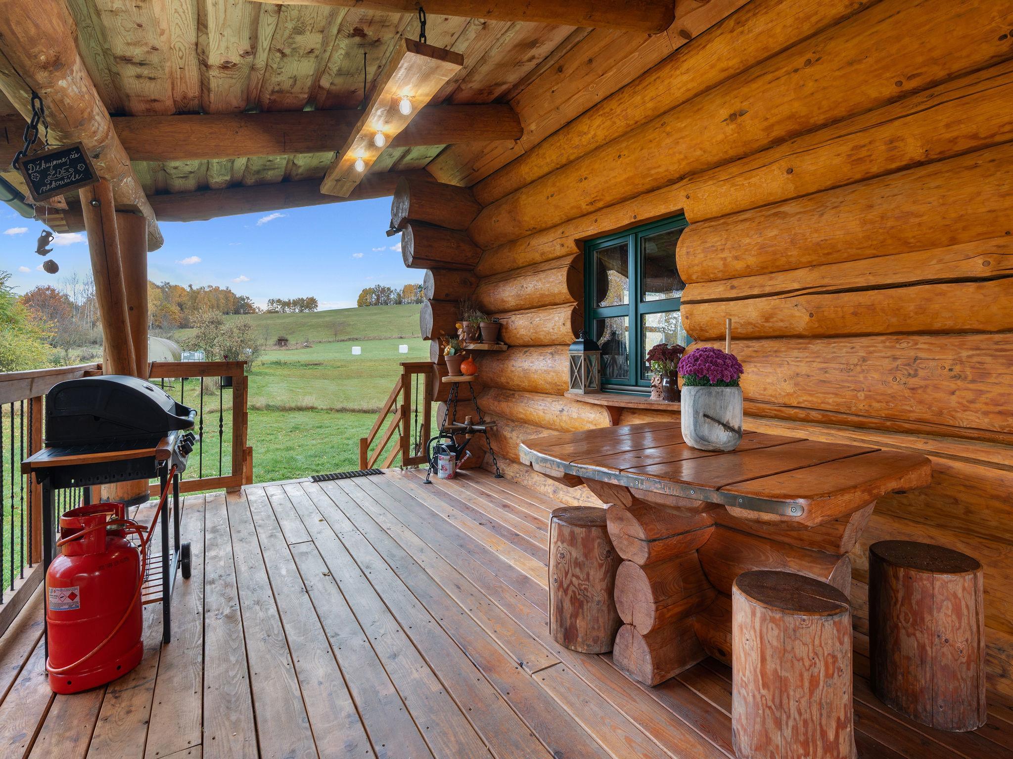 Beautiful, comfortable timber house "Srub Pohodár". In a quiet position. Private: property (fenced), large garden. Tennis, badminton, patio, terrace, garden furniture, barbecue (swing, sandbox), parking (for 4 cars) at the house. Grocery 2 km, restaurant 3 km, café 3 km, bus stop "Benešov nad Cernou, Dluhošte" 920 m, railway station "Kaplice" 13 km. Nearby attractions: Benešov nad Cernou 4.5 km, Kaplice 8 km, Ceský Krumlov 30 km. Well-known ski regions can easily be reached: Kozí Plán 17 km. Well-known lakes can easily be reached: Kanclérský rybnik 2 km. Hiking paths: Vysoký kámen 1 km, Rozhledna Hradište 5 km, Prales Hojná Voda 18 km.