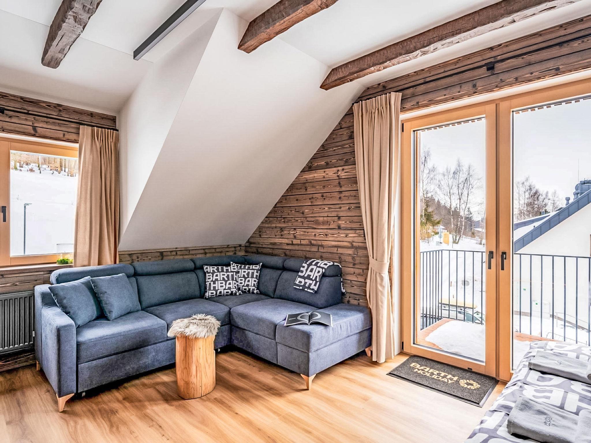 "Dolní Morava", 1-room apartment 45 m2 on 1st floor. Cosy and wooden furniture furnishings: entrance hall. Living/sleeping room with 1 x 2 bunk beds, 1 double bed and TV. Exit to the balcony. Kitchenette (oven, dishwasher, 4 ceramic glass hob hotplates, kettle, microwave, electric coffee machine) with dining table. Shower/WC. Electric heating. Balcony. Balcony furniture. Facilities: Internet (WiFi, free). Parking. Please note: suitable for families. Non-smokers only.