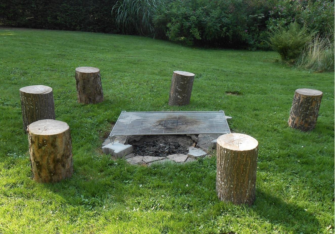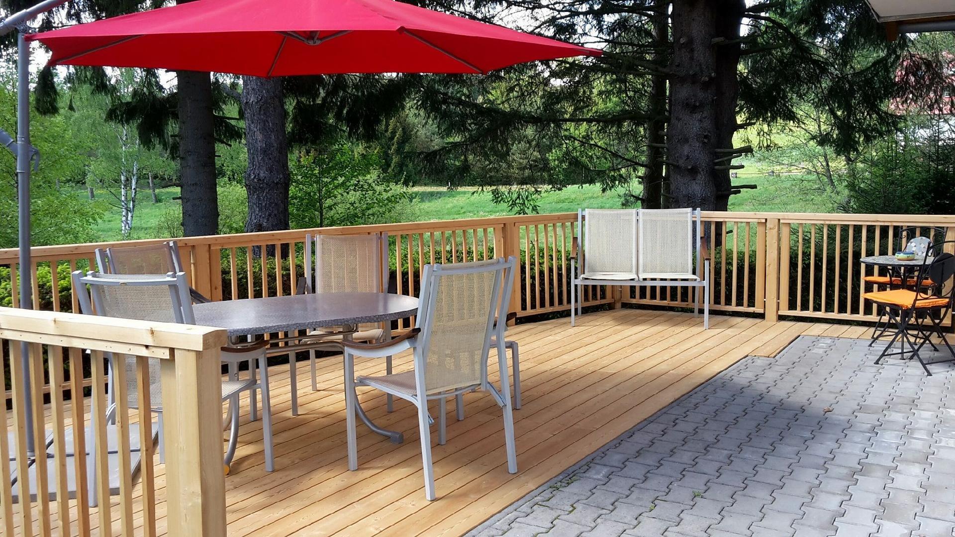 in 2018, a 22 m² wooden terrace with railings was added on the lake side, which offers you a great view of the lake and brings you even closer to it. An eight-piece garden set (four armchairs, 1x 2-seater bench, stool, table & swing umbrella), as well as a five-piece mosaic seating group consisting of two armchairs with cushions and a table, are placed on this area. The remaining space would also allow additional sun loungers to be placed there, which are also provided for your use. There is also a wooden settee outside, consisting of two benches with cushions, a table and parasol. At the back of the house there is an open fireplace with a barbecue grill. Rustic tree trunks serve as seating. And to explore the lake from the water, or to extend the range of leisure and fun activities, the house also has a rowing boat and a kayak that is easy for children to use. You are responsible for the safe and proper use of the boat. Please also note that lighting a fire on the lakeshore is prohibited.