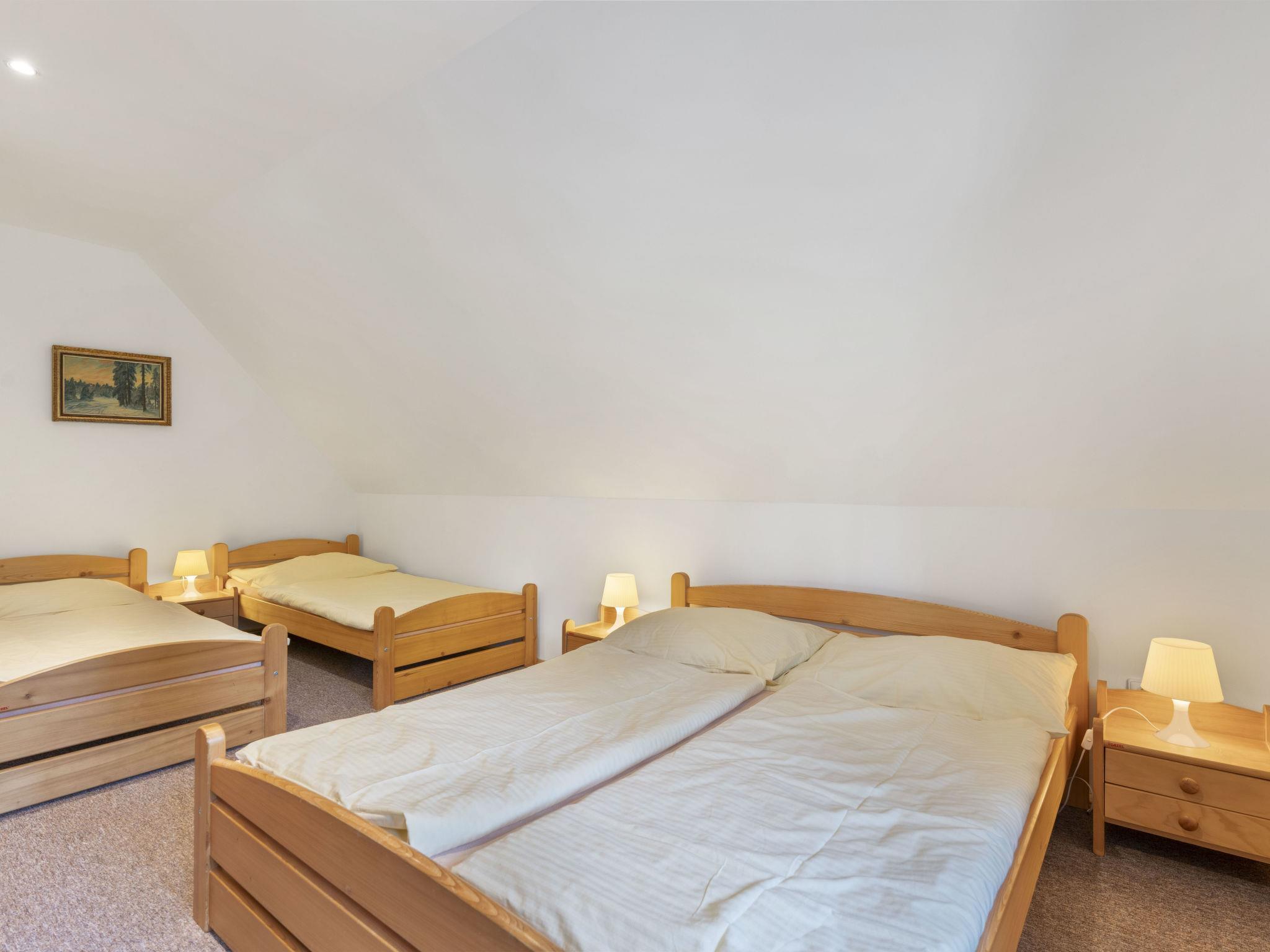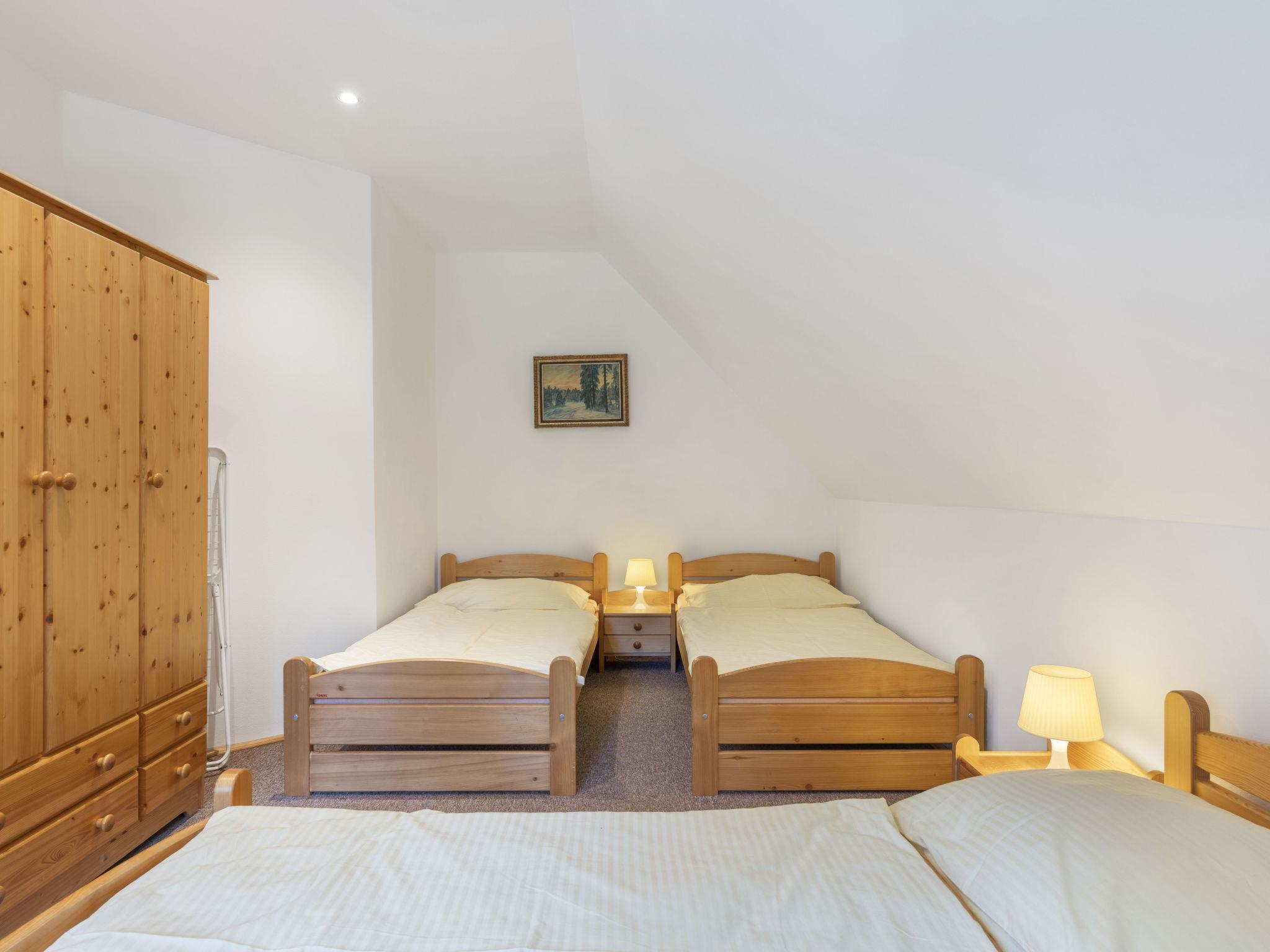 5-room chalet 400 m2 on 2 levels. Spacious and bright, partly with sloping ceilings, very beautiful and tasteful furnishings: living/dining room with dining table, kitchen corner and satellite TV. 1 room with 2 beds and 1 double bed. Living/dining room with dining table and satellite TV. 1 room with 2 beds and 1 x 2 bunk beds, 1 double bed. Kitchenette (2 ceramic glass hob hotplates, kettle, microwave). 2 showers/WC. Upper floor: large living/dining room with 1 sofabed, dining table, kitchen corner and satellite TV. 1 room with 2 beds and 1 double bed. Living/dining room with 1 sofabed, dining table, kitchen corner and satellite TV. 1 room with 2 beds and 1 double bed. 1 room with 1 sofabed and 1 x 2 bunk beds, 1 double bed, dining table, kitchen corner and satellite TV. 3 showers/WC. Large terrace, patio, lawn. Terrace furniture, barbecue (portable). View of the garden and the countryside. Facilities: children's high chair, baby cot (extra). Internet (WiFi, free). Please note: suitable for families. Non-smoking house.