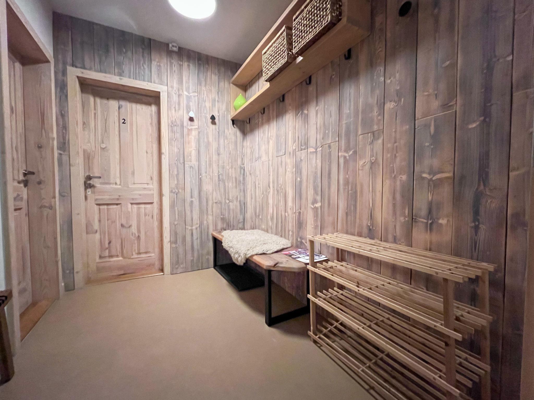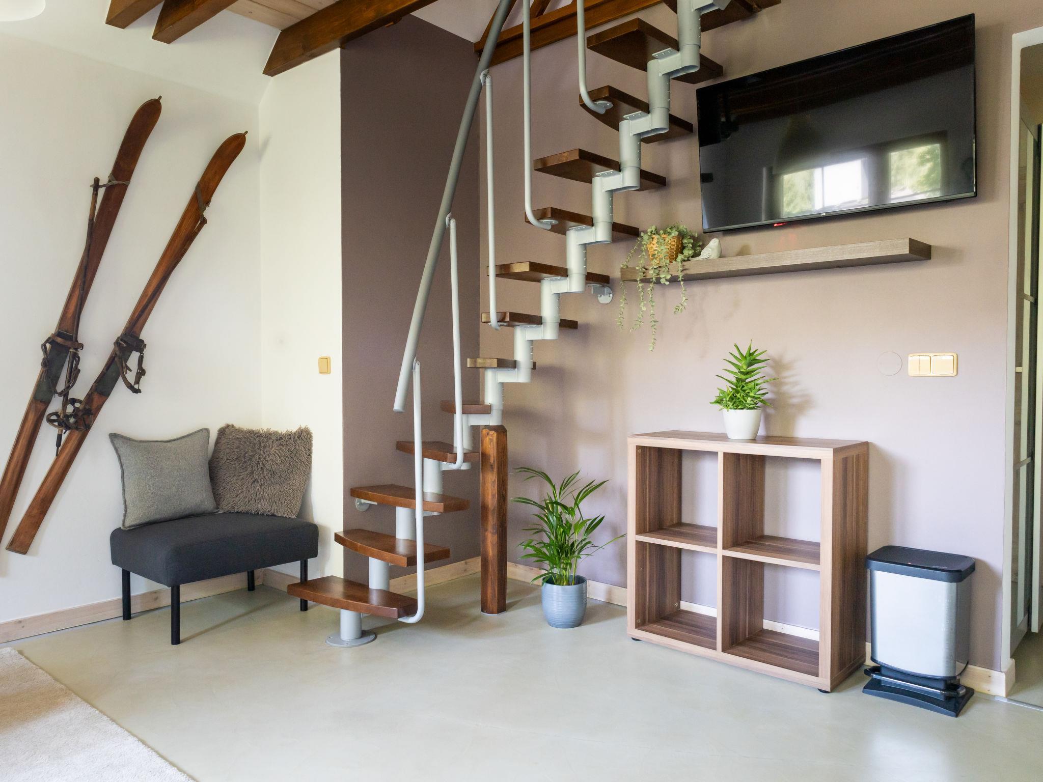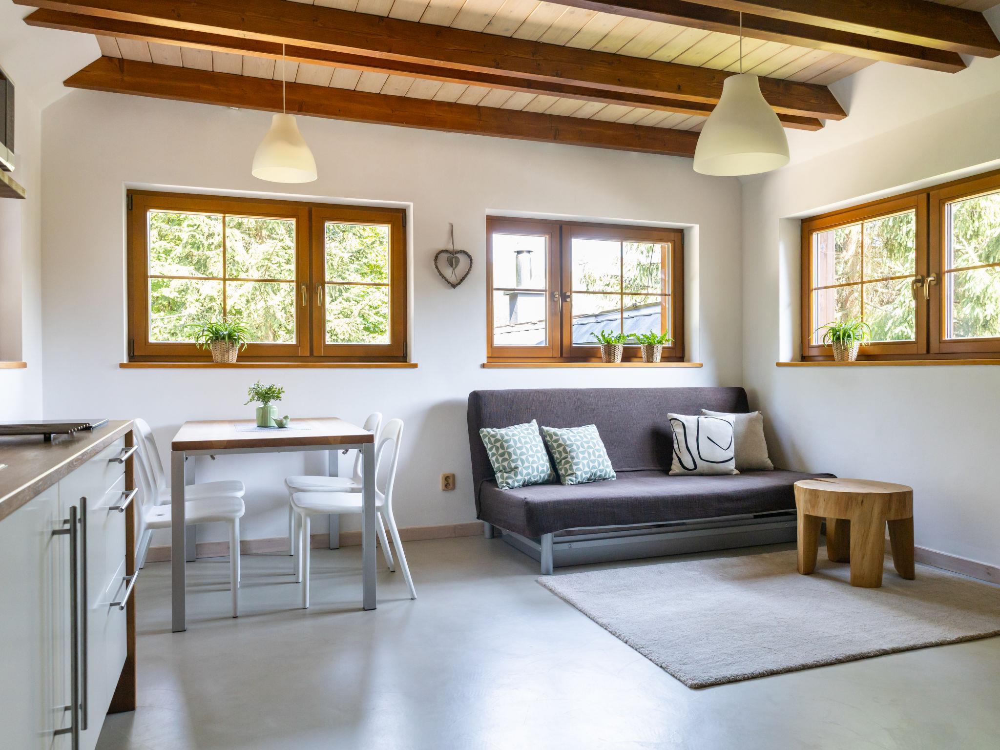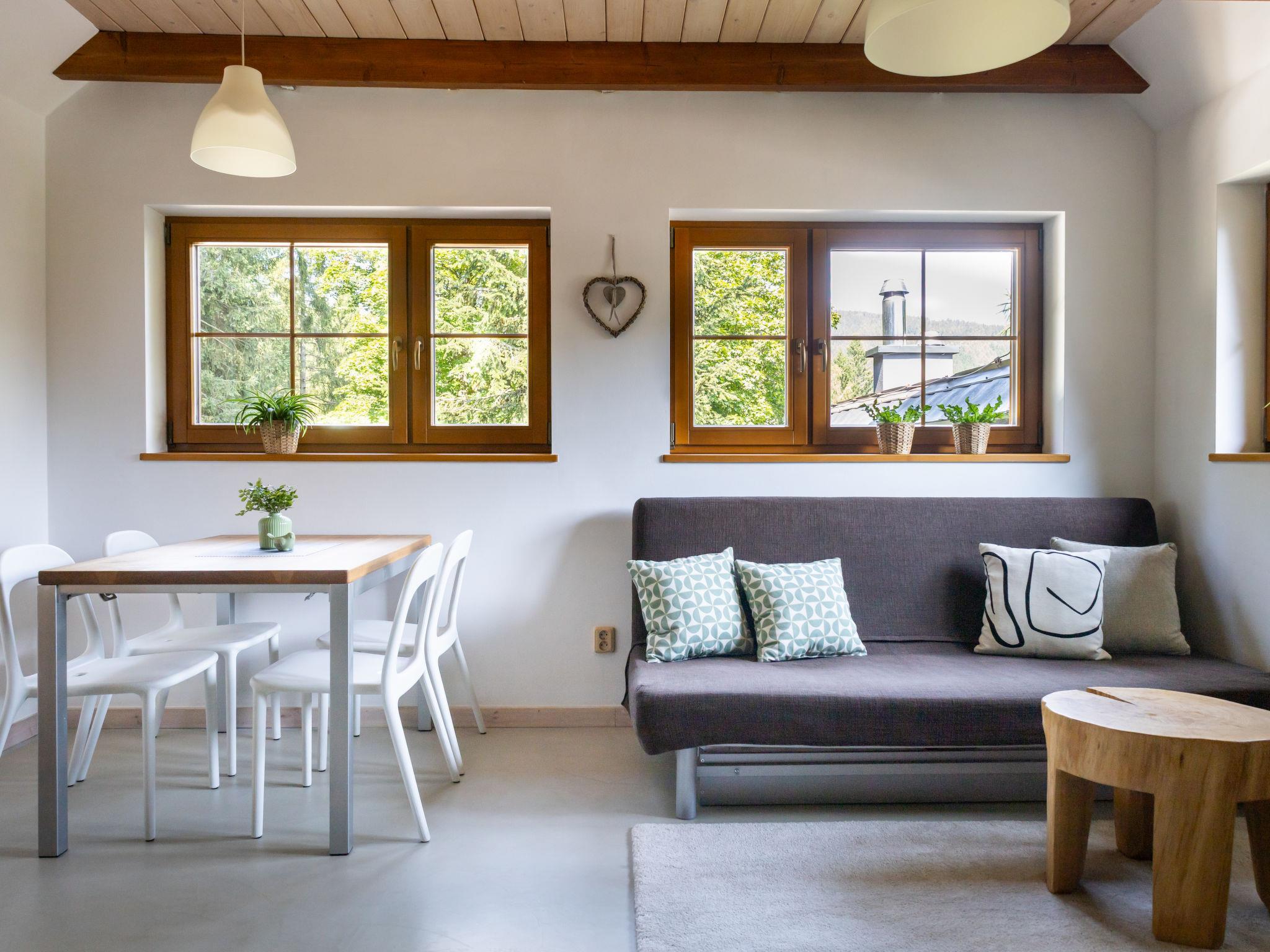 "HUT 1", 2-room apartment 43 m2. Very beautiful furnishings: open living/dining room with 1 sofabed, dining table and TV. Kitchenette (2 ceramic glass hob hotplates, toaster, kettle, microwave, electric coffee machine). Shower/WC. Heating. Upper floor: (spiral staircase) mezzanine with sloping ceilings with 4 beds. View of the mountains, the garden and the forest. Facilities: children's high chair, hair dryer. Internet (WiFi, free). Please note: suitable for families. Non-smoking house.