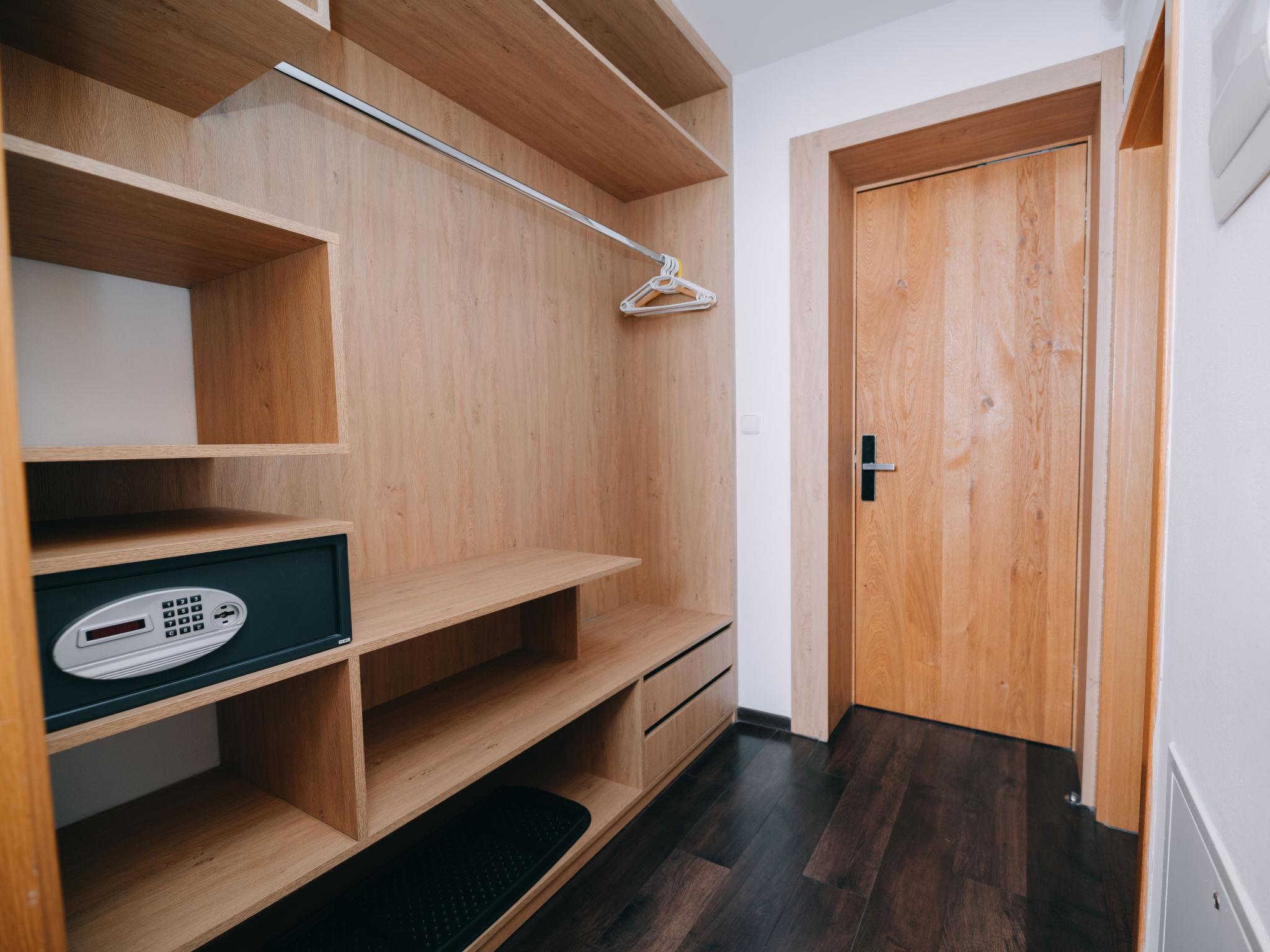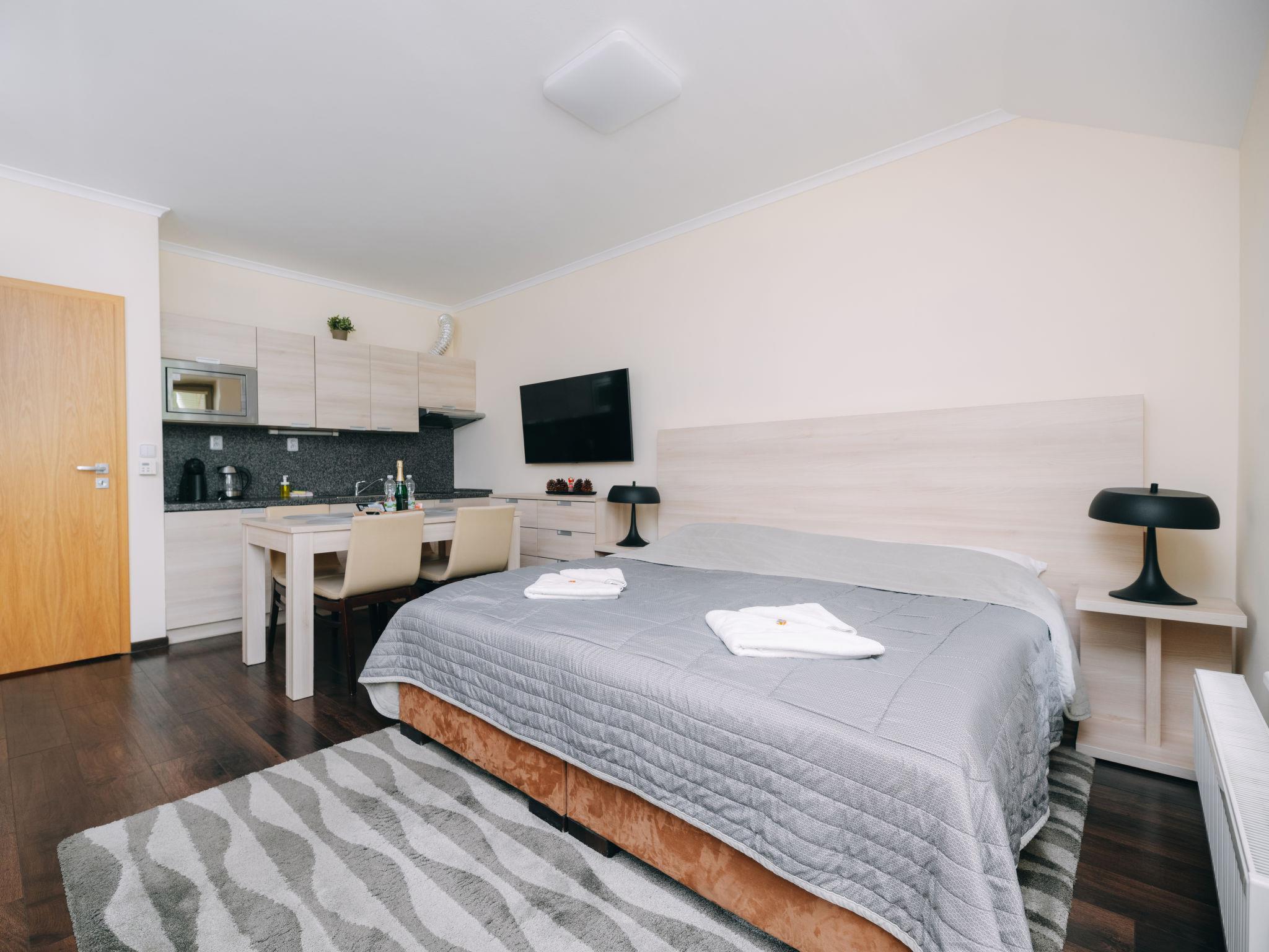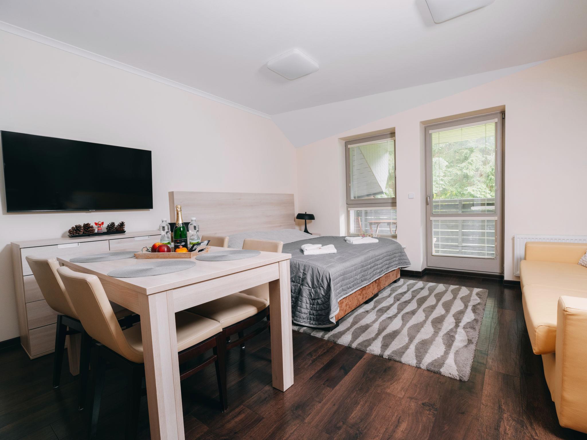 "Harrachov Resident", 1-room studio 38 m2 on 1st floor. Modern and cosy furnishings: living/sleeping room with 1 double sofabed, 1 double bed and TV. Kitchenette (2 ceramic glass hob hotplates, kettle, microwave, electric coffee machine, Capsules for coffee machine (Dolce Gusto)) with dining table. Shower/WC. Heating. Large balcony. Balcony furniture, box-room. View of the forest. Facilities: Internet (WiFi, free). Parking space n 206. Please note: suitable for families. Non-smokers only.