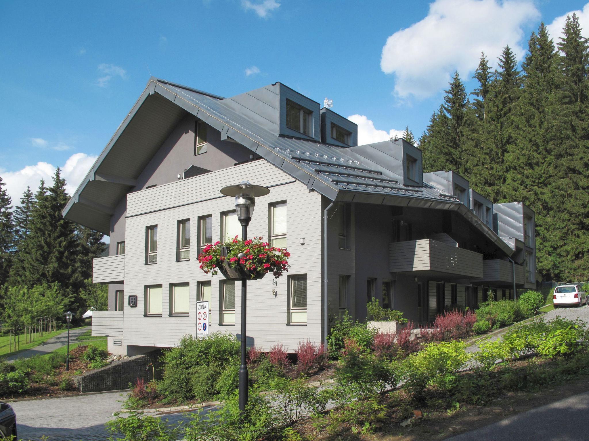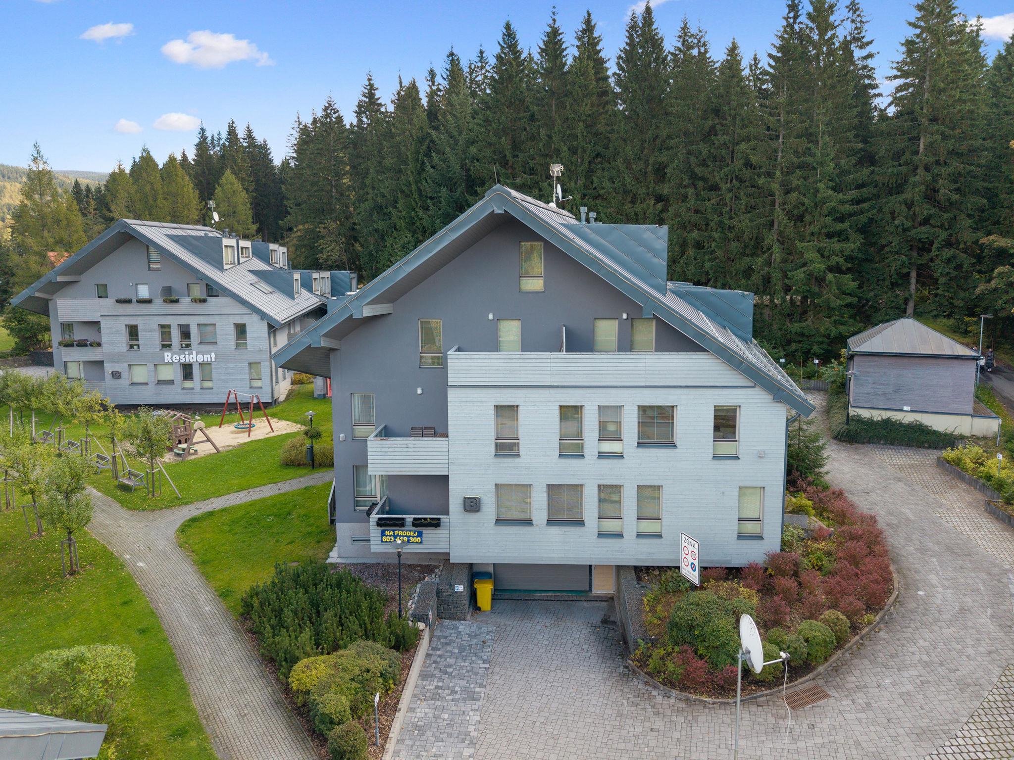 Modern residence "Resident Harrachov B", 650 m a.s.l., built in 2013. 500 m from the centre of Harrachov, 50 m from the edge of the forest, 700 m from the skiing area. For shared use: children's playground (slide, swing). Shop 300 m, supermarket 500 m, restaurant 300 m, bus stop "Harrachov U Motejlku" 300 m, railway station "Harrachov, Mýtiny" 2 km, outdoor swimming pool, indoor swimming pool 700 m. Tennis 2 km, indoor tennis centre 2 km, ski lift 50 m, chair lift, slopes, ski rental 700 m, ski bus stop 50 m, ski school, children's ski school 700 m. Nearby attractions: Bobová dráha 300 m, Mumlavský vodopád 2.5 km, Korenov 8 km, Jizerka 15 km, Jablonec nad Nisou 28 km, Liberec, Ješted 40 km, Termy Cieplickie (Pl) 30 km. Well-known ski regions can easily be reached: Harrachov 700 m, Príchovice 10 km, Rokytnice nad Jizerou 20 km. Hiking paths: Western City(Pl) 40 km, Karpacz Wang,Park miniatury Kowary (Pl) 44 km, Giganteria Piechowice 23km, Dinopark(Pl) 15 m.