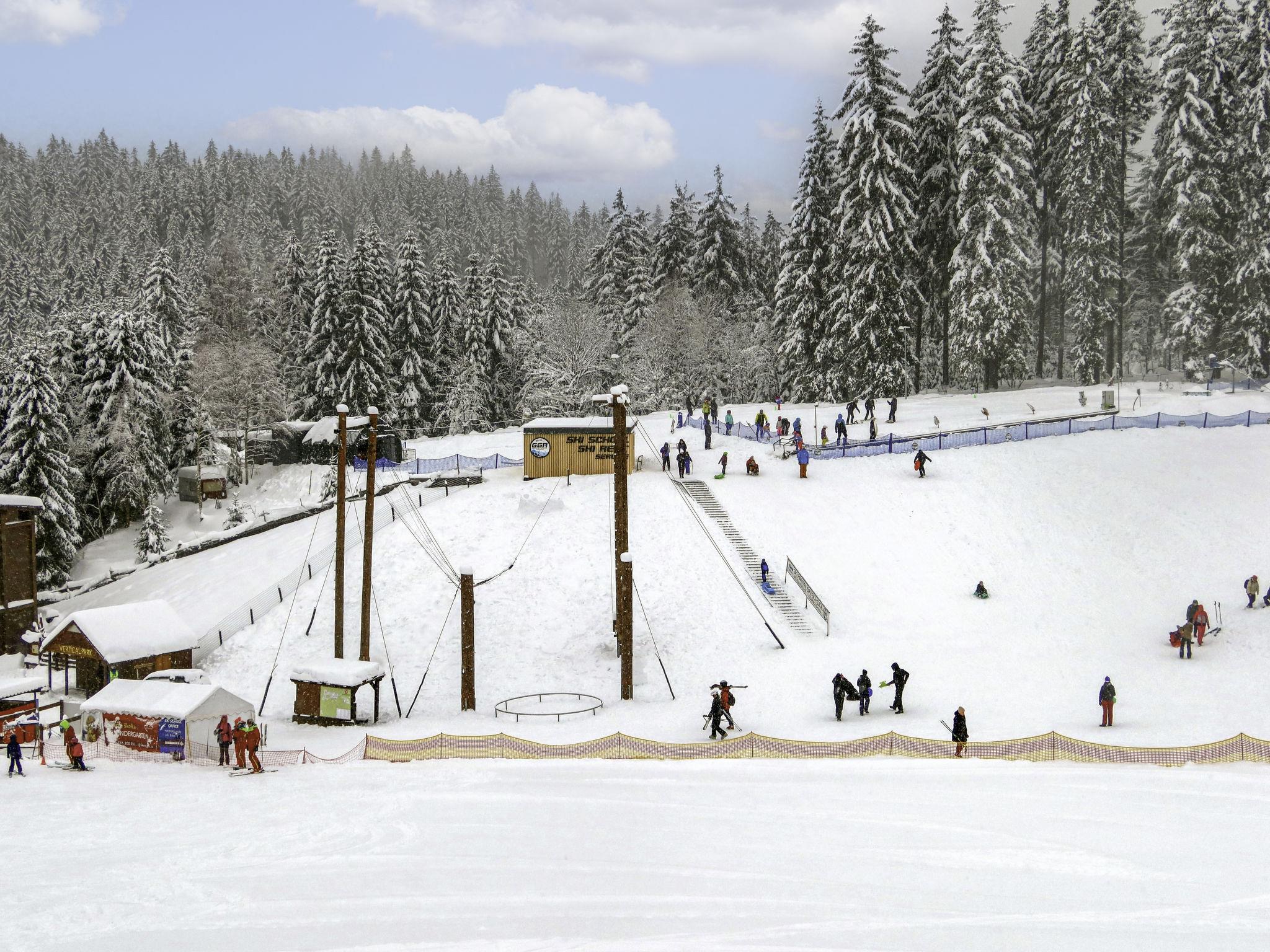 Harrachov: Modern, cosy apartment block "Certovka", 5 storeys. In the centre of Harrachov, 200 m from the skiing area. In the house: lift, central heating system. Single garage. Supermarket 500 m, restaurant, bar, café 80 m, bus stop "Harrachov,Centrum" 100 m, railway station "Harrachov" 4 km. Golf course (9 hole) 4 km, cable car, ski rental 200 m, ski bus stop 100 m, ski school, children's playground 200 m. Nearby attractions: Ski muzeum, skokanské mustky, Šindelka 1.2 km, Rybárna 2 km, Hornické muzeum 2.5 km, Mumlavské vodopády 3 km, Dvoracky 10 km, Vosecká bouda 12 km, pramen Labe 13 km, Dinopark (PL) 14 km, Termy Cieplickie (PL) 30 km. Well-known ski regions can easily be reached: Harrachov 500 m, Hilbert 300 m, Rokytnice nad/Jiz 20 km. Hiking paths: Western City Karpacz(PL) 40 km, Park miniatury Kowary, Karpacz (PL) 40 km, Giganteria Piechowice(PL) 23 km. The keys‘ handover takes place by the agency Interhome Harrachov.