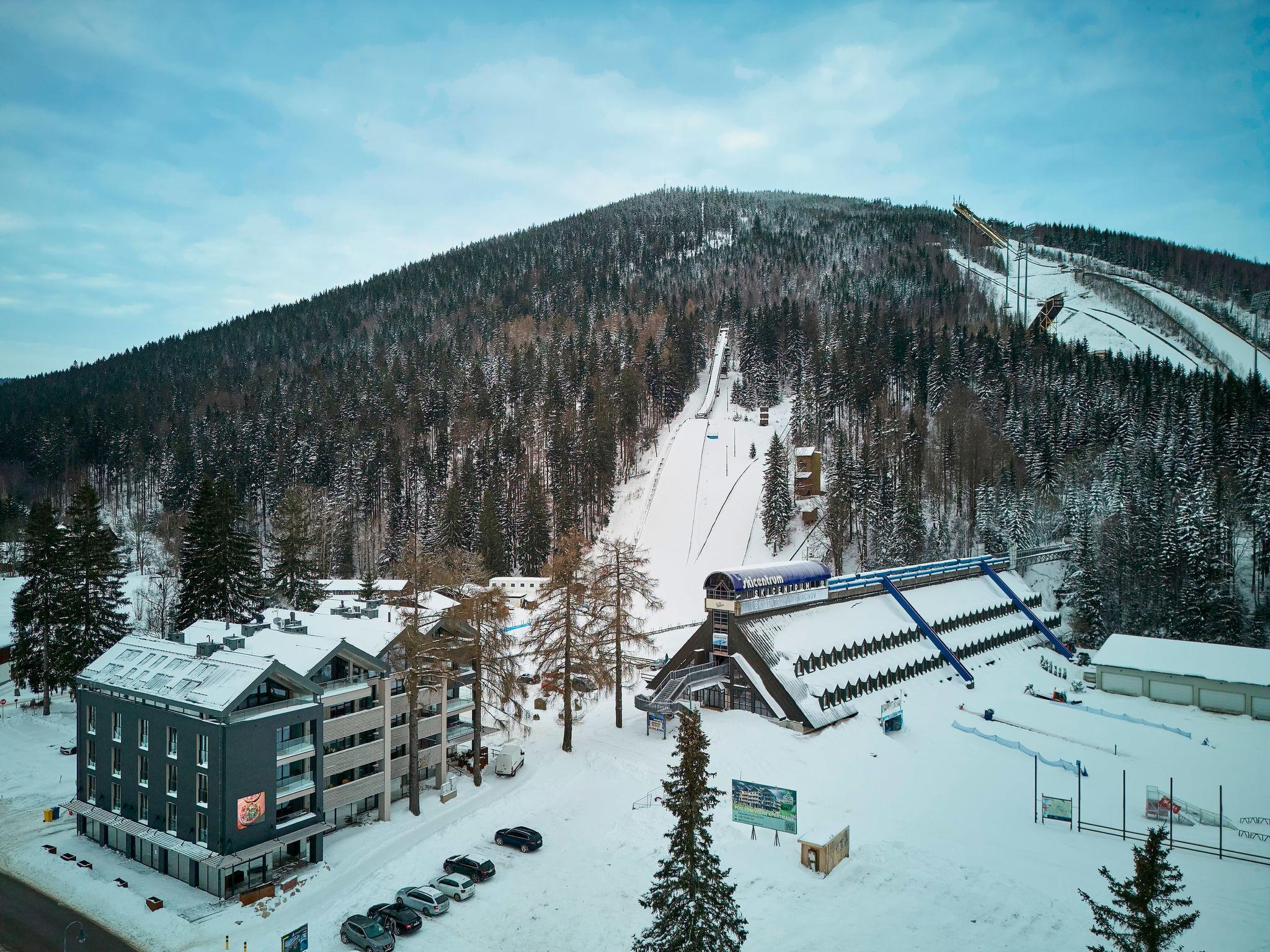 Modern residence. 500 m from the centre of Harrachov, in a quiet, sunny position, 600 m from the edge of the forest, 600 m from the skiing area. In the house: lift. Grocery, restaurant 70 m, bus stop "Harrachov, aut. Nádr." 300 m, railway station "Harrachov" 3.5 km, outdoor swimming pool 2 km, thermal baths "Thermy Cieplickie PL" 30 km. Golf course (9 hole) 4.5 km, tennis 2 km, indoor tennis centre 2 km, minigolf, chair lift, slopes, ski rental, ski school, children's ski school 600 m, cross country ski track 100 m. Nearby attractions: Expozice Šindelka 400 m, Hornické muzeum 1 km, Mumlavský vodopád, Bobová dráha 1.7 km, Korenov 8 km, Jizerka 15 km, Jablonec nad Nisou 29 km, Termy Cieplickie (PL) 30 km, Liberec 35 km, Ješted 40 km. Well-known ski regions can easily be reached: Harrachov 600 m, Zákoutí 2 km, Rýžovište 3 km, Príchovice 10 km, Rokytnice nad Jizerou 15 km. Hiking paths: Western City Karpacz(Pl) 40 km, Park miniatury Kowary44km,Karpacz (Pl) 39 km, Giganteria Piechowice(Pl) 23 km.