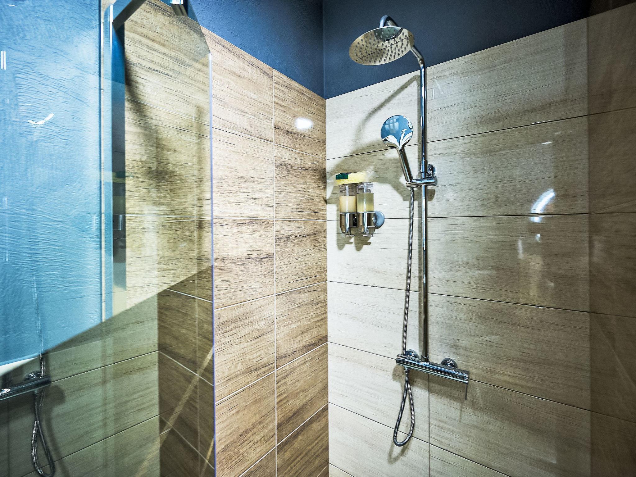 1-room studio 28 m2, on the ground floor. Comfortable and modern furnishings: 1 room with 1 double bed and TV. Small kitchenette (dishwasher, 2 ceramic glass hob hotplates, kettle, microwave, freezer, electric coffee machine) with dining table. Shower/WC. Heating. Small terrace. Facilities: hair dryer. Internet (WiFi, free). Please note: non-smokers only. Smoke alarm.