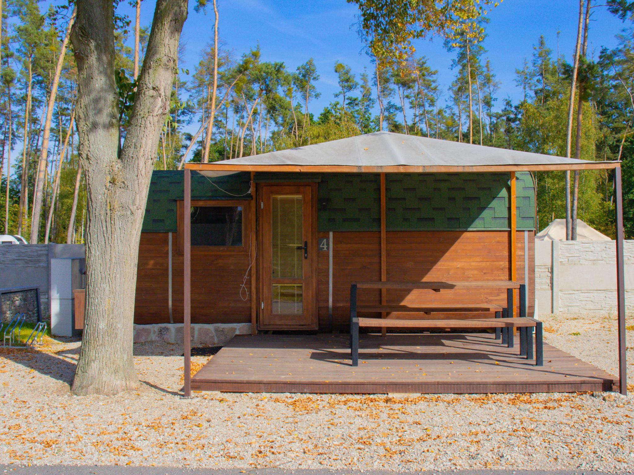 Child friendly holiday village "Kemp Stríbrný rybník". 25 houses in the resort. In the district of Malšova Lhota, 5 km from the centre of Hradec Králové, along the wooded area, on the lake. For shared use: property. Table tennis, boccia (extra), beach volleyball, arbour, barbecue, fireplace, children's playground, bathing jetty. In the complex: reception, restaurant, bar, bistro, playroom, washing machine (for shared use, extra), bicycle rental. Parking (extra) on the premises. Bus stop "Stríbrný rybník" 700 m, railway station "Blešno" 5 km, sandy beach 50 m, bathing lake "50". Sports harbour, minigolf, sports centre, walking paths from the house, cycle lane, fishing possibilities 50 m. Nearby attractions: Adventure park Firmsport, letní kino, tutistický vlácek do lesa, Stezka siluet, Rytírské hradište 3 km, Park Na Vetvi 3 km, Obory se zverí 4.2 km, Obrí akvárium, Botanická zahrada 4.7 km. Hiking paths: Pohádková, Vodnická stezka 6 km, Planetárium, planetární stezka 8.4 km, Zoopark Stežery, Rozhledna Milír 15 km. Please note: entertainment in the season. Suitable for families. Fishing [permit required]. The photograph shows a typical example.