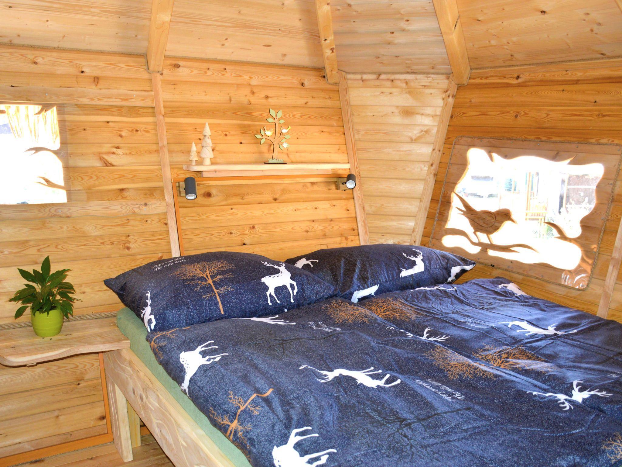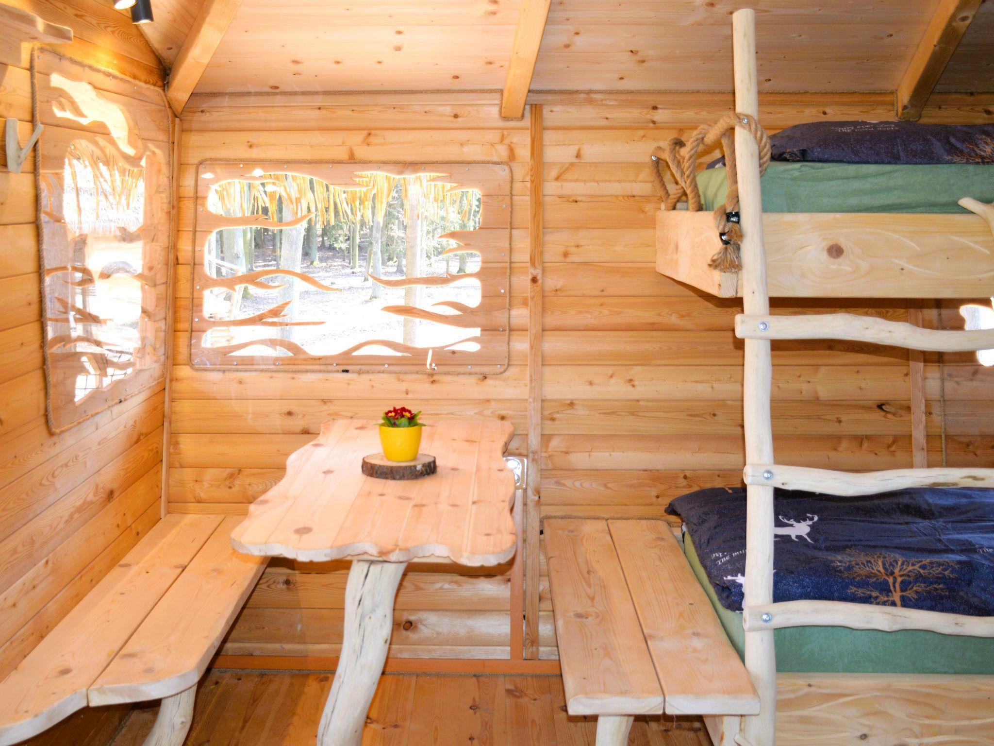 "Treehouse 2", 1-room cottage. Cosy furnishings: living/sleeping room with 1 x 2 bunk beds, 1 double bed. Small kitchenette). Very beautiful view of the forest. Facilities: Internet (WiFi, free). Please note: fridge without freezer, non-smoking house. There is NO WATER IN THE HOUSE - a tap with drinking water is located nearby. Toilet nearby. Shower for a fee.